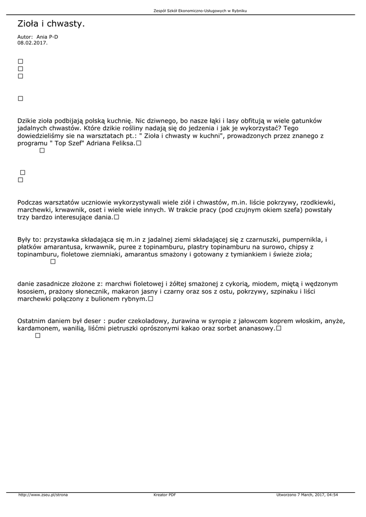 Zespół Szkół Ekonomiczno-Usługowych w Rybniku Zioła i chwasty. Autor: Ania P-D 08.02.2017. Dzikie zioła podbijają polską kuchnię. Nic dziwnego, bo nasze łąki i lasy obfitują w wiele gatunków jadalnych chwastów. Które dzikie rośliny nadają się do jedzenia i jak je wykorzystać? Tego dowiedzieliśmy sie na warsztatach pt.: " Zioła i chwasty w kuchni", prowadzonych przez znanego z programu " Top Szef" Adriana Feliksa. Podczas warsztatów uczniowie wykorzystywali wiele ziół i chwastów, m.in. liście pokrzywy, rzodkiewki, marchewki, krwawnik, oset i wiele wiele innych. W trakcie pracy (pod czujnym okiem szefa) powstały trzy bardzo interesujące dania. Były to: przystawka składająca się m.in z jadalnej ziemi składającej się z czarnuszki, pumpernikla, i płatków amarantusa, krwawnik, puree z topinamburu, plastry topinamburu na surowo, chipsy z topinamburu, fioletowe ziemniaki, amarantus smażony i gotowany z tymiankiem i świeże zioła; danie zasadnicze złożone z: marchwi fioletowej i żółtej smażonej z cykorią, miodem, miętą i wędzonym łososiem, prażony słonecznik, makaron jasny i czarny oraz sos z ostu, pokrzywy, szpinaku i liści marchewki połączony z bulionem rybnym. Ostatnim daniem był deser : puder czekoladowy, żurawina w syropie z jałowcem koprem włoskim, anyże, kardamonem, wanilią, liśćmi pietruszki oprószonymi kakao oraz sorbet ananasowy. http://www.zseu.pl/strona Kreator PDF Utworzono 7 March, 2017, 04:54