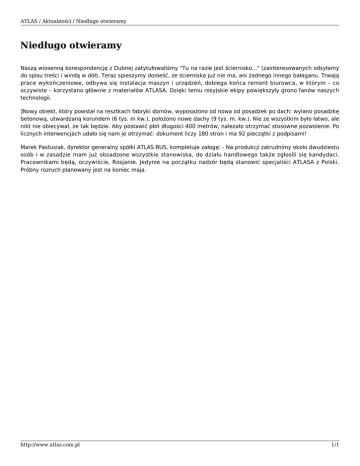 ATLAS / Aktualności / Niedługo otwieramy Niedługo otwieramy Naszą wiosenną korespondencję z Dubnej zatytułowaliśmy "Tu na razie jest ściernisko..." (zainteresowanych odsyłamy do spisu treści i windą w dół). Teraz spieszymy donieść, że ścierniska już nie ma, ani żadnego innego bałaganu. Trwają prace wykończeniowe, odbywa się instalacja maszyn i urządzeń, dobiega końca remont biurowca, w którym – co oczywiste – korzystano głównie z materiałów ATLASA. Dzięki temu rosyjskie ekipy powiększyły grono fanów naszych technologii. ]Nowy obiekt, który powstał na resztkach fabryki domów, wyposażono od nowa od posadzek po dach: wylano posadzkę betonową, utwardzaną korundem (6 tys. m kw.), położono nowe dachy (9 tys. m. kw.). Nie ze wszystkim było łatwo, ale nikt nie obiecywał, że tak będzie. Aby postawić płot długości 400 metrów, należało otrzymać stosowne pozwolenie. Po licznych interwencjach udało się nam je otrzymać: dokument liczy 180 stron i ma 92 pieczątki z podpisami! Marek Pastusiak, dyrektor generalny spółki ATLAS RUS, kompletuje załogę: - Na produkcji zatrudnimy około dwudziestu osób i w zasadzie mam już obsadzone wszystkie stanowiska, do działu handlowego także zgłosili się kandydaci. Pracownikami będą, oczywiście, Rosjanie. Jedynie na początku nadzór będą stanowić specjaliści ATLASA z Polski. Próbny rozruch planowany jest na koniec maja. http://www.atlas.com.pl 1/1