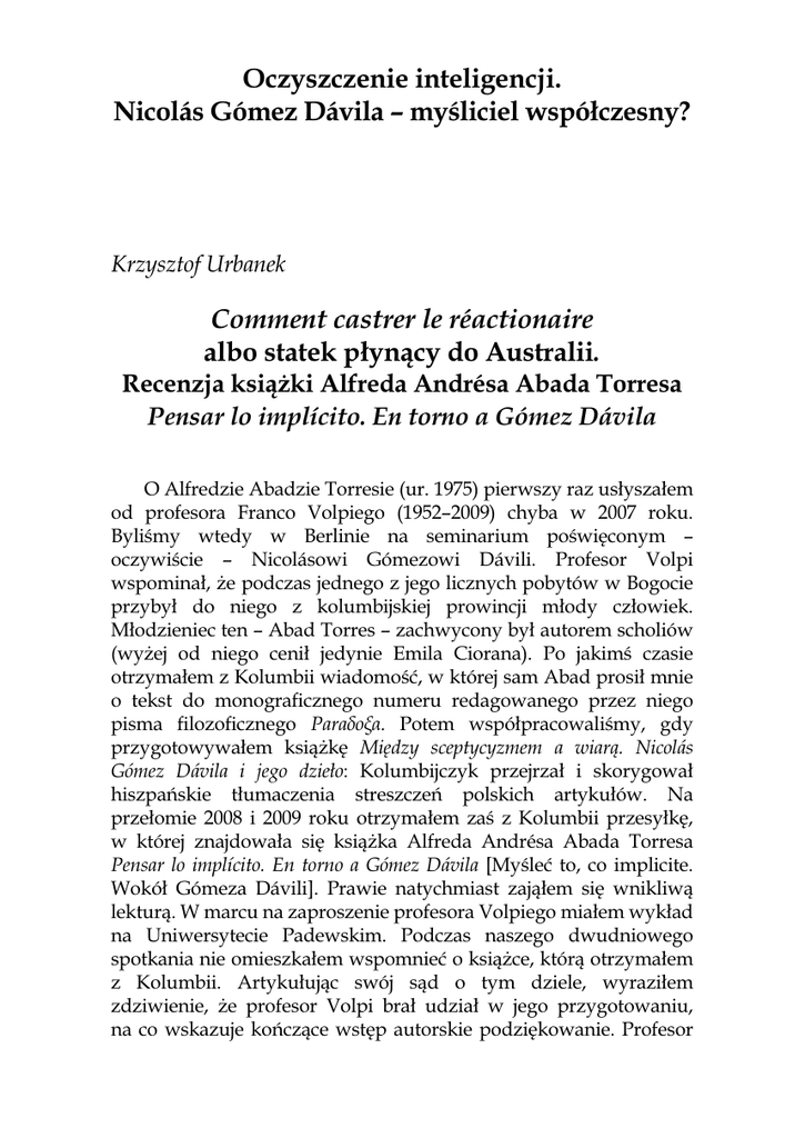 Oczyszczenie inteligencji. Nicolás Gómez Dávila – myśliciel współczesny? Krzysztof Urbanek Comment castrer le réactionaire albo statek płynący do Australii. Recenzja książki Alfreda Andrésa Abada Torresa Pensar lo implícito. En torno a Gómez Dávila O Alfredzie Abadzie Torresie (ur. 1975) pierwszy raz usłyszałem od profesora Franco Volpiego (1952–2009) chyba w 2007 roku. Byliśmy wtedy w Berlinie na seminarium poświęconym – oczywiście – Nicolásowi Gómezowi Dávili. Profesor Volpi wspominał, że podczas jednego z jego licznych pobytów w Bogocie przybył do niego z kolumbijskiej prowincji młody człowiek. Młodzieniec ten – Abad Torres – zachwycony był autorem scholiów (wyżej od niego cenił jedynie Emila Ciorana). Po jakimś czasie otrzymałem z Kolumbii wiadomość, w której sam Abad prosił mnie o tekst do monograficznego numeru redagowanego przez niego pisma filozoficznego Paraδοξα. Potem współpracowaliśmy, gdy przygotowywałem książkę Między sceptycyzmem a wiarą. Nicolás Gómez Dávila i jego dzieło: Kolumbijczyk przejrzał i skorygował hiszpańskie tłumaczenia streszczeń polskich artykułów. Na przełomie 2008 i 2009 roku otrzymałem zaś z Kolumbii przesyłkę, w której znajdowała się książka Alfreda Andrésa Abada Torresa Pensar lo implícito. En torno a Gómez Dávila [Myśleć to, co implicite. Wokół Gómeza Dávili]. Prawie natychmiast zająłem się wnikliwą lekturą. W marcu na zaproszenie profesora Volpiego miałem wykład na Uniwersytecie Padewskim. Podczas naszego dwudniowego spotkania nie omieszkałem wspomnieć o książce, którą otrzymałem z Kolumbii. Artykułując swój sąd o tym dziele, wyraziłem zdziwienie, że profesor Volpi brał udział w jego przygotowaniu, na co wskazuje kończące wstęp autorskie podziękowanie. Profesor 332 Krzysztof Urbanek Volpi był zaskoczony faktem umieszczenia jego nazwiska w książce i powiedział, że dzieło jest pracą magisterską Abada, którą on – Volpi – uprzednio poproszony odesłał, opatrzywszy kilkoma zdaniami komentarza. Tyle wspomnień, które – mam nadzieję – pozwolą lepiej zrozumieć, z czym mamy do czynienia. Otóż, opublikowany w październiku 2008 roku w miejscowości Pereira w Kolumbii tom jest pracą magisterską młodego kolumbijskiego naukowca.1 I jak na pracę magisterską – przynajmniej według polskich standardów – jest dziełem potężnym: liczy bowiem ok. 180 stron. Niestety, podczas mozolnej lektury o Gómezie Dávili i jego dziele nie dowiedziałem się niczego nowego poza jedną, trzeciorzędną rzeczą: w notesie jednego z wpływowych polityków kolumbijskich (Laureana Gómeza) autor scholiów figurował jako potencjalny kandydat na prezydenta republiki.2 Nie znaczy to, że w książce młodego Kolumbijczyka nie ma żadnych sensownych tez czy celnych stwierdzeń. Nie sposób bowiem nie zgodzić się na przykład z tym, że Gómez Dávila lekceważył współczesną literaturę i współczesne myślenie i że podporządkował się regułom kultury klasycznej oraz określonej koncepcji świata, według której wszystko już zostało powiedziane, nie ma nic nowego do napisania.3 Abad trafnie spostrzega, że Samotnik z Bogoty krytykował literaturę z pozycji arystokratycznych: zdaniem Gómeza Dávili prawdziwa literatura nie jest zawodem, lecz powstaje w rezultacie życia próżniaczego właściwego arystokracji. Arystokratyczny charakter dawnej literatury u autora scholiów został przeciwstawiony współczesnej wulgarności.4 Poza tym autor monografii nader celnie zauważa, że duchowe związki z najbliższym otoczeniem (Kolumbią i Ameryką Łacińską) są w twórczości bogotanina całkowicie zerwane. Ani nie ma on nic wspólnego z tradycją konserwatywną i tradycjonalistyczną Kolumbii 1 Chciałbym podkreślić, że ja recenzuję książkę, a nie pracę magisterską, która najprawdopodobniej miała swego recenzenta i recenzję. Za kształt pracy magisterskiej odpowiedzialny jest autor i promotor. Za jej publikację odpowiada przede wszystkim autor i wydawca. 2 Por. Alfredo Andrés Abad Torres, Pensar lo implícito. En torno a Gómez Dávila, Pereira 2008, s. 60. 3 Por. tenże, Pensar lo implícito..., dz. cyt., s. 51. 4 Por. tamże, ss. 52–55. Comment castrer le réactionaire albo statek płynący do Australii... 333 i Ameryki Łacińskiej (scholastyka), ani nie ma on nic wspólnego z kolumbijskim duchem filozoficznym (pozytywizm, utylitaryzm, klasyczny liberalizm), który narodził się w XIX wieku.5 Abad dobitnie podsumowuje: „Wpisanie Gómeza Dávili na listę autorów kolumbijskich jest szczególnym wypadkiem aberracji taksonomii literackiej (…)”6. Co do tego rzeczywiście nie ma najmniejszych wątpliwości. Nicolás Gómez Dávila jest bowiem „Europejczykiem przerastającym tak wielu z nas w namyśle nad naszym (…) i jego dziedzictwem”.7 Abad słusznie twierdzi, że wypowiedzi autora scholiów, choć są komentarzami do dzieł innych twórców, stają się autonomiczne.8 Nie myli się, głosząc, że Gómez Dávila gardzi sentymentalizmem współczesnej filozofii, której przeciwstawia medytację grecką i chrześcijańską, a także ostrzega przed techniką, która determinuje całe życie człowieka, czyniąc je sztucznym i przepojonym instrumentalnym racjonalizmem.9 Niestety, z przykrością muszę stwierdzić, że poza tymi i kilkoma innymi fragmentami książka Alfreda Abada jest niewiele wartą próbą pozbawienia dzieła reakcjonisty najcenniejszych pierwiastków. I zapowiada to już odautorski wstęp do pracy. Oto, co mówi tam młody Kolumbijczyk: „(…) pragnę podkreślić fakt, że nie chcę manipulować myślą autora [Gómeza Dávili – dop. K.U.], jak to się zazwyczaj dzieje, gdy ktoś pragnie przekształcić idee w ideologie, w fundamentalistyczne preteksty, w odniesienia do wyznań wiary. Z myśli reakcyjnej i katolicyzmu autora zwykło się robić użytek nie ściśle filo