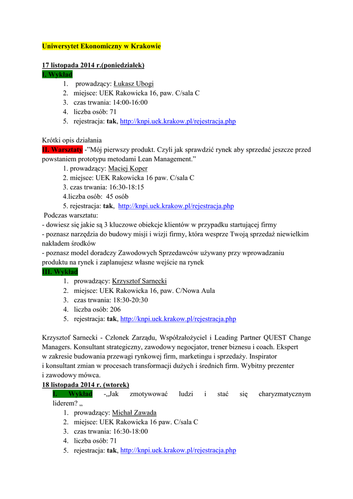 Uniwersytet Ekonomiczny w Krakowie 17 listopada 2014 r.(poniedziałek) I. Wykład 1. prowadzący: Łukasz Ubogi 2. miejsce: UEK Rakowicka 16, paw. C/sala C 3. czas trwania: 14:00-16:00 4. liczba osób: 71 5. rejestracja: tak, http://knpi.uek.krakow.pl/rejestracja.php Krótki opis działania II. Warsztaty -”Mój pierwszy produkt. Czyli jak sprawdzić rynek aby sprzedać jeszcze przed powstaniem prototypu metodami Lean Management.” 1. prowadzący: Maciej Koper 2. miejsce: UEK Rakowicka 16 paw. C/sala C 3. czas trwania: 16:30-18:15 4.liczba osób: 45 osób 5. rejestracja: tak, http://knpi.uek.krakow.pl/rejestracja.php Podczas warsztatu: - dowiesz się jakie są 3 kluczowe obiekcje klientów w przypadku startującej firmy - poznasz narzędzia do budowy misji i wizji firmy, która wesprze Twoją sprzedaŜ niewielkim nakładem środków - poznasz model doradczy Zawodowych Sprzedawców uŜywany przy wprowadzaniu produktu na rynek i zaplanujesz własne wejście na rynek III. Wykład 1. prowadzący: Krzysztof Sarnecki 2. miejsce: UEK Rakowicka 16, paw. C/Nowa Aula 3. czas trwania: 18:30-20:30 4. liczba osób: 206 5. rejestracja: tak, http://knpi.uek.krakow.pl/rejestracja.php Krzysztof Sarnecki - Członek Zarządu, WspółzałoŜyciel i Leading Partner QUEST Change Managers. Konsultant strategiczny, zawodowy negocjator, trener biznesu i coach. Ekspert w zakresie budowania przewagi rynkowej firm, marketingu i sprzedaŜy. Inspirator i konsultant zmian w procesach transformacji duŜych i średnich firm. Wybitny prezenter i zawodowy mówca. 18 listopada 2014 r. (wtorek) I. Wykład -„Jak zmotywować ludzi i stać się charyzmatycznym liderem? „ 1. prowadzący: Michał Zawada 2. miejsce: UEK Rakowicka 16 paw. C/sala C 3. czas trwania: 16:30-18:00 4. liczba osób: 71 5. rejestracja: tak, http://knpi.uek.krakow.pl/rejestracja.php Podejmujesz w swoim Ŝyciu ambitne działania? DąŜysz do realizacji rzeczy, które sobie załoŜyłeś? Chcesz motywować innych do działania? JeŜeli choć na jedno z tych pytań odpowiedziałeś twierdząco to oznacza, Ŝe powinieneś nauczyć się wykorzystywać SWOJĄ motywację wewnętrzną oraz wzbudzać ją u innych. Na tym szkoleniu dowiesz się, co tak naprawdę motywuje ludzi i jak wykorzystywać to w swoim Ŝyciu, zarówno prywatnym jak i zawodowym. Całość będzie oparta o koncepcje motywacji wewnętrznej. Jak udowodniły liczne badania naukowe jest to jedyna skuteczna motywacja. Motywacja wewnętrzna bardzo ściśle łączy się z tym co prof. Viktor E. Frankl nazwał Sensem śycia. Dopiero robiąc to, co ma dla nas sens moŜemy być w pełni zmotywowani do tych działań. II. Spotkanie- „10 porad jak rozmawiać z inwestorem” 1. prowadzący: Kamil Stanuch 2. miejsce: UEK Rakowicka 16 paw. C/Nowa Aula 3. czas trwania: 18:30-20:30 4. liczba osób: 206 5. rejestracja: tak, http://knpi.uek.krakow.pl/rejestracja.php 10 praktycznych wskazówek i porad jak rozmawiać z inwestorem: m.in. o tym dlaczego pomysł jest wart 1zł + VAT, czym róŜnią się witaminy od leków przeciwbólowych, dlaczego naleŜy spalić swój biznesplan i jak zaprezentować pomysł w 30 sekund. 19 listopada 2014 r. (środa) I. Debata „Student Idealista - czy moŜe kiedyś być bogaty?” 1. prowadzący: ks. Jacek „Wiosna” Stryczek 2. miejsce: UEK Rakowicka 16, paw. B/ sala 054 3. czas trwania: 16:30-18:00 4. liczba osób: 96 5. rejestracja: tak, http://knpi.uek.krakow.pl/rejestracja.php Ks. Jacek WIOSNA Stryczek - lider społeczny, duszpasterz akademicki i duszpasterz ludzi biznesu. Znany z nowatorskich (w tym multimedialnych) kazań i poruszających happeningów. Pomysłodawca i Prezes Stowarzyszenia WIOSNA, które realizuje projekty SZLACHETNĄ PACZKĘ i AKADEMIĘ PRZYSZŁOŚCI. W mediach znany z oryginalnych pomysłów ewangelizacyjnych, np. postawienia konfesjonału przed Galerią Krakowską, albo posypywania głów przechodniów popiołem na Rondzie Matecznego w Krakowie. II. Wykład /prezentacja 1. prowadzący: PROMIL Toastmasters 2. miejsce: UEK Rakowicka 16, paw. C/ Nowa Aula 3. czas trwania: 18:30-20:30 4. liczba osób: 206 5. rejestracja: tak, http://knpi.uek.krakow.pl/rejestracja.php Krótki opis działania 20 listopada 2014 r.(czwartek) I. Warsztaty „Capgemini Challenge: Lean Management” 1. prowadzący: Capgemini 2. miejsce: UEK Rakowicka 16/ sala 11 3. czas trwania: 15:00-18:50 4. liczba osób: 40 5. rejestracja: tak, http://knpi.uek.krakow.pl/rejestracja.php Capgemini to międzynarodowa firma zajmująca się obsługą swoich klientów w obszarach finansów, księgowości, operacji bankowych, HR oraz IT. Posiada 47 lat doświadczenia w biznesie, nasze oddziały zlokalizowane są w blisko 44 krajach, pracuje w nich łącznie 140000 pracowników II. Spotkanie 1. prowadzący: Rafał Dąbrowski 2. miejsce: UEK Rakowicka 16 paw. C/ sala F 3. czas trwania: 16:30-18:00 4. liczba osób: 119 5. rejestracja: tak, http://knpi.uek.krakow.pl/rejestracja.php III. Spotkanie- „Nowatorskie rozwiązania i konsekwencja w działaniu - czyli jak stworzyć markę na światowym poziomie, sygnowaną hasłem „made in Poland”” 1. prowadzący: Rafał Brzoska 2. miejsce: UEK Rakowicka 16 paw. C/ sala F 3. czas trwania: 18:30-20:30 4. liczba osób: 119 5. rejestracja: tak, http://knpi.uek.krakow.pl/rejestracja.php 21 listopada 2014 r.(piątek) I. Spotkanie 1. prowadzący: Beata Suchodolska 2. miejsce: UEK Rakowicka 16 paw. C/ Nowa Aula 3. czas trwania: 14:00-15:30 4. liczba osób: 206 5. rejestracja: tak, http://knpi.uek.krakow.pl/rejestracja.php II. Wykład „Jak rozwinąć firmę od 1 pracownika do 100+ w 4 lata” 1. prowadzący: Ryszard Chmura 2. miejsce: UEK Rakowicka 16 3. czas trwania: 4. liczba osób: 206 5. rejestracja: tak, http://knpi.uek.krakow.pl/rejestracja.php Jak zacząć rozkręcać firmę, pozyskać nowych klientów, pracowników i wspólników oraz znacznie pomnoŜyć swoje dochody w 4 lata? Podczas wykładu dowiesz się jak szybko i skutecznie rozwinąć swój