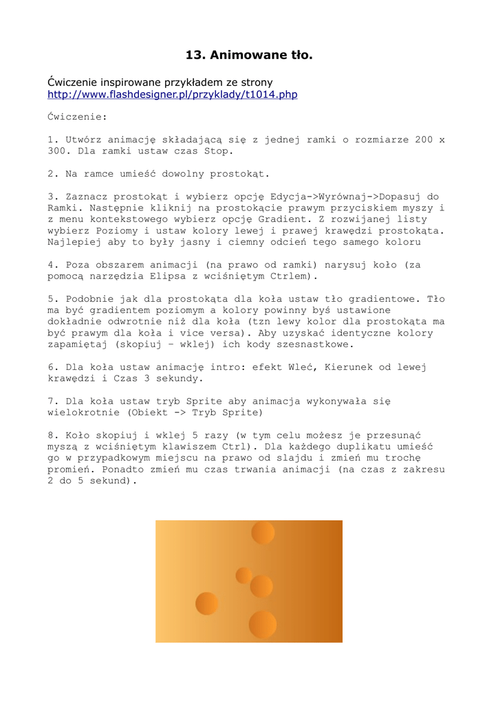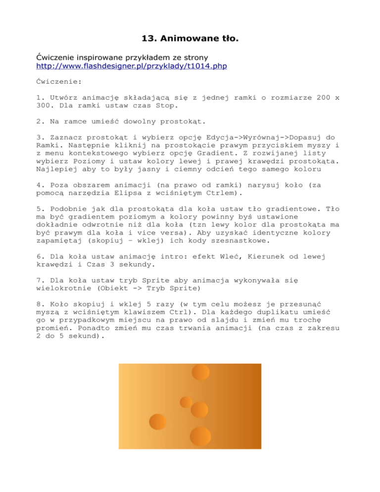 13. Animowane tło. Ćwiczenie inspirowane przykładem ze strony http://www.flashdesigner.pl/przyklady/t1014.php Ćwiczenie: 1. Utwórz animację składającą się z jednej ramki o rozmiarze 200 x 300. Dla ramki ustaw czas Stop. 2. Na ramce umieść dowolny prostokąt. 3. Zaznacz prostokąt i wybierz opcję Edycja->Wyrównaj->Dopasuj do Ramki. Następnie kliknij na prostokącie prawym przyciskiem myszy i z menu kontekstowego wybierz opcję Gradient. Z rozwijanej listy wybierz Poziomy i ustaw kolory lewej i prawej krawędzi prostokąta. Najlepiej aby to były jasny i ciemny odcień tego samego koloru 4. Poza obszarem animacji (na prawo od ramki) narysuj koło (za pomocą narzędzia Elipsa z wciśniętym Ctrlem). 5. Podobnie jak dla prostokąta dla koła ustaw tło gradientowe. Tło ma być gradientem poziomym a kolory powinny byś ustawione dokładnie odwrotnie niż dla koła (tzn lewy kolor dla prostokąta ma być prawym dla koła i vice versa). Aby uzyskać identyczne kolory zapamiętaj (skopiuj – wklej) ich kody szesnastkowe. 6. Dla koła ustaw animację intro: efekt Wleć, Kierunek od lewej krawędzi i Czas 3 sekundy. 7. Dla koła ustaw tryb Sprite aby animacja wykonywała się wielokrotnie (Obiekt -> Tryb Sprite) 8. Koło skopiuj i wklej 5 razy (w tym celu możesz je przesunąć myszą z wciśniętym klawiszem Ctrl). Dla każdego duplikatu umieść go w przypadkowym miejscu na prawo od slajdu i zmień mu trochę promień. Ponadto zmień mu czas trwania animacji (na czas z zakresu 2 do 5 sekund).