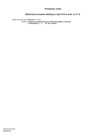 Przedmiar robót Wykonanie ścianek działowy z płyt G-K w bud. nr 6 i 9. Obiekt lub rodzaj robót: Budynek nr - 6 i 9 Inwestor: 5 Wojskowy Szpital Kliniczny z Polikliniką SPZOZ w Krakowie ul. Wrocławska 1 - 3 30 - 901 Kraków Data opracowania: 2015-07-07 Poddasze ścianki bud. nr 9 ZUZIA11 (C) Datacomp 1994-2014 (lic. 00052E8B) strona nr: 2 Ogólna charakterystyka obiektów lub robót Zakres prac: Budynek nr 6 – Oddział Neurochirurgii (parter) - wykonanie ścianki działowej z płyt gipsowo-kartonowych stanowiącej uzupełnienie istniejącej ścianki działowej w korytarzu Oddziału Neurochirurgii zlokalizowanym na parterze bud. nr 6. Wysokość istniejącej ścianki 210 cm wysokość nadbudowywanej ścianki ok. 200 cm. Ścianka o gr. 10 cm, konstrukcja nośna metalowa 75 mm, opłytowanie jednowarstwowe, płyta GKF, izolacja wnętrza ścianki (akustyczna) – wełna mineralna o gr. 5 cm i gęstości 60kg/m3. Ścianka w systemie Rigips Polska lub Knauff lub równoważnym. Budynek nr 9 – Kliniczny Oddział Psychiatryczny, Oddział Psychiatryczny Dzienny (poddasze) - wykonanie ścianki działowej z płyt gipsowo-kartonowych w gabinecie psychologicznym; (wysokość pomieszczenia ok. 250 cm) - dostawa i montaż 2 szt. drzwi wewnętrznych o wymiarach min. 90x200 cm kolor i typ dostosowany do istniejących (konstrukcja drzwi płyta wiórowa pełna, klamki stalowe- stal nierdzewna szczotkowana, wyposażone w 3 zawiasy czopowe, ościeżnica typowa metalowa malowana jak laminat na drzwiach, drzwi obłożone laminatem drewnopodobnym w kolorze Jesion). Ścianka o gr. 10 cm, konstrukcja nośna metalowa 75 mm, opłytowanie jednowarstwowe, płyta GKF, izolacja wnętrza ścianki (akustyczna) – wełna mineralna o gr. 5 cm i gęstości 60kg/m3. Ścianka w systemie Rigips Polska lub Knauff lub równoważnym. Przedmiar robót <-NR-> <-PODST-> Nr 1 1.1 1.2 1.3 1.4 1.5 <-OPIS-> Podstawa Kosztorys Element KNRW 401/1216/1 KNR 401/816/6 KNR 401/814/5 KNR 401/815/5 KNR 909/401/2 (1) KNNR 2/1103/1 <-JEDN-> Opis robót Jm 2 Ilo¶ć Wykonanie ścianek działowy z płyt G-K w bud. nr 6 i 9. Budynek nr 9 - poddasze Zabezpieczenie podłóg folią Rozebranie części posadzek z paneli Uzupełnienie posadzek z paneli podłogowych Uzupełnienia listew przyściennych z drewna liściastego 2x2˙cm, na odcinkach prostych Ściana szkieletowa z płyt gipsowo-kartonowych z okładziną obustronną 1-warstwową, na szkielecie metalowym pojedynczym, z wypełnieniem wełną mineralną, okładzina gr. 100˙mm, płyta GKF˙12,5˙mm 1.6 Dostawa i montaż kpl. drzwi wewnętrznych pełnych ( wypełnienie płyta wiórow pełna , laminat drewnopodobny Jesion, klamki drzwiowe stalowe - stal nierdzewna szczotkowana, drzwi wyposażone w 3 zawiasy czopowe) - 2 szt. /90x200 cm/ 1.7 KNNR 2/1104/2 Dostawa i montaz ościeżnicy metalowej malowanej w kolorze zbliżonym do laminatu 1.8 NNRNKB Gładzie gipsowe 1-warstwowe na ścianach w pomieszczeniach o powierzchni podłogi ponad 5˙m2, (grubość 202/2013/4 3˙mm) na płytach gipsowych 1.9 NNRNKB Gruntowanie podłoży, powierzchnie poziome 202/1134/1 (1) 1.10 KNR 202/1505/5 Malowanie farbami emulsyjnymi wewnętrznych płyt gipsowych spoinowanych i szpachlowanych, 2-krotnie 1.11 KNR 401/1215/7 Mycie po robotach malarskich, podłogi drewniane, malowane 2 Element Bud. nr 6 - parter 2.1 KNRW Zabezpieczenie podłóg folią 401/1216/1 2.2 KNR 909/401/2 Ściana szkieletowa z płyt gipsowo-kartonowych z okładziną obustronną 1-warstwową, na szkielecie (1) metalowym pojedynczym, z wypełnieniem wełną mineralną, okładzina gr. 100˙mm, płyta GKF˙12,5˙mm 2.3 NNRNKB Gładzie gipsowe 1-warstwowe na ścianach w pomieszczeniach o powierzchni podłogi ponad 5˙m2, (grubość 202/2013/4 3˙mm) na płytach gipsowych 2.4 NNRNKB Gruntowanie podłoży, powierzchnie poziome 202/1134/1 (1) 2.5 KNR 202/1505/5 Malowanie farbami emulsyjnymi wewnętrznych płyt gipsowych spoinowanych i szpachlowanych, z gruntowaniem, 2-krotnie 2.6 KNR 401/1215/7 Mycie po robotach malarskich strona nr: <-ILOSC-> m2 m2 m2 m 32 2 2 14,00 m2 16,40 m2 m2 4,10 2,46 m2 32,80 m2 m2 m2 32,80 32,80 32 m2 30 m2 13,00 m2 26,00 m2 26,00 m2 m2 26,00 30 Wykonanie ścianek działowy z płyt G-K w bud. nr 6 i 9. Poddasze ścianki bud. nr 9 ZUZIA11 (C) Datacomp 1994-2014 (lic. 00052E8B) strona nr: 3 Spis treści A. Ogólna charakterystyka obiektów lub robót. . . . . . . . . . . . . . . . . . . . . . . . . . . . . . . . . . . . . . . . . . . . . . . . . . . . . . . . . . . . . . . . . . . . . . . . . . . . . . . . . . 2. . . . . B. Przedmiar robót. . . . . . . . . . . . . . . . . . . . . . . . . . . . . . . . . . . . . . . . . . . . . . . . . . . . . . . . . . . . . . . . . . . . . . . . . . . . . . . . . . . . . . . . . . . . . . . . . . . . . . . . . 2. . . . . 1. Budynek nr 9 - poddasze. . . . . . . . . . . . . . . . . . . . . . . . . . . . . . . . . . . . . . . . . . . . . . . . . . . . . . . . . . . . . . . . . . . . . . . . . . . . . . . . . . . . . . . . . . . . . . . . . . 2. . . . . 2. Bud. nr 6 - parter. . . . . . . . . . . . . . . . . . . . . . . . . . . . . . . . . . . . . . . . . . . . . . . . . . . . . . . . . . . . . . . . . . . . . . . . . . . . . . . . . . . . . . . . . . . . . . . . . . . . . . . . .2. . . . . C. Spis treści. . . . . . . . . . . . . . . . . . . . . . . . . . . . . . . . . . . . . . . . . . . . . . . . . . . . . . . . . . . . . . . . . . . . . . . . . . . . . . . . . . . . . . . . . . . . . . . . . . . . . . . . . . . . . .3. . . . . strona nr: 3 Wykonanie ścianek działowy z płyt G-K w bud. nr 6 i 9.