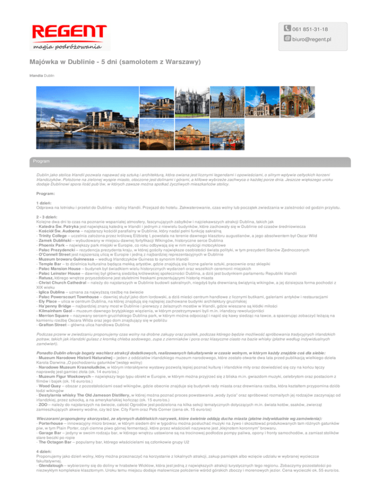 061 851-31-18 [email protected] Majówka w Dublinie - 5 dni (samolotem z Warszawy) Irlandia Dublin Program Dublin jako stolica Irlandii pozwala napawać się sztuką i architekturą, która owiana jest licznymi legendami i opowieściami, o silnym wpływie celtyckich korzeni Irlandczyków. Położone na zielonej wyspie miasto, otoczone jest dolinami i górami, a klifowe wybrzeże zachwyca o każdej porze dnia. Jeszcze większego uroku dodaje Dublinowi spora ilość pub’ów, w których zawsze można spotkać życzliwych mieszkańców stolicy. Program: 1 dzień: Odprawa na lotnisku i przelot do Dublina - stolicy Irlandii. Przejazd do hotelu. Zakwaterowanie, czas wolny lub początek zwiedzania w zależności od godzin przylotu. 2 - 3 dzień: Kolejne dwa dni to czas na poznanie wspaniałej atmosfery, fascynujących zabytków i najciekawszych atrakcji Dublina, takich jak - Katedra Św. Patryka jest największą katedrą w Irlandii i jednym z niewielu budynków, które zachowały się w Dublinie od czasów średniowiecza - Kościół Św. Audoena – najstarszy kościół parafialny w Dublinie, który nadal pełni funkcję sakralną - Trinity College – uczelnia założona przez królową Elżbietę I, powstała na terenie dawnego klasztoru augustianów, a jego absolwentem był Oscar Wild - Zamek Dubliński – wybudowany w miejscu dawnej fortyfikacji Wikingów, historyczne serce Dublina - Phoenix Park – największy park miejski w Europie, co roku odbywają się w nim wyścigi motocyklowe - Pałac Prezydencki – rezydencja prezydenta kraju, w której gościły największe osobistości świata polityki, w tym prezydent Stanów Zjednoczonych - O'Connell Street jest najszerszą ulicą w Europie i jedną z najbardziej reprezentacyjnych w Dublinie - Muzeum browaru Guinnessa – według Irlandczyków Guiness to synonim Irlandii - Temple Bar – to dzielnica kulturalna będąca mekką artystów, gdzie znajdują się liczne galerie sztuki, pracownie oraz sklepiki - Pałac Mansion House – budynek był świadkiem wielu historycznych wydarzeń oraz wszelkich ceremonii miejskich - Pałac Leinster House – dawniej był główną siedzibą królewskiej społeczności Dublina, a dziś jest budynkiem parlamentu Republiki Irlandii - Ratusz, którego wnętrze przyozdobione jest stuletnimi freskami prezentującymi historię miasta - Christ Church Cathedral – należy do najstarszych w Dublinie budowli sakralnych, niegdyś była drewnianą świątynią wikingów, a jej dzisiejsza forma pochodzi z XIX wieku - Iglica Dublina – uznana za najwyższą rzeźbę na świecie - Pałac Powerscourt Townhouse – dawniej służył jako dom lordowski, a dziś mieści centrum handlowe z licznymi butikami, galeriami antyków i restauracjami - Ely Place – ulica w centrum Dublina, na której znajdują się najlepiej zachowane budynki architektury gruzińskiej - Ha’penny Bridge – najbardziej znany most w Dublinie i pierwszy z żelaznych mostów w Irlandii, gdzie wieszane są kłódki miłości - Kilmainham Gaol – muzeum dawnego brytyjskiego więzienia, w którym przetrzymywani byli m.in. irlandzcy rewolucjoniści - Merrion Square – nazywany sercem gruzińskiego Dublina park, w którym można odpocząć i napić się kawy siedząc na ławce, a spacerując zobaczyć leżącą na kamieniu rzeźbę Oscara Wilda oraz jego dom znajdujący się w pobliżu - Grafton Street – główna ulica handlowa Dublina Podczas przerw w zwiedzaniu proponujemy czas wolny na drobne zakupy oraz posiłek, podczas którego będzie możliwość spróbowania tradycyjnych irlandzkich potraw, takich jak irlandzki gulasz z kromką chleba sodowego, zupa z ziemniaków i pora oraz klasyczne ciasto na bazie whisky (płatne według indywidualnych zamówień). Ponadto Dublin oferuje bogaty wachlarz atrakcji dodatkowych, realizowanych fakultatywnie w czasie wolnym, w którym każdy znajdzie coś dla siebie: - Muzeum Narodowe Historii Naturalnej – jeden z oddziałów irlandzkiego muzeum narodowego, które zostało otwarte dwa lata przed publikacją wielkiego dzieła Karola Darwina „O pochodzeniu gatunków”(wstęp wolny) - Narodowe Muzeum Krasnoludków, w którym interaktywne wystawy pozwolą lepiej poznać kulturę i irlandzkie mity oraz dowiedzieć się czy na końcu tęczy naprawdę jest garniec złota (ok. 14 euro/os.) - Muzeum Figur Woskowych – największy tego typu obiekt w Europie, w którym można przyjrzeć się z bliska m.in. gwiazdom muzyki, celebrytom oraz postaciom z filmów i bajek (ok. 16 euro/os.) - Wood Quay – obszar z pozostałościami osad wikingów, gdzie obecnie znajduje się budynek rady miasta oraz drewniana rzeźba, która kształtem przypomina dziób łodzi wikingów - Destylarnia whisky The Old Jameson Distillery, w której można poznać proces powstawania „wody życia” oraz spróbować rozmaitych jej rodzajów zaczynając od irlandzkiej, przez szkocką, a na amerykańskiej kończąc (ok. 15 euro/os.) - ZOO – należy do najstarszych na świecie, całość Ogrodów jest podzielona na kilka sekcji tematycznych dotyczących m.in. świata kotów, ssaków, zwierząt zamieszkujących akweny wodne, czy też tzw. City Farm oraz Pets Corner (cena ok. 15 euro/os) Wieczorami proponujemy skorzystać, ze słynnych dublińskich rozrywek, które świetnie oddają ducha miasta (płatne indywidualnie wg zamówienia): - Porterhouse – innowacyjny micro browar, w którym siedem dni w tygodniu można posłuchać muzyki na żywo i skosztować produkowanych tam różnych gatunków piw, w tym Plain Porter, czyli ciemne piwo górnej fermentacji, które przez właścicieli nazywane jest „klejnotem koronnym” browaru. - Garage Bar – jedyny w swoim rodzaju bar, w którego wnętrzu ustawione są na trocinowej podłodze pompy paliwa, opony i fronty samochodów, a zamiast stolików stare beczki po ropie - The Octagon Bar – popularny bar, którego właścicielami są członkowie grupy U2 4 dzień: Proponujemy jako dzień wolny, 