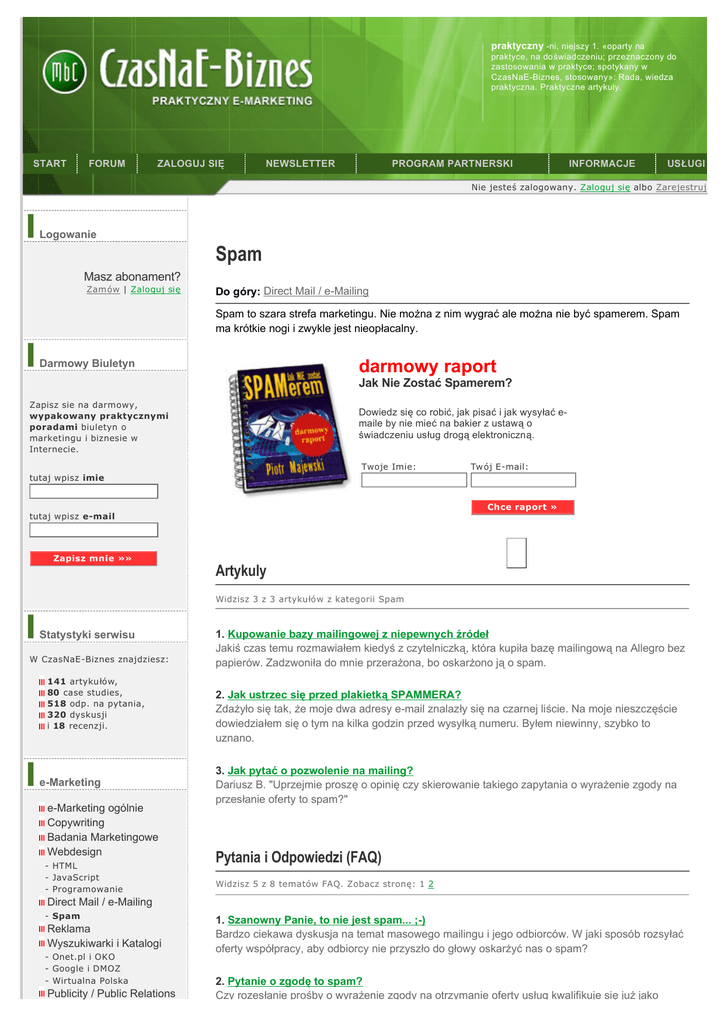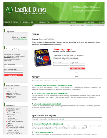 praktyczny -ni, niejszy 1. «oparty na praktyce, na doświadczeniu; przeznaczony do zastosowania w praktyce; spotykany w CzasNaE-Biznes, stosowany»: Rada, wiedza praktyczna. Praktyczne artykuly. START FORUM ZALOGUJ SIĘ NEWSLETTER PROGRAM PARTNERSKI INFORMACJE USŁUGI Nie jesteś zalogowany. Zaloguj się albo Zarejestruj Logowanie Spam Masz abonament? Zamów | Zaloguj się Do góry: Direct Mail / e-Mailing Spam to szara strefa marketingu. Nie można z nim wygrać ale można nie być spamerem. Spam ma krótkie nogi i zwykle jest nieopłacalny. Darmowy Biuletyn darmowy raport Jak Nie Zostać Spamerem? Zapisz sie na darmowy, wypakowany praktycznymi poradami biuletyn o marketingu i biznesie w Internecie. Dowiedz się co robić, jak pisać i jak wysyłać emaile by nie mieć na bakier z ustawą o świadczeniu usług drogą elektroniczną. Twoje Imie: Tw ój E-mail: tutaj wpisz imie Chce raport » tutaj wpisz e-mail Zapisz mnie »» Artykuly Widzisz 3 z 3 artykułów z kategorii Spam Statystyki serwisu W CzasNaE-Biznes znajdziesz: 141 artykułów, 80 case studies, 518 odp. na pytania, 320 dyskusji i 18 recenzji. e-Marketing e-Marketing ogólnie Copywriting Badania Marketingowe Webdesign - HTML - JavaScript - Programowanie 1. Kupowanie bazy mailingowej z niepewnych źródeł Jakiś czas temu rozmawiałem kiedyś z czytelniczką, która kupiła bazę mailingową na Allegro bez papierów. Zadzwoniła do mnie przerażona, bo oskarżono ją o spam. 2. Jak ustrzec się przed plakietką SPAMMERA? Zdażyło się tak, że moje dwa adresy e-mail znalazły się na czarnej liście. Na moje nieszczęście dowiedziałem się o tym na kilka godzin przed wysyłką numeru. Byłem niewinny, szybko to uznano. 3. Jak pytać o pozwolenie na mailing? Dariusz B. "Uprzejmie proszę o opinię czy skierowanie takiego zapytania o wyrażenie zgody na przesłanie oferty to spam?" Pytania i Odpowiedzi (FAQ) Widzisz 5 z 8 tematów FAQ. Zobacz stronę: 1 2 Direct Mail / e-Mailing - Spam Reklama Wyszukiwarki i Katalogi - Onet.pl i OKO - Google i DMOZ - Wirtualna Polska Publicity / Public Relations 1. Szanowny Panie, to nie jest spam... ;-) Bardzo ciekawa dyskusja na temat masowego mailingu i jego odbiorców. W jaki sposób rozsyłać oferty współpracy, aby odbiorcy nie przyszło do głowy oskarżyć nas o spam? 2. Pytanie o zgodę to spam? Czy rozesłanie prośby o wyrażenie zgody na otrzymanie oferty usług kwalifikuje się już jako