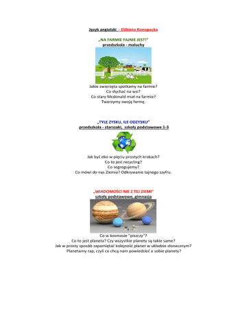 Język angielski - Elżbieta Konopacka „NA FARMIE FAJNIE JEST!” przedszkola - maluchy Jakie zwierzęta spotkamy na farmie? Co słychać na wsi? Co stary Mcdonald miał na farmie? Tworzymy swoją farmę. „TYLE ZYSKU, ILE ODZYSKU” przedszkola - starszaki, szkoły podstawowe 1-3 Jak być eko w pięciu prostych krokach? Co to jest recycling? Co segregujemy? Co mówi do nas Ziemia? Odkrywanie tajnego szyfru. „WIADOMOŚCI NIE Z TEJ ZIEMI” szkoły podstawowe, gimnazja Co w kosmosie "piszczy"? Co to jest planeta? Czy wszystkie planety są takie same? Jak w prosty sposób zapamiętać kolejność planet w układzie słonecznym? Planetarny rap, czyli co chcą nam powiedzieć o sobie planety? „IDZIEMY DO ZOO” – w przygotowaniu II semestr przedszkola - maluchy Czy potrafisz nazwać zwierzątka mieszkające w zoo? Czy potrafisz naśladować te zwierzątka? Co to za zwierzak? Moje ZOO.