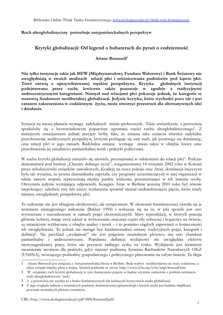 Biblioteka Online Think Tanku Feministycznego www.ekologiasztuka.pl/think.tank.feministyczny Ruch alterglobalistyczny potrzebuje antypatriarchalnych perspektyw Krytyki globalizacji: Od legend o bohaterach do pytań o codzienność Ariane Brenssell1 Nie tylko instytucje takie jak MFW (Międzynarodowy Fundusz Walutowy) i Bank Światowy nie uwzględniają w swoich analizach relacji płci i zróżnicowania podmiotów pod kątem płci. Toteż mówią z uprzywilejowanej męskiej perspektywy. Krytyka globalnych instytucji podejmowana przez ruchy lewicowe także pozostaje w zgodzie z tradycyjnymi androcentrycznymi kategoriami. Namysł nad relacjami płci pokazuje jednak, że kategorie te stanowią fundament neoliberalnej globalizacji. Jedynie krytyka, która wychodzi poza nie i jest zarazem zakorzeniona w codziennym życiu, może stworzyć przestrzeń dla alternatywnych idei i działania. Sytuacja na naszej planecie wymaga radykalnych zmian społecznych. Takie stwierdzenie z pewnością spotkałoby się z bezwarunkowym poparciem ogromnej części ruchu alterglobalistycznego2. Z mniejszym entuzjazmem jednak przyjęty byłby fakt, że zmiana taka oznacza również radykalne przeobrażenie analitycznych perspektyw, którymi posługuje się sam ruch, jak postrzega on dominację, oraz relacji płci w jego ramach. Radykalna zmiana wymaga zmian także w obrębie lewicy oraz przeobrażenia jej zasadniczo patriarchalnej teorii i praktyki politycznej. W ruchu krytyki globalizacji zmieniło się niewiele, przynajmniej w odniesieniu do relacji płci3. Podczas demonstracji pod hasłem „Chcemy dobrego życia”, zorganizowanej 14 września 2002 roku w Kolonii przez młodzieżówki związków zawodowych, Koalicję na rzecz pokoju oraz Attac, dominacja mężczyzn była tak wyraźna, że pewna dziennikarka zapytała, czy programy uczestniczących w niej organizacji w takim samym stopniu reprezentują męskie punkty widzenia, przemawiające w ich imieniu osoby. Otrzymała jedynie wymijającą odpowiedź. Kongres Attac w Berlinie jesienią 2001 roku był równie niepokojący: zaledwie trzy lub cztery wydarzenia spośród niemal siedemdziesięciu pięciu, które miały miejsce, uwzględniały perspektywę płci. To milczenie nie jest zbiegiem okoliczności, ale symptomem. W ekonomii feministycznej określa się je terminem strategicznego milczenia (Bakker 1994) i wskazuje się na to, w jaki sposób jest ono wytwarzane i warunkowane w ramach pojęć ekonomicznych. Sfery reprodukcji, w których pracują głównie kobiety, mając swój udział w wytwarzaniu znacznej części siły roboczej i bogactwa na świecie, są ustawicznie wykluczane z obrębu analizy i teorii – i to pomimo ciągłych zapewnień o konieczności ich uwzględnienia. To jednak nie nastąpi bez fundamentalnej zmiany tradycyjnych pojęć, kategorii i definicji4. Na przykład „wydajność” nie jest pojęciem neutralnym płciowo; ma ono charakter patriarchalny i androcentryczny. Popularna definicja wydajności nie uwzględnia efektów niewynagradzanej pracy, która nie przynosi żadnego zysku na rynku. Wydajność jest terminem niezmiernie istotnym dla praktyki, gdyż stanowi podstawę Systemu Rachunków Narodowych ONZ (UNSNA), tworzącego podwaliny gospodarczego i politycznego planowania na całym świecie. Ta ślepa 1 Ariane Brenssell jest związana z Antypatriarchalną Siecią w Berlinie. Bada wpływ neoliberalizmu na życie codzienne, a także związki między płcią a wojną. Artykuł pochodzi ze strony http://www.iz3w.org/iz3w/engl/brensell.htm 2 W oryginale: ruch krytyki globalizacji; w tym tłumaczeniu pojęcie to będzie używane zamiennie z polskim terminem ruch alterglobalistyczny (red.) 3 A z pewnością nie wynika to z braku feministycznych lub kobiecych krytycznych analiz globalizacji. 4 Z tego względu jednym z centralnych punktów feministycznej epistemologii i krytyki nauki jest badanie implikacji pozornie neutralnych płciowo terminów. URL: http://www.ekologiasztuka.pl/pdf/f0063brenssell.pdf 1 Biblioteka Online Think Tanku Feministycznego www.ekologiasztuka.pl/think.tank.feministyczny na płeć perspektywa, która zwyczajnie pomija niewynagradzaną pracę, wzmacnia zatem płciowy podział pracy w światowym systemie gospodarczym (Eichler 1994). Przejdę teraz do krótkiego omówienia znaczenia feministycznej, antypatriarchalnej perspektywy dla krytyki globalizacji i ruchu alterglobalistycznego. Perspektywa ta nie ogranicza się jedynie do polityki interesu konkretnej grupy „kobiet”. Oznacza to nie tylko zainteresowanie kwestiami dotyczącymi kobiet, takimi jak wpływ globalizacji na nie lub to, czy są przegranymi czy wygranymi globalizacji5. Płeć, jako zasadniczy wymiar socjalizacji, musi być w systematyczny sposób uwzględniana w analizie i krytyce porządku społecznego. Obszary kultury, życia codziennego i osobistego w ramach struktur społecznych i instytucji rozwijają się w sposób uwarunkowany płciowo. Relacje płci konstytuują inne relacje władzy i instytucje społeczne. Dominacja, a w szczególności globalna dominacja neoliberalizmu, jest po części zbudowana na hierarchicznej strukturze relacji płci. Ignorowanie tego faktu prowadzi do odtwarzania dominujących struktur myślenia. Przyznanie, że tak jest, wymaga uczynienia więcej niż tylko podjęcia próby ulepszenia lub rozbudowania istniejącej ramy (teoretycznej). Wymaga ono przekształcenia teorii i jej założeń. Ucisk i dyskryminacja kobiet, podtrzymujące wszelkiego rodzaju polaryzację płciową, nie są skutkiem ubocznym lub przypadkowym objawem towarzyszącym neoliberalnej globalizacji. Stanowią one strukturalny komponent dominacji w jej globalnej formie – w systematyczny sposób przyczyniają się do uprzywilejowywania korporacji i wspierają orientację na zysk. Wszystko zaś, co nie może się bezpośrednio przysłużyć korporacjom lub orientacji na zysk, w coraz większym stopniu jest spychane na „zaplecze”. Przyjrzenie si