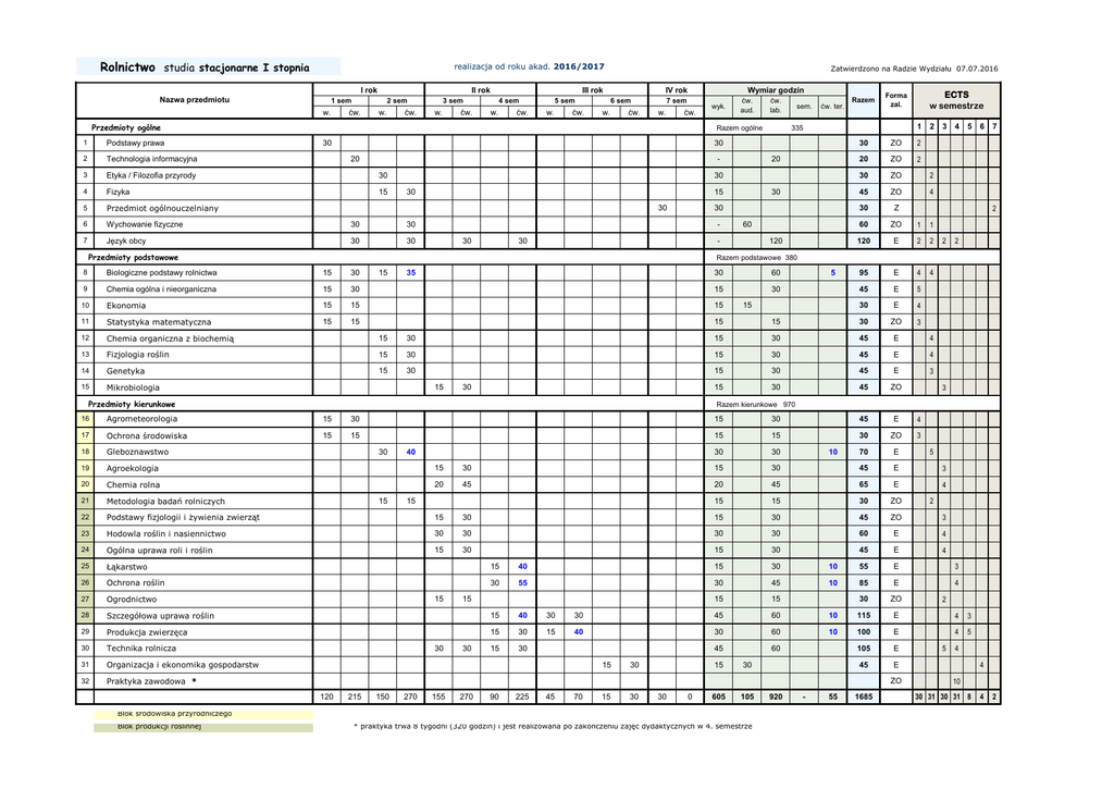 Rolnictwo studia stacjonarne I stopnia realizacja od roku akad. 2016/2017 I rok Nazwa przedmiotu II rok 1 sem w. 2 sem ćw. w. ćw. III rok 3 sem w. ćw. Zatwierdzono na Radzie Wydziału 07.07.2016 4 sem w. ćw. 5 sem w. ćw. IV rok 6 sem w. ćw. Wymiar godzin 7 sem w. ćw. Przedmioty ogólne wyk. ćw. aud. ćw. lab. Razem ogólne 1 Podstawy prawa 30 2 Technologia informacyjna 3 Etyka / Filozofia przyrody 30 4 Fizyka 15 5 Przedmiot ogólnouczelniany 6 Wychowanie fizyczne 30 30 7 Język obcy 30 30 sem. ćw. ter. - 20 15 30 30 30 30 - 30 60 - Przedmioty podstawowe 30 ZO 2 20 ZO 2 30 ZO 2 45 ZO 4 30 Z 60 ZO 1 1 120 E 2 2 95 E 4 4 45 E 5 1 30 30 Forma zal. 335 30 20 ECTS w semestrze Razem 120 2 3 4 5 7 2 2 2 Razem podstawowe 380 8 Biologiczne podstawy rolnictwa 15 30 30 60 9 Chemia ogólna i nieorganiczna 15 30 15 30 10 Ekonomia 15 15 15 30 E 4 11 Statystyka matematyczna 15 15 15 15 30 ZO 3 12 Chemia organiczna z biochemią 15 30 15 30 45 E 4 13 Fizjologia roślin 15 30 15 30 45 E 4 14 Genetyka 15 30 15 30 45 E 3 15 Mikrobiologia 15 30 45 ZO 15 35 15 30 Przedmioty kierunkowe 5 15 3 Razem kierunkowe 970 16 Agrometeorologia 15 30 15 30 45 E 4 17 Ochrona środowiska 15 15 15 15 30 ZO 3 18 Gleboznawstwo 30 30 70 E 19 Agroekologia 15 30 15 30 45 E 20 Chemia rolna 20 45 20 45 65 E 21 Metodologia badań rolniczych 15 15 30 ZO 22 Podstawy fizjologii i żywienia zwierząt 15 30 15 30 45 ZO 3 23 Hodowla roślin i nasiennictwo 30 30 30 30 60 E 4 24 Ogólna uprawa roli i roślin 15 30 15 30 45 E 4 25 Łąkarstwo 15 40 15 30 10 55 E 26 Ochrona roślin 30 55 30 45 10 85 E 27 Ogrodnictwo 15 15 30 ZO 28 Szczegółowa uprawa roślin 15 40 30 30 45 60 10 115 E 4 3 29 Produkcja zwierzęca 15 30 15 40 30 60 10 100 E 4 5 30 Technika rolnicza 15 30 45 60 105 E 31 Organizacja i ekonomika gospodarstw 45 E 32 Praktyka zawodowa * 30 15 40 15 15 30 15 30 15 30 15 10 30 ZO 120 215 150 270 155 270 90 225 45 70 15 30 30 0 605 105 Blok środowiska przyrodniczego Blok produkcji roślinnej 6 * praktyka trwa 8 tygodni (320 godzin) i jest realizowana po zakończeniu zajęć dydaktycznych w 4. semestrze 920 - 55 1685 5 3 4 2 3 4 2 5 4 4 10 30 31 30 31 8 4 2 Rolnictwo studia stacjonarne I stopnia specjalność: Agronomia z agrobiznesem realizacja od roku akad. 2016/2017 I rok 1 sem ćw. w. II rok 2 sem ćw. w. 3 sem ćw. w. Zatwierdzono na Radzie Wydziału 07.07.2016 III rok 4 sem w. 5 sem ćw. ćw. w. IV rok 6 sem ćw. w. 7 sem w. ćw. Wymiar godzin wyk. ćw. aud. ćw. lab. sem. ćw. ter. Razem ECTS w semestrze Forma zal. Przedmioty specjalnościowe ( przedmioty do wyboru) 1 2 3 4 5 6 7 33 Agrobiznes a rozwój zrównoważony obszarów wiejskich 15 15 15 15 30 E 3 34 Rynek i bezpieczeństwo żywności 15 30 15 30 45 ZO 4 35 System finansowy w rolnictwie 15 15 15 15 30 ZO 3 36 Polityka rolna 15 30 15 45 E 4 37 Systemy informatyczne w rolnictwie 15 30 15 45 ZO 4 38 Ekonomika mechanizacji rolnictwa 15 30 15 45 E 4 39 Ekonomiczne aspekty dobrostanu zwierząt 15 15 15 15 30 ZO 3 40 Agronomiczne aspekty intensyfikacji produkcji 30 15 30 15 45 E 5 41 Certyfikacje surowców i produktów 15 30 15 30 45 ZO 4 42 Podstawy integracji gospodarczej 15 30 15 30 45 ZO 4 43 Marketing w agrobiznesie 30 30 30 30 60 E 5 44 Postęp technologiczny w rolnictwie 30 30 30 30 60 ZO 4 45 Doradztwo rolnicze 15 30 15 30 45 ZO 3 46 Przedsiębiorczość w agrobiznesie 15 15 15 15 30 E 2 47 Seminarium inżynierskie 30 60 ZO 3 18 48 Przedmiot do wyboru I 30 30 30 ZO 2 49 Przedmiot do wyboru II 25 25 ZO 30 30 30 30 60 25 2 0 90 Liczba godzin w semestrze 120 215 335 150 270 420 155 270 425 90 225 135 315 150 105 180 60 220 120 210 90 355 330 130 255 130 220 Przedmiot do wyboru II: Przedmiot do wyboru I: 1. Rynek nawozów i usług agrochemicznych 1. Mykotoksyny w żywności i w środowisku 2. Rynek surowców i produktów pochodzenia zwierzęcego 2. Skażenie żywności pestycydami 3. Dystrybucja i stosowanie środków chemicznych ochrony roślin 3. Płodozmiany we współczesnym rolnictwie 4. Nowoczesne techniki a środowisko 4. Energochłonność produkcji rolniczej 5. Podstawy toksykologii żywności i środowiska 120 280 60 0 715 2400 0 0 0 22 26 29 30 31 30 31 30 30 31 Rolnictwo studia stacjonarne I stopnia realizacja od roku akad. 2016/2017 specjalność: Kształtowanie rolniczej przestrzeni produkcyjnej I rok 1 sem w. ćw. II rok 2 sem w. ćw. 3 sem w. ćw. Zatwierdzono na Radzie Wydziału 07.07.2016 III rok 4 sem w. 5 sem ćw. w. ćw. IV rok 6 sem w. ćw. 7 sem w. ćw. wyk. Wymiar godzin ćw. ćw. sem. aud. lab. ćw. ter. Razem ECTS w semestrze Forma zal. 1 2 3 4 5 6 7 Przedmioty specjalnościowe ( przedmioty do wyboru) 33 Dobra praktyka rolnicza 30 30 30 30 60 E 5 34 Dobra praktyka rolnicza w produkcji zwierzęcej 30 30 30 30 60 ZO 5 35 Ekonomika środodowiska i zasobów naturalnych 15 30 15 30 45 E 4 36 Kształtowanie terenów zieleni 15 30 15 30 45 E 4 37 Ochrona i rekultywacja gleb 15 30 15 30 45 ZO 4 38 Hydrologia i gospodarowanie wodą 15 30 15 30 45 E 4 39 Kształtowanie środowiska leśnego 15 30 15 30 45 ZO 4 40 Polityka rolna 15 15 15 30 E 4 41 Rozwój zrównoważony 30 30 30 30 60 E 5 42 Żyzność i produktywność gleb 30 15 30 15 45 E 4 43 Gospodarka odpadami w obszarach wiejskich 30 30 30 30 60 ZO 4 44 Rolnicza przestrzeń produkcyjna 15 30 15 30 45 E 4 45 Ekonomika rolnictwa 15 15 ZO 1 46 Seminarium inżynierskie 30 60 ZO 3 18 47 Przedmiot do wyboru I 30 30 30 ZO 2 48 Przedmiot do wyboru II 25 25 ZO 15 15 30 60 25 2 0 105 Liczba godzin w semestrze Przedmiot do wyboru I: 120 215 335 150 270 420 155 270 425 90 225 315 150 150 220 370 105 180 60 115 120 210 330 90 115 205 270 Przedmiot do wyboru II: 1. Elementy gospodarki łowieckiej 1. Rekultywacja terenów w przemyśle wydobywczym 2. Mykotoksyny w żywności i w środowisku 2. Zagrożenie gleb erozją 3. Skażenie żywności pestycydami 3. Dystrybucja i stosowanie środków chemicznych ochrony roślin 4. Gospodarka pasieczna 4. Zwierzęta gospodarskie a środowisko 5. Gospodarka rybacka 5. Pr