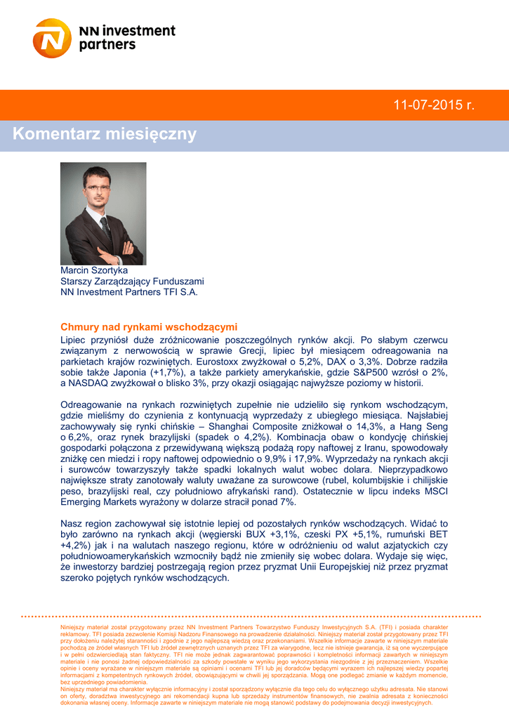 11-07-2015 r. Komentarz miesięczny Marcin Szortyka Starszy Zarządzający Funduszami NN Investment Partners TFI S.A. Chmury nad rynkami wschodzącymi Lipiec przyniósł duże zróżnicowanie poszczególnych rynków akcji. Po słabym czerwcu związanym z nerwowością w sprawie Grecji, lipiec był miesiącem odreagowania na parkietach krajów rozwiniętych. Eurostoxx zwyżkował o 5,2%, DAX o 3,3%. Dobrze radziła sobie także Japonia (+1,7%), a także parkiety amerykańskie, gdzie S&P500 wzrósł o 2%, a NASDAQ zwyżkował o blisko 3%, przy okazji osiągając najwyższe poziomy w historii. Odreagowanie na rynkach rozwiniętych zupełnie nie udzieliło się rynkom wschodzącym, gdzie mieliśmy do czynienia z kontynuacją wyprzedaży z ubiegłego miesiąca. Najsłabiej zachowywały się rynki chińskie – Shanghai Composite zniżkował o 14,3%, a Hang Seng o 6,2%, oraz rynek brazylijski (spadek o 4,2%). Kombinacja obaw o kondycję chińskiej gospodarki połączona z przewidywaną większą podażą ropy naftowej z Iranu, spowodowały zniżkę cen miedzi i ropy naftowej odpowiednio o 9,9% i 17,9%. Wyprzedaży na rynkach akcji i surowców towarzyszyły także spadki lokalnych walut wobec dolara. Nieprzypadkowo największe straty zanotowały waluty uważane za surowcowe (rubel, kolumbijskie i chilijskie peso, brazylijski real, czy południowo afrykański rand). Ostatecznie w lipcu indeks MSCI Emerging Markets wyrażony w dolarze stracił ponad 7%. Nasz region zachowywał się istotnie lepiej od pozostałych rynków wschodzących. Widać to było zarówno na rynkach akcji (węgierski BUX +3,1%, czeski PX +5,1%, rumuński BET +4,2%) jak i na walutach naszego regionu, które w odróżnieniu od walut azjatyckich czy południowoamerykańskich wzmocniły bądź nie zmieniły się wobec dolara. Wydaje się więc, że inwestorzy bardziej postrzegają region przez pryzmat Unii Europejskiej niż przez pryzmat szeroko pojętych rynków wschodzących. Niniejszy materiał został przygotowany przez NN Investment Partners Towarzystwo Funduszy Inwestycyjnych S.A. (TFI) i posiada charakter reklamowy. TFI posiada zezwolenie Komisji Nadzoru Finansowego na prowadzenie działalności. Niniejszy materiał został przygotowany przez TFI przy dołożeniu należytej staranności i zgodnie z jego najlepszą wiedzą oraz przekonaniami. Wszelkie informacje zawarte w niniejszym materiale pochodzą ze źródeł własnych TFI lub źródeł zewnętrznych uznanych przez TFI za wiarygodne, lecz nie istnieje gwarancja, iż są one wyczerpujące i w pełni odzwierciedlają stan faktyczny. TFI nie może jednak zagwarantować poprawności i kompletności informacji zawartych w niniejszym materiale i nie ponosi żadnej odpowiedzialności za szkody powstałe w wyniku jego wykorzystania niezgodnie z jej przeznaczeniem. Wszelkie opinie i oceny wyrażane w niniejszym materiale są opiniami i ocenami TFI lub jej doradców będącymi wyrazem ich najlepszej wiedzy popartej informacjami z kompetentnych rynkowych źródeł, obowiązującymi w chwili jej sporządzania. Mogą one podlegać zmianie w każdym momencie, bez uprzedniego powiadomienia. Niniejszy materiał ma charakter wyłącznie informacyjny i został sporządzony wyłącznie dla tego celu do wyłącznego użytku adresata. Nie stanowi on oferty, doradztwa inwestycyjnego ani rekomendacji kupna lub sprzedaży instrumentów finansowych, nie zwalnia adresata z konieczności dokonania własnej oceny. Informacje zawarte w niniejszym materiale nie mogą stanowić podstawy do podejmowania decyzji inwestycyjnych. Polska giełda ze spadkiem WIG o 1,1% zachowywała się gorzej od regionalnych parkietów. Duże spółki (WIG20 Total Return) zniżkowały o 3,5%, natomiast małe i średnie spółki zachowywały się wyraźnie lepiej ze wzrostem o ponad 3%. Głównymi sektorami ciążącymi nad rynkiem był sektor surowcowy (spadek o 9,2%) oraz sektor bankowy (-7,8%), który zniżkował po wypowiedziach polityków o planach wprowadzenia podatku od aktywów oraz o planach przewalutowania kredytów frankowych. Najlepsze sektory w lipcu to sektor budowlany (+8,2%), żywnościowy (+7,9%), oraz chemiczny (+7,9%). Na krajowy rynek w najbliższych tygodniach największy wpływ będzie miała najprawdopodobniej polityka i propozycje dotyczące różnych sektorów – podatki w sektorze bankowym i surowcowym, czy rozwiązania dotyczące węgla. Z kolei utrzymująca się słabość rynku surowcowego, najprawdopodobniej będzie dalej ciążyła rynkom wschodzącym jako całości. Niemniej jednak zróżnicowane zachowania poszczególnych rynków i sektorów w lipcu podpowiadają, że odpowiednia selekcja powinna dać okazję do zarobku. Niniejszy materiał został przygotowany przez NN Investment Partners Towarzystwo Funduszy Inwestycyjnych S.A. (TFI) i posiada charakter reklamowy. TFI posiada zezwolenie Komisji Nadzoru Finansowego na prowadzenie działalności. Niniejszy materiał został przygotowany przez TFI przy dołożeniu należytej staranności i zgodnie z jego najlepszą wiedzą oraz przekonaniami. Wszelkie informacje zawarte w niniejszym materiale pochodzą ze źródeł własnych TFI lub źródeł zewnętrznych uznanych przez TFI za wiarygodne, lecz nie istnieje gwarancja, iż są one wyczerpujące i w pełni odzwierciedlają stan faktyczny. TFI nie może jednak zagwarantować poprawności i kompletności informacji zawartych w niniejszym materiale i nie ponosi żadnej odpowiedzialności za szkody powstałe w wyniku jego wykorzystania niezgodnie z jej przeznaczeniem. Wszelkie opinie i oceny wyrażane w niniejszym materiale są opiniami i ocenami TFI lub jej doradców będącymi wyrazem ich najlepszej wiedzy popartej informacjami z kompetentnych rynkowych źródeł, obowiązującymi w chwili jej sporządzania. Mogą one podlegać zmianie w każdym momencie, bez uprzedniego powiadomienia. Niniejszy materiał ma charakter wyłącznie informacyjny i został sporządzony wyłącznie dla tego celu 