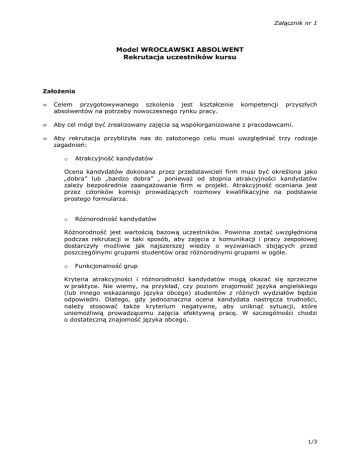 Załącznik nr 1 Model WROCŁAWSKI ABSOLWENT Rekrutacja uczestników kursu Założenia • Celem przygotowywanego szkolenia jest kształcenie absolwentów na potrzeby nowoczesnego rynku pracy. • Aby cel mógł być zrealizowany zajęcia są współorganizowane z pracodawcami. • Aby rekrutacja przybliżyła nas do założonego celu musi uwzględniać trzy rodzaje zagadnień: o kompetencji przyszłych Atrakcyjność kandydatów Ocena kandydatów dokonana przez przedstawicieli firm musi być określona jako „dobra” lub „bardzo dobra” , ponieważ od stopnia atrakcyjności kandydatów zależy bezpośrednie zaangażowanie firm w projekt. Atrakcyjność oceniana jest przez członków komisji prowadzących rozmowy kwalifikacyjne na podstawie prostego formularza. o Różnorodność kandydatów Różnorodność jest wartością bazową uczestników. Powinna zostać uwzględniona podczas rekrutacji w taki sposób, aby zajęcia z komunikacji i pracy zespołowej dostarczyły możliwie jak najszerszej wiedzy o wyzwaniach stojących przed poszczególnymi grupami studentów oraz różnorodnymi grupami w ogóle. o Funkcjonalność grup Kryteria atrakcyjności i różnorodności kandydatów mogą okazać się sprzeczne w praktyce. Nie wiemy, na przykład, czy poziom znajomość języka angielskiego (lub innego wskazanego języka obcego) studentów z różnych wydziałów będzie odpowiedni. Dlatego, gdy jednoznaczna ocena kandydata nastręcza trudności, należy stosować także kryterium negatywne, aby uniknąć sytuacji, które uniemożliwią prowadzącemu zajęcia efektywną pracę. W szczególności chodzi o dostateczną znajomość języka obcego. 1/3 Załącznik nr 1 Proponowany przebieg rekrutacji Prace zespołu rekrutacyjnego składają się z trzech etapów. Część pierwsza – ocena atrakcyjności kandydatów 1. Rozmowy kwalifikacyjne przebiegają z udziałem przedstawicieli firm. 2. Każdy kandydat oceniany jest pod względem atrakcyjności zdefiniowanej poniżej (Patrz: kryteria szczegółowe). 3. Kandydatury są punktowane. Członkowie komisji nanoszą punktację na arkusz oceny. Podczas trwania rozmów w komisji zasiada stała liczba osób. 4. Każda kandydatura oceniana jest pod kątem umiejętności krytycznych, do których należą znajomość angielskiego oraz komunikatywność. Jeżeli w opinii członka komisji dany kandydat nie posiada minimalnych umiejętności niezbędnych do udziału w projekcie, ocena ta zostaje odnotowana jako „Krytyczne braki umiejętności (KB)”. 5. Przyjmuje się, że krytyczny próg umiejętności zostaje osiągnięty jeżeli kandydat porozumiewa się skutecznie w języku angielskim (lub innym języku obcym). 6. Na podstawie punktacji sporządzona zostaje lista nr 1. Część druga – ocena różnorodności grup 1. Lista nr 1 zostaje przeanalizowana pod kątem reprezentatywności. Odnotowuje się z jakiej uczelni, wydziału i kierunku studiów pochodzą kandydaci. 2. Następnie sporządzona zostaje lista nr 2, która jest rankingiem najlepszych kandydatów według macierzystego wydziału. 3. W przypadku studiów na dwóch różnych wydziałach bierze się pod uwagę wydział zadeklarowany jako macierzysty w formularzu. 4. Na tym etapie kandydaci zostają zgrupowani. Każda grupa powinna zapewniać możliwie dużą różnorodność. Część trzecia – ocena funkcjonalności grup 1. Lista nr 2 zostaje sprawdzona pod kątem „krytycznych braków umiejętności” odnotowanych podczas rekrutacji. 2. Jeżeli kandydat, którego nazwisko znalazło się na liście nr 2 został zaliczony do grupy osób z „krytycznym brakiem umiejętności”, zostaje skreślony z listy. 3. Tym sposobem lista nr 2 po weryfikacji negatywnej pod kątem krytycznych umiejętności staje się listą ostateczną. 2/3 Załącznik nr 1 Kryteria szczegółowe Celem szkolenia ma być kształcenie umiejętności krytycznie potrzebnych na wrocławskim rynku pracy. Umiejętności te zostały określone podczas prac warsztatowych grupy biznesowej przy Wrocławskim Centrum Akademickim pomiędzy listopadem 2009 a majem 2010 roku. Podczas rozmowy kwalifikacyjnej członkowie komisji proszeni są o ocenę następujących umiejętności/ cech: 1. znajomość języka angielskiego lub innego wskazanego języka obcego (gramatyka, słownictwo, wymowa) (1-5pkt) 2. przydatność do pracy zespołowej (komunikatywność) (1-5pkt) 3. umiejętność logicznego myślenia i argumentowania (1-5pkt) Łączna punktacja składa się z powyższych składników oraz średniej ocen ze studiów (łącznie 20pkt). 3/3