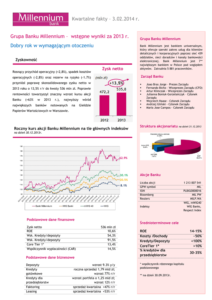 Kwartalne fakty – 3.02.2014 r. Grupa Banku Millennium – wstępne wyniki za 2013 r. Dobry rok w wymagającym otoczeniu Zyskowność Rosnący przychód operacyjny (+2,8%), spadek kosztów Zysk netto przyniósł poprawę skonsolidowanego zysku netto w 2013 roku o 13,5% r/r do kwoty 536 mln zł. Poprawie rentowności towarzyszył znaczny wzrost kursu akcji (+63% największych w 2013 banków r.), najwyższy notowanych na Bank Millennium jest bankiem uniwersalnym, który oferuje szeroki zakres usług dla klientów detalicznych i korporacyjnych poprzez sieć 439 oddziałów, sieci doradców i kanały bankowości elektronicznej. Bank Millennium jest 7** największym bankiem w Polsce pod względem aktywów. Zatrudnia 5 881 pracowników. Zarząd Banku operacyjnych (-2,8%) oraz rezerw na ryzyko (-1.7%) Banku Grupa Banku Millennium wśród Giełdzie Papierów Wartościowych w Warszawie. Roczny kurs akcji Banku Millennium na tle głównych indeksów Joao Bras Jorge – Prezes Zarządu Fernando Bicho – Wiceprezes Zarządu (CFO) Artur Klimczak - Wiceprezes Zarządu Julianna Boniuk-Gorzelańczyk – Członek Zarządu Wojciech Haase - Członek Zarządu Andrzej Gliński - Członek Zarządu Maria Jose Campos - Członek Zarządu Struktura akcjonariatu na dzień 31.12.2013 na dzień 30.12.2013r. 62.9% 30.1% 20.5% 8.1% Akcje Banku Liczba akcji GPW symbol ISIN Bloomberg Reuters Indeksy Podstawowe dane finansowe Zysk netto ROE Wsk. Kredyty/depozyty Wsk. Kredyty/depozyty Core Tier 1* Współczynnik wypłacalności (CAR) Średnioterminowe cele 536 mln zł 10,6% 54,3% 91,5% 13,4% 14,5% Podstawowe dane biznesowe Depozyty Kredyty gotówkowe Kredyty dla przedsiębiorstw Faktoring Leasing 1 213 007 541 MIL PLBIG0000016 MIL PW MILP.WA WIG, mWIG40 WIG Banks, Respect Index wzrost 9.3% y/y roczna sprzedaż 1,79 mld zł; wzrost 77% r/r wzrost portfela o 1,25 mld zł; wzrost 12% r/r sprzedaż kwartalna +47% r/r sprzedaż kwartalna +53% r/r ROE Koszty /Dochody Kredyty/Depozyty CoreTier 1* % kredytów dla przedsiębiorstw * współczynnik rdzennego kapitału podstawowego ** na dzień 30.09.2013r. 14-15% ~50% <100% >10% 30-35% Propozycja wypłaty dywidendy Zarząd Banku będzie rekomendował na następnym Walnym Zgromadzeniu Akcjonariuszy natępującą dywidendę: 267 mln zł dywidendy z zysku netto za 2013 rok Wskaźnik wypłaty dywidendy na poziomie 50% skonsolidowanego zysku netto 0,22 zł dywidendy na akcję Stopa dywidendy na poziomie 3,1% (Dla kursu giełdowego w wysokości 7,20 zł na dzień 30.12.2013r.) Relacje Inwestorskie Banku Millennium Najbliższe wydarzenie: Artur Kulesza – Dyrektor Departamentu Relacji Inwestorskich 28.02.2014 – Publikacja rocznego raportu finansowego, raportu o ładzie korporacyjnym oraz raportu o odpowiedzialnym biznesie za 2013 r. Katarzyna Stawinoga - Tel.: 598-11-10 Marek Miśków -Tel.: 598-11-16 e-mail: [email protected] 28.04.2014 – Publikacja skonsolidowanego raportu kwartalnego za I kwartał 2014 r.