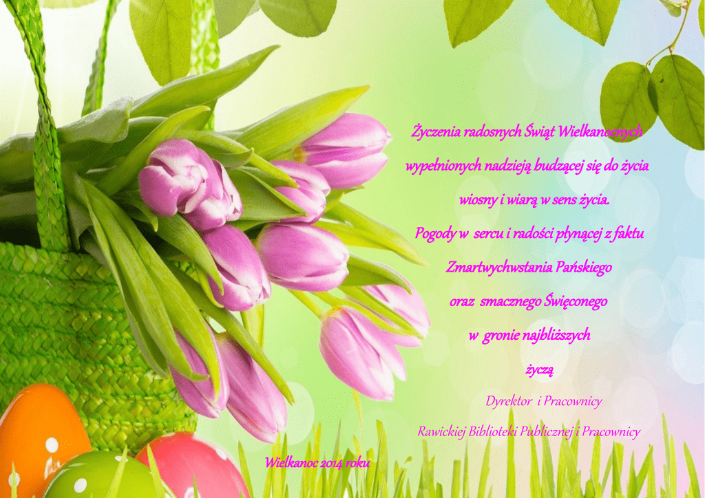 Życzenia radosnych Świąt Wielkanocnych wypełnionych nadzieją budzącej się do życia wiosny i wiarą w sens życia. Pogody w sercu i radości płynącej z faktu Zmartwychwstania Pańskiego oraz smacznego Święconego w gronie najbliższych życzą Dyrektor i Pracownicy Wielkanoc 2014 roku Rawickiej Biblioteki Publicznej i Pracownicy