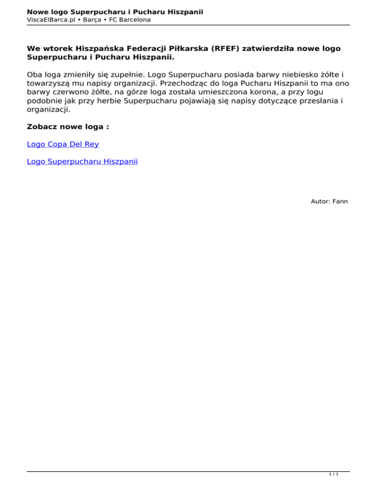 Nowe logo Superpucharu i Pucharu Hiszpanii ViscaElBarca.pl • Barça • FC Barcelona We wtorek Hiszpańska Federacji Piłkarska (RFEF) zatwierdziła nowe logo Superpucharu i Pucharu Hiszpanii. Oba loga zmieniły się zupełnie. Logo Superpucharu posiada barwy niebiesko żółte i towarzyszą mu napisy organizacji. Przechodząc do loga Pucharu Hiszpanii to ma ono barwy czerwono żółte, na górze loga została umieszczona korona, a przy logu podobnie jak przy herbie Superpucharu pojawiają się napisy dotyczące przesłania i organizacji. Zobacz nowe loga : Logo Copa Del Rey Logo Superpucharu Hiszpanii Autor: Fann 1/1 Powered by TCPDF (www.tcpdf.org)
