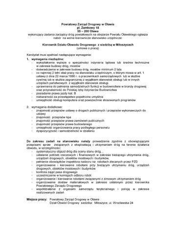 3RZLDWRZ\=DU] G'URJRZ\Z2áDZLH pl. Zamkowy 18 55 –2áDZD Z\NRQXM F\]DGDQLD]DU]GF\GUyJSRZLDWRZ\FKQDREV]DU]H3RZLDWX2áDZVNLHJRRJáDV]D QDEyUQDZROQHNLHURZQLF]HVWDQRZLVNRXU] GQLF]H - zycach .LHURZQLN']LDáX 2EZRGX'URJRZHJR]VLHG]LE Z0LáRV XPRZDRSUDF .DQG\GDWPXVLVSHáQLDüQDVW 1. Z\PDJDQLDQLH]E - GQH * SXMFHZ\PDJDQLD * Z\NV]WDáFHQLH Z\ V]H R VSHFMDOQR FL LQ \QLHULD O GRZD OXE UHGQLH WHFKQLF]QH w zakresie budowy dróg, mostów - - GR ZLDGF]HQLHZ]DNUHVLHEXGRZ\GUyJPRVWyZ * minimum 2 lata GQLF]\PRNWyU\PPRZDZDUW XVWDZ\]GQLDPDUFDURSUDFRZQLNDFKVDPRU]GRZ\FKOXEZVáX*ELH F\ZLOQHMOXEZVáX*ELH]DJUDQLF]QHM]Z\MWNLHPVWDQRZLVNREVáXJLOXEZLQQ\FK XU] GDFKSDVWZRZ\FK]Z\MWNLHPVWDQRZLVNREVáXJL XSUDZQLHQLDGRSHáQLHQLDVDPRG]LHOQ\FKIXQNFMLZEXGRZQLFWZLHZEUDQ*\GURJRZHM RUD]SU]\QDOH*QRüGR3ROVNLHM,]E\,Q*\QLHUyZ%XGRZQLFWZD FRQDMPQLHMOHWQLVWD SUDF\QDVWDQRZLVNXXU] posiadanie prawa jazdy kat. B SVWZRSRSHáQLRQHXP\OQLH WQRüREVáXJLNRPSXWHUDRUD]SRZV]HFKQLHVWRVRZDQ\FKSURJUDPyZ QLHNDUDOQR ü]DSU]HVW XPLHM 2. wymagania dodatkowe: - ]QDMRPRüSU]HSLVyZXVWDZ\RGURJDFKSXEOLF]Q\FKLSU]HSLVyZZ\NRQDZF]\FKGR ustawy - ]QDMRPRüSU]HSLVyZNSD - ]QDMRPRüSU]HSLVyZSUDZD]DPyZLHSXEOLF]Q\ ch - ]QDMRPRüSU]HSLVyZSUDZDEXGRZODQHJR - XPLHM WQRüRUJDQL]RZDQLDSUDF\SRGOHJáHJRSHUVRQHOX - G\VSR]\F\MQRüLVDPRG]LHOQRüZG]LDáDQLX 'R ]DNUHVX ]DGD ]XMF\PL * ]DQ\FK ] HNVSORDWDFM L XWU]\PDQLHP GUyJ QD WHUHQLH G]LDáDQLD QD VWDQRZLVNX QDOH \ SURZDG]HQLH ]JRGQLH ] RERZL SU]HSLVDPL VSUDZ ]ZL REZRGXZV]F]HJyOQR FL - systematyczny objazd dróg dla oceny stanu dróg, , XVWDODQLH SRWU]HE U]HF]RZ\FK L ILQDQVRZ\FK Z ]DNUHVLH ELH *FHJR XWU]\PDQLD GUyJ XU] G]H GURJRZ\FKRELHNWyZPRVWRZ\FKLEXG\QNyZ - SHáQLHQLHRERZL - NRQWUROD]DM ]NyZLQVSHNWRUDQDG]RUXQDURERWDFK]OHFDQ\FKSU]H]3=' *F\P XWU]\PDQLX GUyJ XU]G]H RUJDQL]RZDQLH L NLHURZDQLH URERWDPL SU]\ ELH drogowych, obiektów mostowych i budynków üSDVDGURJRZHJR uczestniczenie w komisjach odbioru robót oUJDQL]RZDQLHLNLHURZDQLHURERWDPL]ZL]DQ\PL]]LPRZ\PXWU]\PDQLHPGUyJ RUJDQL]RZDQLH GRVWDZ PDWHULDáRZ\FK Z ]DNUHVLH XVWDORQ\P SU]H] NLHURZQLND 3RZLDWRZHJR=DU] - ZVSyáG]LDáDQLH GX'URJRZHJR ] RUJDQDPL realizoZDQ\FK]DGD Miejsce pracy: 3RZLDWRZ\=DU] - VDPRU] GX WHU\WRULDOQHJR L SROLFM Z G'URJRZ\Z2áDZLH ']LDá 2EZyG'URJRZ\VLHG]LED0LáRV]\FHXO:URFáDZVND ]DNUHVLH Wymagane dokumenty: 1. List motywacyjny. 2. &9]XZ]JO GQLHQLHPGRNáDGQHJRSU]HELHJXSUDF\]DZRGRZHM 3. 2ZLDGF]HQLDRWUHFL * QDSU]HWZDU]DQLHPRLFKGDQ\FKRVRERZ\FK]DZDUW\FKZRIHUFLHSUDF\ GQ\FKGRUHDOL]DFMLSURFHVXUHNUXWDFML]JRGQLH]XVWDZ]GQLD VLHUSQLDURRFKURQLHGDQ\FKRVRERZ\FK']8]U1USR]]Sy(Q ]PRUD]XVWDZ]GQLDPDUFDURSUDFRZQLNDFKVDPRU]GRZ\FK']8] UQUSR]]Sy(Q]P .VHURNRSL G\SORPXXNRF]RQ\FKVWXGLyZOXEZLDGHFWZDV]NROQHJR .VHURNRSL XSUDZQLHEXGRZODQ\FKLSU]\QDOH*QRFLGR3,,% NVHURNRSLH]DZLDGF]HRXNRF]RQ\FKNXUVDFKLV]NROHQLDFK .VHURNRSLHZLDGHFWZSUDF\ :\UD DP]JRG GODSRWU]HEQLH]E 4. 5. 6. 7. 8. Kserokopia prawa jazdy 9. 2ZLDGF]HQLHRQLHNDUDOQRFL Oferty pisemne zaw LHUDMFH OLVW PRW\ZDF\MQ\ &9 ZUD] ] Z\PDJDQ\PL GRNXPHQWDPL * QDOH \ VNáDGDü RVREL FLH OXE OLVWRZQLH Z 6HNUHWDULDFLH w kopertach z dopiskiem: „ nabór na stanowisko - Drogowego ”. 3RZLDWRZHJR =DU] GX 'URJRZHJRZ2áDZLHSO=DPNRZ\ 2áDZDZWHUPLQLHGRGQLDPDMDU 2WHUPLQLHLPLHMVFXSRVW telefonicznie. -Obwodu .LHURZQLN ']LDáX SRZDQLDNZDOLILNDF\MQHJRNDQG\GDFL]RVWDQSRZLDGRPLHQL