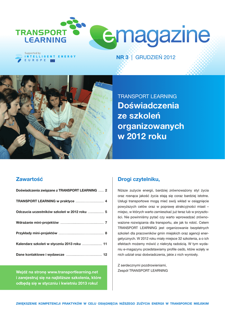Nr 3 | grudzień 2012 TRANSPORT LEARNING Doświadczenia ze szkoleń organizowanych w 2012 roku Zawartość Drogi czytelniku, Doświadczenia związane z TRANSPORT LEARNING ....... 2 Niższe zużycie energii, bardziej zrównoważony styl życia oraz rosnąca jakość życia stają się coraz bardziej istotne. TRANSPORT LEARNING w praktyce . ............................. 4 Usługi transportowe mogą mieć swój wkład w osiągnięcie powyższych celów oraz w poprawę atrakcyjności miast – Odczucia uczestników szkoleń w 2012 roku .................. 5 miejsc, w których warto zamieszkać już teraz lub w przyszłości. Nie powinniśmy pytać czy warto wprowadzać zrówno- Wdrażanie mini-projektów ............................................... 7 ważone rozwiązania dla transportu, ale jak to robić. Celem TRANSPORT LEARNING jest organizowanie bezpłatnych Przykłady mini-projektów ................................................. 8 szkoleń dla pracowników gmin miejskich oraz agencji energetycznych. W 2012 roku miały miejsce 32 szkolenia, a o ich Kalendarz szkoleń w styczniu 2013 roku ...................... 11 efektach możemy mówić z niekrytą radością. W tym wydaniu e-magazynu przedstawiamy profile osób, które wzięły w Dane kontaktowe i wydawcze ....................................... 12 nich udział oraz doświadczenia, jakie z nich wyniosły. Z serdecznymi pozdrowieniami, Wejdź na stronę www.transportlearning.net i zarejestruj się na najbliższe szkolenia, które odbędą się w styczniu i kwietniu 2013 roku! Zespół TRANSPORT LEARNING Zwiększenie kompetencji praktyków w celu osiągnięcia niższego zużycia energii w transporcie miejskim Zwiększenie kompetencji praktyków w celu osiągnięcia niższego zużycia energii w transporcie miejskim NR 3 | grudzień 2012 Doświadczenia związane z TRANSPORT LEARNING Pierwsza połowa wszystkich zaplanowanych szkoleń TRANSPORT TRAINING miała miejsce od maja do października 2012 roku. Łącznie odbyły się 32 wydarzenia w ośmiu krajach europejskich i wzięło w nich udział ponad 580 osób. Na kolejnych stronach przedstawiamy osobiste doświadczenia uczestników szkoleń TRANSPORT LEARNING (TL) oraz wpływ, jaki wywarły one na ich codzienną pracę. Pablo Barco Ballesteros Red de Ciudades que Caminan (Sieć Miast Przyjaznych Pieszym), Koordynator Techniczny, Hiszpania Antonio Disi Włoska Agencja Energii, Jednostka Techniczna ds. Wydajności Energetycznej, Włochy Miałem okazję uczestniczyć w trzech różnych modu- Jestem naukowcem i jestem zaangażowany w promocję łach TRANSPORT LEARNING: Zarządzanie przestrzenią i rozpowszechnianie wydajności energetycznej w różnych parkingową, ograniczenia dostępu i kontrola prędkości, sektorach, w tym również w transporcie. W czasie szkole- Projektowanie ulic, krajobraz ulicy i uspokajan ruchu oraz nia z zakresu komunikacji zdobyłem cenne umiejętności z Projektowanie i wdrażanie kampanii na rzecz zrównowa- dziedziny transferu technologii oraz wspierania instytucji pu- żonej mobilności. Szkolenie obejmowało rozwiązywanie blicznych we wdrażaniu zrównoważonej polityki mobilności. problemów technicznych przedstawionych przez pracują- W czasie dwudniowego szkolenia poznałem techniki nego- cych w gminach miejskich specjalistów, którzy omawiali cjacji oraz techniki ułatwiające komunikację, które wzboga- głównie trudności związane z mobilnością w hiszpańskich ciły zakres moich umiejętności. W szczególności podobał miastach. Wiedza zdobyta w czasie szkolenia znajduje za- mi się moduł edukacyjny oraz tematy, które omówiono w stosowanie w naszych codziennych zadaniach wykonywa- sposób wyczerpujący i jasny na praktycznym etapie szko- nych w ramach Red de Ciudades que Caminan (Sieć Miast lenia. Mini-projekt, nad którym pracuję, dotyczy transportu Przyjaznych Pieszym) – inicjatywy na rzecz promocji mobil- pionowego w miastach (windy, schody, itp.) i związany jest ności wśród pieszych, wspieranej przez Roberta Pressla i bezpośrednio z instytucją, dla której pracuję. Karla Reitera. Strona 2/12 Zwiększenie kompetencji praktyków w celu osiągnięcia niższego zużycia energii w transporcie miejskim NR 3 | grudzień 2012 Katarzyna Kyc Zarząd Infrastruktury Komunalnej i Transportu (Kraków); Kierownik Działu Rozwoju i Pozyskiwania Funduszy Europejskich, Polska Evgeni Krussev Miejskie Centrum Mobilności (Sofia), Bułgaria Moduł: Zarządzanie przestrzenią parkingową, ograni- Jako ekspert z Miejskiego Centrum Mobilności w Sofii, czenia dostępu i kontrola prędkości. Poznałam interesują- wziąłem udział w szkoleniu TL na temat modeli transportu ce rozwiązania dla problemów związanych ze zbyt częstym publicznego, które zostało zorganizowane przez Agencję wydawaniem pozwoleń na parkowanie dla osób niepełno- Energii miasta Płowdiw. Szkolenie obejmowało główne pro- sprawnych w Wielkiej Brytanii. Interesujące wnioski: Dla blemy dotyczące transportu publicznego, z którymi stykają mnie bardzo istotne było stwierdzenie, że po wybudowaniu się gminy miejskie. Przedyskutowano również dobre praktyki nowego parkingu należy zlikwidować odpowiednią ilość z krajów Europy Zachodniej, które można by wdrożyć w buł- ulicznych miejsc parkingowych. Oprócz tego zainteresowa- garskich miastach. Podsumowując, szkolenie było dla mnie ło mnie zarządzanie przestrzenią parkingową, a mianowicie, bardzo pożyteczne i chciałbym podziękować gospodarzom konieczność przeprowadzania kampanii społecznych pod- i organizatorom za świetną organizację oraz poświęcenie noszących świadomość. Istotne jest również przekonywanie uwagi każdemu uczestnikowi. kupców, że korzyści płynące z poprawy infrastruktury pieszej są tak samo ważne jak tworzenie miejsc parkingowych w pobliżu ich sklepów. Tamás Gmina Miejska Dunaújváros, Wydział Głównego Architekta oraz Ochrony Środowiska, Węgry Fabiola 