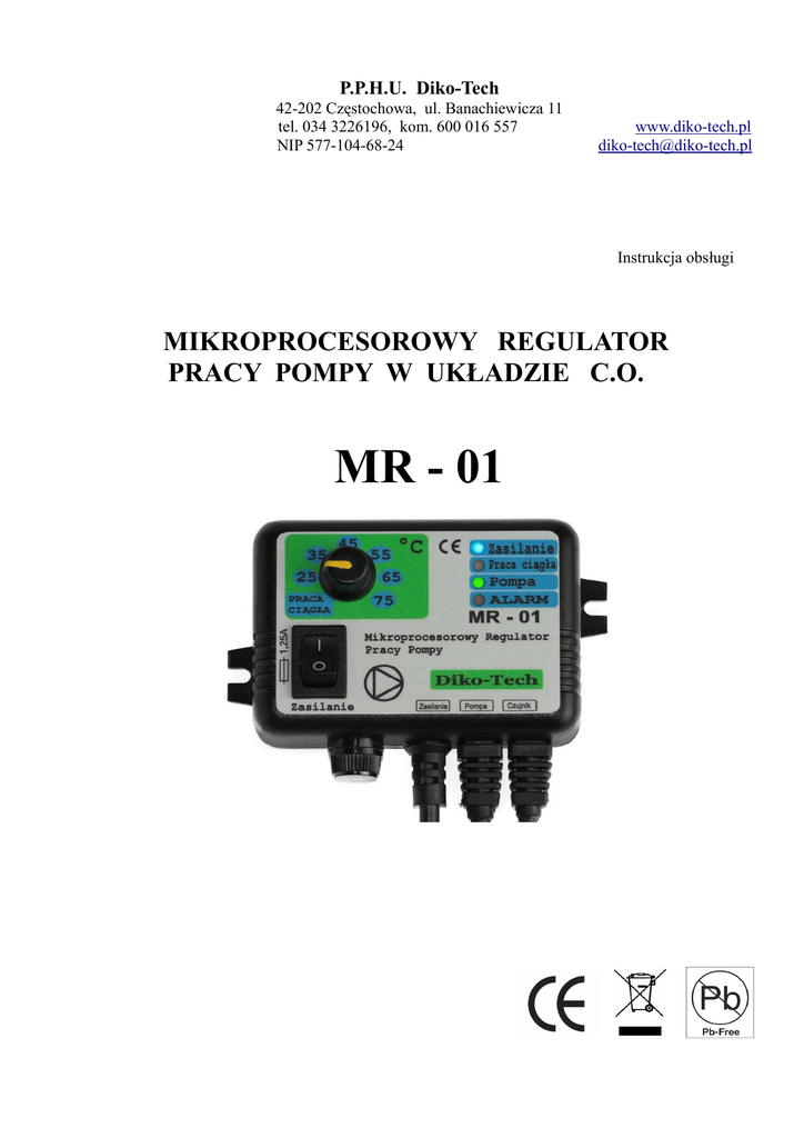 P.P.H.U. Diko-Tech 42-202 Częstochowa, ul. Banachiewicza 11 tel. 034 3226196, kom. 600 016 557 NIP 577-104-68-24 www.diko-tech.pl [email protected] Instrukcja obsługi MIKROPROCESOROWY REGULATOR PRACY POMPY W UKŁADZIE C.O. MR - 01 Przeznaczenie Regulator MR-01 przeznaczony jest do sterowania pracą pompy w układzie centralnego ogrzewania. Załączenie następuje po osiągnięciu temperatury zadanej a wyłączenie o 3°C poniżej. W okresie letnim dodatkowo chroni pompę przed zastaniem (funkcja Anty-Stop). Funkcje Sterownika - Automatyczna lub ciągła praca pompy. - Diody sygnalizujące stan pracy urządzenia. - Funkcja Anty-Stop, uruchamia pracę pompy co 7 dni na 15 sekund. - Funkcja Anty-zamarzanie, uruchamia pompę przy temp. 5°C. - Sygnalizacja dźwiękowa i optyczna informująca o przekroczeniu temperatury 90°C. - Ręczne załączanie i wyłączenie pompy. - Wbudowana sygnalizacja dźwiękowa. - Automatyczne załączenie pompy podczas awarii czujnika. - Sygnalizacja świetlna informująca o awarii czujnika. - Pamięć ustawień przy braku zasilania. Parametry techniczne. Zakres regulacji temperatury 25°C ÷ 75°C Histereza 3°C Napięcie zasilania 230V/50Hz z przewodem ochronnym PE Pobór mocy 1,5 VA Obciążenie wyjścia Do 140W Zabezpieczenie 1,25A Temperatura pracy 0°C do 50°C Funkcja Anty-Stop co 7 dni na 15 sekund Funkcja Anty-zamarzanie od 5°C Sygnalizacja alarmowa Poniżej 5°C, oraz powyżej 90°C Stopień ochrony obudowy IP 30 Wymiary obudowy 90 x 64 x 33 Wymiar całkowity urządzenia 107 x 64 x 49 Czujnik, wymiary Ø 6,5 x 50mm, przewód 2m Długość przewodów Zasilanie, pompa - 1,5m z przewodem ochronnym Strona 2 Sterownik może być użytkowany tylko w obrębie gospodarstwa domowego i podobnego. Przed przystąpieniem do montażu, napraw czy konserwacji oraz podczas wykonywania wszelkich prac przyłączeniowych należy bezwzględnie odłączyć zasilanie sieciowe poprzez wyciągnięcie wtyczki zasilającej z gniazdka zasilającego oraz upewnić się czy zaciski i przewody elektryczne nie są pod napięciem. Po wyłączeniu sterownika za pomocą przełącznika w pozycję „0” na przewodach sterowniczych występuje napięcie niebezpieczne. Sterownik nie może być wykorzystywany niezgodnie z jego przeznaczeniem. Należy zastosować dodatkową automatykę zabezpieczającą instalację hydrauliczną oraz elektryczną przed skutkami awarii bądź błędów w jego oprogramowaniu. Należy dobrać odpowiednie wartości parametrów do danego typu układu hydraulicznego uwzględniając wszystkie warunki pracy instalacji. Błędny dobór parametrów może doprowadzić do stanu awaryjnego w instalacji. Modyfikacja zaprogramowanych parametrów powinna być przeprowadzona tylko przez osobę zaznajomioną z niniejszą instrukcją. Stosować tylko w obiegach grzewczych wykonanych zgodnie z obowiązującymi przepisami. Instalacja elektryczna powinna być zabezpieczona bezpiecznikiem dobranym odpowiednio do stosowanego obciążenia. W sterowniku zastosowano odłączanie elektroniczne podłączanych urządzeń zgodnie z normą PN-EN 60730-1 (działanie typu 2Y). Oznacza to że przy zasilaniu sterownika napięciem sieciowym na wyjściach pomp występuje napięcie niebezpieczne nawet gdy nie są wysterowane. Chronić sterownik przed dostępem dzieci oraz osób niepowołanych. UWAGA URZADZENIE ELEKTRYCZNE POD NAPIĘCIEM Montaż urządzenia należy powierzyć osobie posiadającej odpowiednie uprawnienia elektryczne!!! Przed uruchomieniem sterownika należy dokonać skuteczności zerowania pomp, oraz pomiaru izolacji przewodów elektrycznych. Przed dokonaniem jakichkolwiek czynności związanych z zasilaniem urządzenia, podłączeniem pompy oraz montażem czujnika należy upewnić się że sterownik nie jest pod napięciem sieci. (odłącz wtyczkę zasilającą z gniazdka) Strona 3 Montaż Sterownika. Przed dokonaniem jakichkolwiek czynności związanych z zasilaniem urządzenia, podłączeniem pompy oraz montażem czujnika należy upewnić się że sterownik nie jest pod napięciem sieci. UWAGA!!! Montaż urządzenia należy powierzyć osobie posiadającej odpowiednie uprawnienia elektryczne!!! Przed uruchomieniem sterownika należy dokonać skuteczności zerowania pompy, kotła oraz pomiaru izolacji przewodów elektrycznych. Montaż czujnika temperatury. Czujnik temperatury należy umocować za pomocą opaski zaciskowej tak aby bezpośrednio dotykał rury wyjściowej (woda ciepła). Na czujnik należy założyć izolację termiczną i zamocować. Należy zachować szczególną ostrożność na przewód czujnika aby nie dotykał elementów nagrzewających się oraz samego kotła. Montaż pompy Montaż urządzenia należy powierzyć osobie posiadającej odpowiednie uprawnienia elektryczne!!! 1. Odłącz sterownik z zasilania sieciowego przez wyciągnięcie wtyczki zasilającej. 2. Zdejmujemy pokrywę puszki pompy. 3. Do zacisku ochronnego oznaczonego PE podłączyć w puszce żyłę koloru zielono-żółtego. 4. Żyłę niebieską podłączyć do oznaczenia N, brązową żyłę podłączyć do zacisku L. 5. Sprawdzić poprawność podłączenia przewodów i przykręcić pokrywę. Błędne podłączenie lub zwarcie może spowodować uszkodzenie sterownika. 6. Przed uruchomieniem sterownika należy dokonać skuteczności zerowania pompy, kotła oraz pomiaru izolacji przewodów elektrycznych. Kolory przewodów zasilających pompę : żółto-zielony - przewód ochronny PE (obudowa pompy) niebieski N (zasilanie pompy) brązowy L (zasilanie pompy) UWAGA nieprawidłowe podłączenie przewodów może spowodować uszkodzenie sterownika lub pompy c. o. Strona 4 Pierwsze uruchomienie. Przed włączeniem urządzenia do sieci upewnij się czy wszystko zostało prawidłowo podłączone. Po załączeniu urządzenia do sieci i przełączeniu przycisku Zasilanie w pozycję 1, sterownik wykona test i przejdzie do trybu praca automatyczna, sygnalizowane jest to zapaleniem się kontrolki zasilanie