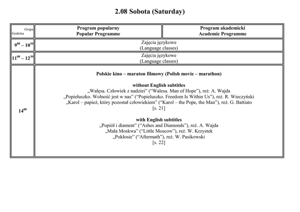 2.08 Sobota (Saturday) Grupa Godzina 900 – 1030 1100 – 1230 Program popularny Popular Programme Program akademicki Academic Programme Zajęcia językowe (Language classes) Zajęcia językowe (Language classes) Polskie kino – maraton filmowy (Polish movie – marathon) 1400 without English subtitles „Wałęsa. Człowiek z nadziei” (“Walesa. Man of Hope”), reż. A. Wajda „Popiełuszko. Wolność jest w nas” (“Popieluszko. Freedom Is Within Us”), reż. R. Wieczyński „Karol – papież, który pozostał człowiekiem” (“Karol – the Pope, the Man”), reż. G. Battiato [s. 21] with English subtitles „Popiół i diament” (“Ashes and Diamonds”), reż. A. Wajda „Mała Moskwa” (“Little Moscow”), reż. W. Krzystek „Pokłosie” (“Aftermath”), reż. W. Pasikowski [s. 22]