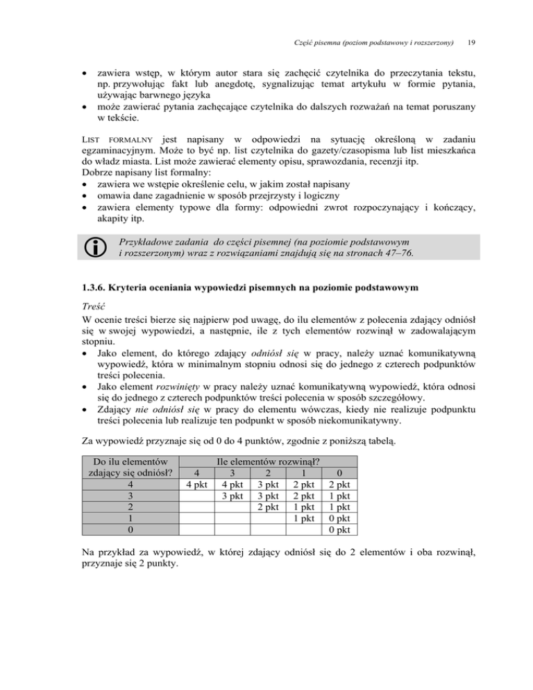 Część pisemna (poziom podstawowy i rozszerzony) 19 zawiera wstęp, w którym autor stara się zachęcić czytelnika do przeczytania tekstu, np. przywołując fakt lub anegdotę, sygnalizując temat artykułu w formie pytania, używając barwnego języka może zawierać pytania zachęcające czytelnika do dalszych rozważań na temat poruszany w tekście. jest napisany w odpowiedzi na sytuację określoną w zadaniu egzaminacyjnym. Może to być np. list czytelnika do gazety/czasopisma lub list mieszkańca do władz miasta. List może zawierać elementy opisu, sprawozdania, recenzji itp. Dobrze napisany list formalny: zawiera we wstępie określenie celu, w jakim został napisany omawia dane zagadnienie w sposób przejrzysty i logiczny zawiera elementy typowe dla formy: odpowiedni zwrot rozpoczynający i kończący, akapity itp. LIST FORMALNY Przykładowe zadania do części pisemnej (na poziomie podstawowym i rozszerzonym) wraz z rozwiązaniami znajdują się na stronach 47–76. 1.3.6. Kryteria oceniania wypowiedzi pisemnych na poziomie podstawowym Treść W ocenie treści bierze się najpierw pod uwagę, do ilu elementów z polecenia zdający odniósł się w swojej wypowiedzi, a następnie, ile z tych elementów rozwinął w zadowalającym stopniu. Jako element, do którego zdający odniósł się w pracy, należy uznać komunikatywną wypowiedź, która w minimalnym stopniu odnosi się do jednego z czterech podpunktów treści polecenia. Jako element rozwinięty w pracy należy uznać komunikatywną wypowiedź, która odnosi się do jednego z czterech podpunktów treści polecenia w sposób szczegółowy. Zdający nie odniósł się w pracy do elementu wówczas, kiedy nie realizuje podpunktu treści polecenia lub realizuje ten podpunkt w sposób niekomunikatywny. Za wypowiedź przyznaje się od 0 do 4 punktów, zgodnie z poniższą tabelą. Do ilu elementów zdający się odniósł? 4 3 2 1 0 Ile elementów rozwinął? 4 3 2 1 4 pkt 4 pkt 3 pkt 2 pkt 3 pkt 3 pkt 2 pkt 2 pkt 1 pkt 1 pkt 0 2 pkt 1 pkt 1 pkt 0 pkt 0 pkt Na przykład za wypowiedź, w której zdający odniósł się do 2 elementów i oba rozwinął, przyznaje się 2 punkty. 20 Informator o egzaminie maturalnym z języka angielskiego od roku szkolnego 2014/2015 Spójność i logika wypowiedzi W ocenie spójności bierze się pod uwagę, czy i w jakim stopniu tekst funkcjonuje jako całość dzięki jasnym powiązaniom (np. leksykalnym, gramatycznym) wewnątrz zdań oraz między zdaniami lub akapitami tekstu. W ocenie logiki wypowiedzi bierze się pod uwagę, czy i w jakim stopniu wypowiedź jest klarowna (np. czy nie jest jedynie zbiorem przypadkowo zebranych myśli). 2 pkt wypowiedź jest w całości lub w znacznej większości spójna i logiczna zarówno na poziomie poszczególnych zdań, jak i całego tekstu 1 pkt wypowiedź zawiera usterki w spójności/logice na poziomie poszczególnych zdań oraz/lub całego tekstu 0 pkt wypowiedź jest w znacznej mierze niespójna/nielogiczna; zbudowana jest z trudnych do powiązania w całość fragmentów Zakres środków językowych W ocenie zakresu środków językowych bierze się pod uwagę zróżnicowanie środków leksykalno-gramatycznych użytych w wypowiedzi. 2 pkt zadowalający zakres środków językowych; oprócz środków językowych o wysokim stopniu pospolitości w wypowiedzi występuje kilka precyzyjnych sformułowań 1 pkt ograniczony zakres środków językowych; w wypowiedzi użyte są głównie środki językowe o wysokim stopniu pospolitości 0 pkt bardzo ograniczony zakres środków językowych; w wypowiedzi użyte są wyłącznie najprostsze środki językowe Przez „precyzyjne sformułowania” rozumiemy wyrażanie myśli z wykorzystaniem słownictwa swoistego dla tematu i unikanie słów oraz środków o wysokim stopniu pospolitości, takich jak miły, interesujący, fajny. W precyzji wyrażania myśli mieści się również charakterystyczny dla danego języka sposób wyrażania znaczeń, np. There is a book on the table. zamiast On the table is a book. Poprawność środków językowych W ocenie poprawności środków językowych bierze się pod uwagę błędy gramatyczne, leksykalne i ortograficzne oraz ich wpływ na komunikatywność wypowiedzi. 2 pkt brak błędów nieliczne błędy niezakłócające komunikacji lub sporadycznie zakłócające komunikację 1 pkt liczne błędy niezakłócające komunikacji lub czasami zakłócające komunikację bardzo liczne błędy niezakłócające komunikacji 0 pkt liczne błędy często zakłócające komunikację bardzo liczne błędy czasami lub często zakłócające komunikację Część pisemna (poziom podstawowy i rozszerzony) 21 Uwagi dodatkowe 1. Wypowiedź jest oceniana na 0 punktów w każdym kryterium, jeżeli jest: nieczytelna LUB całkowicie niezgodna z poleceniem LUB niekomunikatywna dla odbiorcy (np. napisana fonetycznie). 2. Praca napisana niesamodzielnie, np. zawierająca fragmenty odtworzone z podręcznika, zadania zawartego w arkuszu egzaminacyjnym lub innego źródła, w tym internetowego, lub przepisane od innego zdającego, jest powodem do unieważnienia części pisemnej egzaminu z języka obcego. W przypadku stwierdzenia podczas przeprowadzania egzaminu lub podczas sprawdzania pracy egzaminacyjnej niesamodzielnego rozwiązywania przez zdającego zadań zawartych w arkuszu egzaminacyjnym dyrektor komisji okręgowej, w porozumieniu z dyrektorem Komisji Centralnej, unieważnia zdającemu część pisemną egzaminu maturalnego z danego przedmiotu. 3. Jeżeli wypowiedź zawiera 60 słów lub mniej, jest oceniana wyłącznie w kryterium treści. W pozostałych kryteriach przyznaje się 0 punktów. 4. Jeżeli za wypowiedź przyznano 0 punktów w kryterium treści, we wszystkich pozostałych kryteriach przyznaje się również 0 punktów. 5. Jeżeli za wypowiedź przyznano 1 punkt w kryterium treści, we wszystkich pozostałych kryteriach można również przyznać maksymalnie po 1 punkcie. 6. 