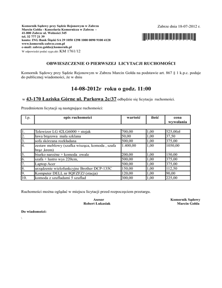 Komornik Sądowy przy Sądzie Rejonowym w Zabrzu Marcin Gołda - Kancelaria Komornicza w Zabrzu 41-800 Zabrze ul. Wolności 345 tel. 32 777 21 39 konto: ING Bank Śląski SA 29 1050 1298 1000 0090 9100 4128 www.komornik-zabrze.com.pl e-mail: [email protected] W odpowiedzi podać sygn.akt: KM Zabrze dnia 18-07-2012 r. *8012071800022* 1761/12 OBWIESZCZENIE O PIERWSZEJ LICYTACJI RUCHOMOŚCI Komornik Sądowy przy Sądzie Rejonowym w Zabrzu Marcin Gołda na podstawie art. 867 § 1 k.p.c. podaje do publicznej wiadomości, że w dniu 14-08-2012r roku o godz. 11:00 w 43-170 Łaziska Górne ul. Parkowa 2c/37 odbędzie się licytacja ruchomości. Przedmiotem licytacji są następujące ruchomości: l.p. 1. 2. 3. 4. 5. 6. 7. 8. 9. 10. opis ruchomości Telewizor LG 42LG6000 + stojak ława brązowa mała szklana sofa skórzana rozkładana zestaw meblowy (szafka wisząca, komoda , szafa brąz ,krem) biurko narożne + komoda owale szafa + lustro wys 220cm, Laptop Acer urządzenie wielofunkcyjne Brother DCP-135C Komputer DELL nr 8QFZFZJ (stacja) komoda z szufladami 5 szuflad wartość ilość cena wywołania 700,00 50,00 500,00 1.400,00 1,00 1,00 1,00 1,00 525,00zł 37,50 375,00 1050,00 200,00 500,00 500,00 150,00 120,00 300,00 1,00 1,00 1,00 1,00 1,00 1,00 150,00 375,00 375,00 112,50 90,00 225,00 Ruchomości można oglądać w miejscu licytacji przed rozpoczęciem przetargu. Asesor Robert Łukasiak Do wiadomości: \ Komornik Sądowy Marcin Gołda