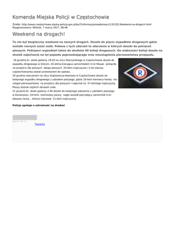 Komenda Miejska Policji w Częstochowie Źródło: http://www.czestochowa.slaska.policja.gov.pl/ka7/informacje/wiadomosci/131232,Weekend-na-drogach.html Wygenerowano: Wtorek, 7 marca 2017, 06:46 Weekend na drogach! To nie był bezpieczny weekend na naszych drogach. Doszło do pięciu wypadków drogowych gdzie zostało rannych sześć osób. Połowa z tych zdarzeń to zdarzenia w których doszło do potrąceń pieszych. Policjanci wyjeżdżali także do skutków 69 kolizji drogowych. Do większości kolizji doszło na skutek najechania na tył pojazdu poprzedzającego oraz nieustąpienia pierwszeństwa przejazdu. 19 grudnia br. około godziny 19.20 na ulicy Starzyńskiego w Częstochowie doszło do wypadku drogowego w którym, 42-letnia kierująca samochodem m-ki Nissan potrąciła na przejściu dla pieszych dwoje pieszych. 20-letni mężczyzna i 5 lat starsza częstochowianka zostali przewiezieni do szptala. 20 grudnia wieczorem na ulicy Szajnowicza-Iwanowa w Częstochowie doszło do kolejnego wypadku drogowego z udziałem pieszego, gdzie 19-letni kierowca hondy nie ustąpił pierwszeństwa na przejściu dla pieszych i najechał na 57-letniego mężczyznę. Pieszy doznał cięzkich obrażeń ciała. 21 grudnia br. około godziny 2.40 doszło do kolejnego zdarzenia z udziałem pieszego. w Koniecpolu, 19-letni, nietrzeźwy pieszy nagle wszedł pod jadący samochód m-ki daewoo nexia, , którym kierował 21-letni mężczyzna. Policja apeluje o ostrożność na drodze! Ocena: 4/5 (1) Tweetnij