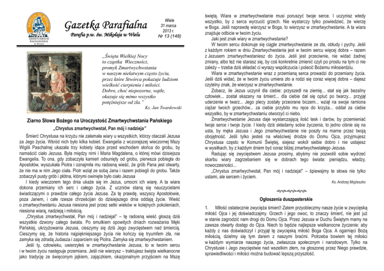 Gazetka Parafialna Parafia p.w. p.w. św. Mikołaja w Wielu Wiele 31 marca 2013 r. Nr 13 (148) „Święta Wielkiej Nocy to cząstka Wieczności, promyk Zmartwychwstania w naszym niełatwym często życiu, przez które Stwórca pokazuje ludziom wielkość cierpienia i miłości. Dobro, choć niepozorne, wątłe, okazuje się mimo wszystko potężniejsze od zła.” Ks. Jan Twardowski Ziarno Słowa Bożego na Uroczystość Zmartwychwstania Pańskiego „Chrystus zmartwychwstał, Pan mój i nadzieja” Śmierć Chrystusa na krzyżu nie załamała wiary u wszystkich, którzy otaczali Jezusa za Jego życia. Wśród nich było kilka kobiet. Ewangelia z wczorajszej wieczornej Mszy Wigilii Paschalnej ukazała trzy kobiety idące przed wschodem słońca do grobu, by namaścić ciało Jezusa. Była między nimi i Maria Magdalena, o której mówi dzisiejsza Ewangelia. To ona, gdy zobaczyła kamień odsunięty od grobu, pierwsza pobiegła do Apostołów, wyszukała Piotra i oznajmiła mu radosną wieść, że grób Pana jest otwarty, że nie ma w nim Jego ciała. Piotr wziął ze sobą Jana i razem pobiegli do grobu. Także zobaczyli pusty grób i płótna, którymi owinięte było ciało Jezusa I kiedy wieczorem tego dnia ukaże się im Jezus, umocni ich wiarę. A ta wiara dokona przemiany ich serc i całego życia. Z uczniów staną się nauczycielami świadczącymi o prawdzie całego życia Jezusa. Za tę prawdę, wszyscy Apostołowie, poza Janem, i całe rzesze chrześcijan do dzisiejszego dnia oddają życie. Wieść o zmartwychwstaniu Jezusa niesiona jest przez setki wieków w kolejnych pokoleniach, niesiona wiarą, nadzieją i miłością. „Chrystus zmartwychwstał, Pan mój i nadzieja!” – tę radosną wieść głoszą dziś wszystkie dzwony całego świata. Po smutkiem spowitych dniach rozważania Męki Pańskiej, ukrzyżowania Jezusa, cieszymy się dziś Jego zwycięstwem nad śmiercią. Cieszymy się, że historia najpiękniejszego życia nie kończy się tryumfem zła, nie zamyka się zdradą Judasza i zaparciem się Piotra. Zamyka się zmartwychwstaniem. Jeśli ty, człowieku, uwierzyłeś w zmartwychwstanie Jezusa, to w twoim sercu i w twoim życiu następuje przemiana. Jeśli nie wierzysz – traktujesz święta wielkanocne jako tradycję ze święconym jajkiem, zajączkiem, okazjonalnym przyjściem na Mszę świętą. Wiara w zmartwychwstanie musi poruszyć twoje serce. I uczynisz wtedy wszystko, by z serca wyrzucić grzech. Nie wystarczy tylko powiedzieć, że wierzę w Boga. Jeśli naprawdę wierzysz w Boga, to wierzysz w zmartwychwstanie. A ta wiara znajduje odbicie w twoim życiu. Jaki jest znak wiary w zmartwychwstanie? W twoim sercu dokonuje się ciągle zmartwychwstanie ze zła, obłudy i pychy. Jeśli z każdym rokiem w dniu Zmartwychwstania jest w twoim sercu więcej dobra – razem z Jezusem zmartwychwstaniesz do życia. Jeśli jest przeciwnie, nie widać żadnej zmiany, albo też nie starasz się, by coś konkretnie zmienić czyli po prostu na tym ci nie zależy – trzeba dziś składać ci wyrazy współczucia i polecić Bożemu miłosierdziu. Wiara w zmartwychwstanie wraz z przemianą serca prowadzi do przemiany życia. Jeśli dziś widać, że w twoim życiu umiera zło a rodzi się coraz więcej dobra – dajesz czytelny znak, że wierzysz w zmartwychwstanie. Zobacz, ile Jezus uczynił dla ciebie: przyszedł na ziemię... stał się jak bezsilny człowiek... został skazany na śmierć... dla ciebie dał się opluć po twarzy... przyjął uderzenie w twarz... Jego plecy zostały przeorane biczem... wziął na swoje ramiona ciężar twoich grzechów... za ciebie przybito mu ręce do krzyża... oddał za ciebie wszystko, by w zmartwychwstaniu otworzyć ci niebo. Zmartwychwstanie Jezusa daje wystarczającą ilość łask i darów, by przemieniać twoje serce i twoje życie. I kiedy dziś składamy sobie życzenia, to jedno ciśnie się na usta, by męka Jezusa i Jego zmartwychwstanie nie poszły na marne przez twoją obojętność. Jeśli tylko jesteś na właściwej drodze do Domu Ojca, przyjmujesz Chrystusa często w Komunii Świętej, siejesz wokół siebie dobro i nie ustajesz w wysiłkach, by z każdym dniem być coraz bliżej zmartwychwstałego Jezusa. Radując się zwycięstwem Jezusa prosimy, abyśmy nie pozwolili sobie wydrzeć skarbu wiary zagrzebaniem się w dobrach tego świata: pieniądzu, władzy, nowoczesności... „Chrystus zmartwychwstał, Pan mój i nadzieja!” – śpiewajmy te słowa nie tylko ustami, ale sercem i życiem. Ks. Andrzej Mojżeszko Ogłoszenia duszpasterskie 1. Miłość ostatecznie zwycięża śmierć! Zatem przyobleczmy nasze życie w zwycięską miłość Ojca i jej doświadczajmy. Grzech i jego owoc, to znaczy śmierć, nie jest już w stanie zagrodzić nam drogi do Domu Ojca. Przez Jezusa w Duchu Świętym mamy na zawsze otwarty dostęp do Ojca. Niech to będzie najlepsze wielkanocne życzenie: aby każdy z nas doświadczył i przyjął tę zwycięską miłość Boga Ojca. A ogarnięci Bożą miłością, dzielmy się tym darem z naszymi braćmi. Potrzeba bowiem tej miłości w każdym wymiarze naszego życia, zwłaszcza społecznym i narodowym. Tylko na Chrystusie i Jego zwycięstwie nad wszelkim złem, na głoszonej przez Niego prawdzie, sprawiedliwości i miłości można budować lepszą przyszłość. 2. Jutro drugi dzień świąt – Wielkanocny Poniedziałek. Pamiętajmy, że nasza radość i cała przedświąteczna krzątanina miały swój powód przede wszystkim w wydarzeniach Męki, Śmierci i Zmartwychwstania Pana Jezusa. Zatem zadbajmy o nasz udział we Mszy Świętej. Zachęcam także do uczestnictwa w Mszach Świętych przez całą oktawę Wielkanocy, które w naszym kościele są celebrowane według świątecznego następującego porządku: w Wielu o godzinie 800, 1000 i 1130 zaś we Wdzydzach Tucholskich o godzinie 1300. 3. Dzisiejsza niedziela jest dniem szczególnej łaski w naszej wspólnocie, albowiem dzi