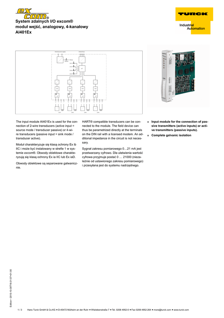 System zdalnych I/O excom® moduł wejść, analogowy, 4-kanałowy AI401Ex The input module AI401Ex is used for the connection of 2-wire transducers (active input = source mode / transducer passive) or 4-wire transducers (passive input = sink mode / transducer active). Moduł charakteryzuje się klasą ochrony Ex ib IIC i może być instalowany w strefie 1 w systemie excom®. Obwody obiektowe charakteryzują się klasą ochrony Ex ia IIC lub Ex iaD. ■ Input module for the connection of passive transmitters (active inputs) or active transmitters (passive inputs). ■ Complete galvanic isolation Sygnał zakresu pomiarowego 0…21 mA jest przetwarzany cyfrowo. Dla ułatwienia wartość cyfrowa przyjmuje postać 0 … 21000 (niezależnie od ustawionego zakresu pomiarowego) i przesyłana jest do systemu nadrzędnego. Edition • 2015-10-30T16:01:07+01:00 Obwody obiektowe są separowane galwanicznie. HART® compatible transducers can be connected to the module. The field device can thus be parametrized directly at the terminals on the DIN rail with a licensed modem. An additional impedance in the circuit is not necessary. 1/3 Hans Turck GmbH & Co.KG ñ D-45472 Mülheim an der Ruhr ñ Witzlebenstraße 7 ñ Tel. 0208 4952-0 ñ Fax 0208 4952-264 ñ [email protected] ñ www.turck.com System zdalnych I/O excom® moduł wejść, analogowy, 4-kanałowy AI401Ex AI401Ex 6884204 Napięcie zasilania Pobór mocy Separacja galwaniczna Liczba kanałów centralne zasilanie z płyty bazowej ð 2.2 W complete galvanic isolation acc. to EN 60079-11 4-kanałowy Obwody wejściowe Napięcie zasilania Parametry przeciążeniowe Kontrola niskiego poziomu Zwarcie Przerwa w obwodzie iskrobezpieczeństwo zgodne z EN 60079-11 0/4…20 mA 15 VDC at 20 mA > 21 mA < 3.6 mA > 24 mA (tylko z „aktywnym zerem“) < 2 mA (tylko z „aktywnym zerem“) Rozdzielczość Błąd liniowości Dryft temperaturowy czas narastania/czas zanikania Maks. tolerancja pomiaru pod wpływem EMC 14 Bit ð 0.05 % pełna skala ð 0.005 %/K ð 50 ms (10 … 90 %) ð 0.1 % Approvals Dopuszczenie Ex zgodne z odpowiednimi certyfikatami Oznaczenie urządzenia Oznaczenie urządzenia Wartość maksymalna: Maks. napięcie wyjścia Uo Maks. prąd wyjścia Io Maks. moc wyjścia Po Rezystancja wewnętrzna Ri Charakterystyka Internal inductance/capacitance Li/Ci PTB 03 ATEX 2217 É II 2 (1) G Ex ib [ia] IIC T4 É II (1) D [Ex iaD] Terminal zaciskowy: 1+2 ð 19.1 V ð 90 mA ð 615 mW 304 ò Trapezoidalna Li Ci External inductance/capacitance Lo/Co Lo [mH] Co [nF] Wartość maksymalna Maks. napięcie wyjścia Uo Maks. prąd wyjścia Io Maks. moc wyjścia Po Charakterystyka Wewnętrzna indukcyjność/pojemność Li/Ci pomijalnie mały pomijalnie mały IIC 0.20 170 IIB 1.0 960 Terminal zaciskowy: 3+4 ð 6 V ð 2.5 mA ð 4 mW liniowe Li Ci External inductance/capacitance Lo/Co Lo [mH] Co [nF] Edition • 2015-10-30T16:01:07+01:00 Wymiary Typ Nr kat. pomijalnie mały pomijalnie mały IIC 10 1900 IIB 20 8600 Wskazanie Gotowość do pracy Stan/ Błąd element pozycjonujący 1 x green / red 4 x czerwony Materiał obudowy Tryb połączenia tworzywo sztuczne moduł podłączany do kasety Stopień ochrony Temperatura pracy Wilgotność względna Test wibracyjny Test przeciążeniowy/wstrząsowy EMC IP20 -20…+70 °C ð 95 % przy 55 °C zgodnie z EN 60068-2 zgodnie z IEC 60068-2-6 zgodnie z IEC 60068-2-27 zgodnie z EN 61326-1 (2006) zgodnie z Namur NE21 (2007) 77 zgodnie z SN 29500 (Ed. 99) 40 °C 18 x 118 x 103 mm 75 g MTTF Wymiary Waga 2/3 Hans Turck GmbH & Co.KG ñ D-45472 Mülheim an der Ruhr ñ Witzlebenstraße 7 ñ Tel. 0208 4952-0 ñ Fax 0208 4952-264 ñ [email protected] ñ www.turck.com System zdalnych I/O excom® moduł wejść, analogowy, 4-kanałowy AI401Ex ATEX cFMus TR CU CMI INMETRO GL DNV BV LR Edition • 2015-10-30T16:01:07+01:00 Certyfikaty 3/3 Hans Turck GmbH & Co.KG ñ D-45472 Mülheim an der Ruhr ñ Witzlebenstraße 7 ñ Tel. 0208 4952-0 ñ Fax 0208 4952-264 ñ [email protected] ñ www.turck.com