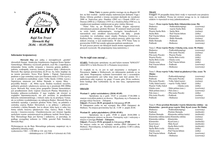 le Rajd Ten Trzeci Słowacki Raj 28.04. – 03.05.2006 Informator krajoznawczy Słowacki Raj jest jedną z niewątpliwych „perełek” słowackich Karpat. Atrakcyjny krajobrazowo fragment Krasu SpiskoGemerskiego. Miłośnicy wycieczek górskich, czyli My ;) napotkają tu różnorodne formy rzeźby związane z krasową genezą podłoża – jaskinie, wodospady, wąwozy, kaniony, pionowe skały i płaskowyże. Słowacki Raj zajmuje powierzchnię ok.20 tys. ha, która znajduje się na terenie powiatów: Nowa Wieś Spiska i Poprad. Najwyższym punktem w jego centralnej części jest Hawrania skala (1153m n.p.m.), zaś w południowo-zachodniej części Velka Knola (1266m n.p.m.). Najniższym miejscem jest dolina Hornadu w rejonie Masy – przysiółka Smizan – ok. 466m n.p.m. Średnia wysokość szczytów, grzbietów górskich i płaskowyży zawiera się w przedziale 800-1000m n.p.m. Słowacki Raj, zwany przez geografów Górami Saraceńskimi, jest przedłużeniem strefy wapieni triasowych Planiny Murańskiej w kierunku północno-wschodnim. Z tego względu, jak również ze względów hipsometrycznych, nie jest uważany za przedłużenie łańcucha niżnotatrzańskiego, z którym styka się na przełęczy Vernar, ale za wybitnie wyodrębniający się subregion Rudaw. Słowacki Raj na zachodzie sąsiaduje z pasmem górskim Niżne Tatry, na południu z centralną częścią Rudaw Słowackich, a na północy i północymwschodzie z doliną Hornadu. Jest to obszar, który łączy w sobie trzy formy reliefu: krasowy (płaskowyże: Glac, Geravy, Skala i Pelc), rzeczny i krasowo-rzeczny. Charakterystyczne jest również łagodne nachylenie warstw zorientowanych na północny zachód. Świat fauny i flory Słowackiego Raju jest barwny i unikatowy, co powoduje, że podlega szczególnej ochronie (w 1988r. powstał Park Narodowy Słowacki Raj). Wybierającym się do Raju Słowackiego polecamy zaopatrzyć się w najbardziej aktualną mapę: wydawnictwo VKU - 1:50 000 nr 124 (ok.15zł) - dokładniejsza to 1:25 000 nr 4 (również ok.15zł) Niżne Tatry to pasmo górskie rozciąga się na długości 80 km. na linii wschód - zachód między malowniczymi dolinami Vagu i Hronu. Główny grzebień z trzema szczytami dochodzi do wysokości 2000 m. Najwyższe góry: Dumbier (2043 m.), Chopok (2024 m.). Deresze (2004 m.), Chabeniec (1955 m.) i Kralową Holą (1948 m.), są wyjątkowymi punktami widokowymi na góry i doliny Słowacji. Niżne Tatry są, po Wysokich Tatrach, drugim najczęściej odwiedzanym pasmem górskim Słowacji. W ostatnich latach powstało tu wiele hoteli, autokempingów, wyciągów krzesełkowych i narciarskich oraz ośrodków turystycznych. Ale dalej - przede wszystkim we wschodniej części między Przełęczą Czertowica a Kralową Holą - istnieją jeszcze całe połacie puszczy, gdzie żyje wiele dzikich zwierząt, w tym niedźwiedzie. W roku 1978 Niżne Tatry (o powierzchni 81095 ha) zostały ogłoszone parkiem narodowym. W tych jeszcze prawie nie tkniętych lasach można organizować wiele pieszych wycieczek. My proponujemy trasę namiotową :) No to rajd czas zacząć… START: Tradycyjnie spotykamy się pod byłym neonem "KWIATY" (obok KFC) w holu Dworca Gł. w Poznaniu (oczywiście) Ze względu na to, że jest to rajd stacjonarny z noclegami w Pensjonacie Anton w Hrabusicach, nie dokonujemy podziału co na jaki dzień. Proponujemy wybranie kierowników tras z uczestników rajdu (organizatorów jest tylko troje musi nam ktoś pomóc ) i podzielenie całej wyprawy na grupy 15-nasto góra 20-sto osobowe, które każdego dnia wybierałyby się na inne trasy, zaproponowane przez nas. ODJAZD Wariant I – pobyt sześciodniowy (28.04.-03.05) Spotykamy się o godz. 19:45 w czwartek 27.04.2006 w znanym wszystkim punkcie na dworcu. Wpychamy się w Poznaniu do pociągu relacji Szczecin – Zakopane. Odjazd z Poznania 20:35; przyjazd do Zakopanego 07:39 . W Zakopanem czeka na nas wynajęty Bus (PKS Zakopane) do Hrabusic. Na miejscu powinniśmy być ok. 11.00 w piątek 28.04. Wariant II – pobyt pięciodniowy (29.04.-03.05.) Spotykamy się o godz. 19:00 w piątek 28.04.2006 w naszym tajemnym miejscu na dworcu. Formujemy szyk i walczymy o miejsca w pociągu Poznań – Zakopane. Odjazd z Poznania 19:54; przyjazd do Zakopanego 07:08 . Na miejscu czeka na nas wynajęty autobus (PKS Zakopane) do Hrabusic. Przewidujemy, że będziemy tam ok. godziny 11:00 w sobotę oczywiście . TRASY Uwaga!!! W przypadku dużej ilości wody w wąwozach czas przejścia może się wydłużyć. Proszę też zwrócić uwagę na to, że większość szlaków w wąwozach to trasy jednokierunkowe. Trasa 1. Przez wąwóz Sucha Bela i Klastorisko (czas: 5h) Hrabusice – Podlesok(kemping) (czerwony) Podlesok – wąwóz Sucha Bela (zielony) Wąwóz Sucha Bela – Sucha Bela (zielony) Sucha Bela – Pod Vtacim hrbom (żółty) Pod Vtacim hrbom – Klastorisko (czerwony) Klastorisko – Hrdlo Hornadu (zielony) Hrdlo Hornadu – Podlesok (niebieski) Podlesok – Hrabusice (czerwony) Trasa 2. Przez wąwóz Piecky i Glacką cestę. (czas: 5h 15min) Hrabusice – Podlesok(kemping) (czerwony) Podlesok – Pila (ustie Piecok) (zielony) Pila (ustie Piecok) – Wąwóz Piecky (żółty) Wąwóz Piecky – Sucha Bela (vrch) (żółty) Sucha Bela (vrch) – Glacka cesta (żółty) Glacka cesta – Pod Vtacim hrbom (żółty) Pod Vtacim hrbom – Podlesok (czerwony) Podlesok – Hrabusice (czerwony) Trasa 3. Przez wąwóz Velky Sokol na płaskowyż Glac. (czas: 7h 30min) Hrabusice - Podlesok(kemping) (czerwony) Podlesok - Pila (ustie Piecok) (zielony) Pila (ustie Piecok) - Velky Sokol (ustie) (zielony) Velky Sokol (ustie) - wąwóz Vielky Sokol (żółty) Wąwóz Vielky Sokol - Glacka cesta (żółty) Glacka cesta - Mala polana (razc.) (czerwony) Mala polana (razc.) - Pals (razc.) (czerwony) Pals (razc.) - Pila (ustie Piecok) (żółty) Pila (ustie Piecok) - Podlesok (zielony) Podlesok - Hrabusice (czerwony) Trasa 4. Przez przeło