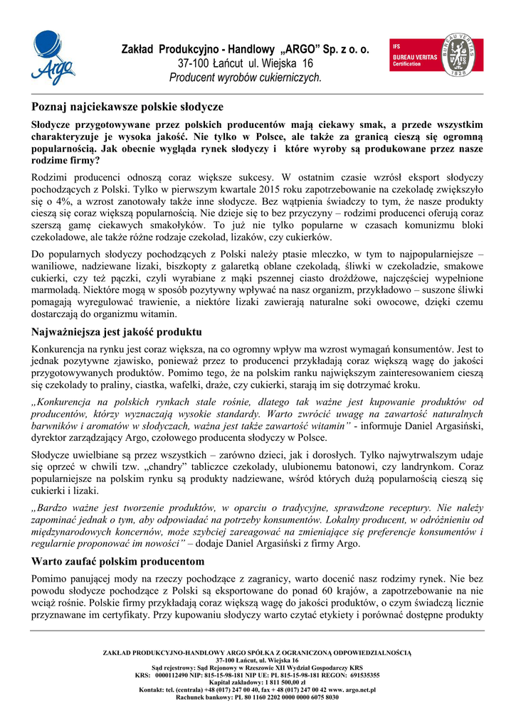 Zakład Produkcyjno - Handlowy „ARGO” Sp. z o. o. 37-100 Łańcut ul. Wiejska 16 Producent wyrobów cukierniczych. Poznaj najciekawsze polskie słodycze Słodycze przygotowywane przez polskich producentów mają ciekawy smak, a przede wszystkim charakteryzuje je wysoka jakość. Nie tylko w Polsce, ale także za granicą cieszą się ogromną popularnością. Jak obecnie wygląda rynek słodyczy i które wyroby są produkowane przez nasze rodzime firmy? Rodzimi producenci odnoszą coraz większe sukcesy. W ostatnim czasie wzrósł eksport słodyczy pochodzących z Polski. Tylko w pierwszym kwartale 2015 roku zapotrzebowanie na czekoladę zwiększyło się o 4%, a wzrost zanotowały także inne słodycze. Bez wątpienia świadczy to tym, że nasze produkty cieszą się coraz większą popularnością. Nie dzieje się to bez przyczyny – rodzimi producenci oferują coraz szerszą gamę ciekawych smakołyków. To już nie tylko popularne w czasach komunizmu bloki czekoladowe, ale także różne rodzaje czekolad, lizaków, czy cukierków. Do popularnych słodyczy pochodzących z Polski należy ptasie mleczko, w tym to najpopularniejsze – waniliowe, nadziewane lizaki, biszkopty z galaretką oblane czekoladą, śliwki w czekoladzie, smakowe cukierki, czy też pączki, czyli wyrabiane z mąki pszennej ciasto drożdżowe, najczęściej wypełnione marmoladą. Niektóre mogą w sposób pozytywny wpływać na nasz organizm, przykładowo – suszone śliwki pomagają wyregulować trawienie, a niektóre lizaki zawierają naturalne soki owocowe, dzięki czemu dostarczają do organizmu witamin. Najważniejsza jest jakość produktu Konkurencja na rynku jest coraz większa, na co ogromny wpływ ma wzrost wymagań konsumentów. Jest to jednak pozytywne zjawisko, ponieważ przez to producenci przykładają coraz większą wagę do jakości przygotowywanych produktów. Pomimo tego, że na polskim ranku największym zainteresowaniem cieszą się czekolady to praliny, ciastka, wafelki, draże, czy cukierki, starają im się dotrzymać kroku. „Konkurencja na polskich rynkach stale rośnie, dlatego tak ważne jest kupowanie produktów od producentów, którzy wyznaczają wysokie standardy. Warto zwrócić uwagę na zawartość naturalnych barwników i aromatów w słodyczach, ważna jest także zawartość witamin” - informuje Daniel Argasiński, dyrektor zarządzający Argo, czołowego producenta słodyczy w Polsce. Słodycze uwielbiane są przez wszystkich – zarówno dzieci, jak i dorosłych. Tylko najwytrwalszym udaje się oprzeć w chwili tzw. „chandry” tabliczce czekolady, ulubionemu batonowi, czy landrynkom. Coraz popularniejsze na polskim rynku są produkty nadziewane, wśród których dużą popularnością cieszą się cukierki i lizaki. „Bardzo ważne jest tworzenie produktów, w oparciu o tradycyjne, sprawdzone receptury. Nie należy zapominać jednak o tym, aby odpowiadać na potrzeby konsumentów. Lokalny producent, w odróżnieniu od międzynarodowych koncernów, może szybciej zareagować na zmieniające się preferencje konsumentów i regularnie proponować im nowości” – dodaje Daniel Argasiński z firmy Argo. Warto zaufać polskim producentom Pomimo panującej mody na rzeczy pochodzące z zagranicy, warto docenić nasz rodzimy rynek. Nie bez powodu słodycze pochodzące z Polski są eksportowane do ponad 60 krajów, a zapotrzebowanie na nie wciąż rośnie. Polskie firmy przykładają coraz większą wagę do jakości produktów, o czym świadczą licznie przyznawane im certyfikaty. Przy kupowaniu słodyczy warto czytać etykiety i porównać dostępne produkty ZAKŁAD PRODUKCYJNO-HANDLOWY ARGO SPÓŁKA Z OGRANICZONĄ ODPOWIEDZIALNOŚCIĄ 37-100 Łańcut, ul. Wiejska 16 Sąd rejestrowy: Sąd Rejonowy w Rzeszowie XII Wydział Gospodarczy KRS KRS: 0000112490 NIP: 815-15-98-181 NIP UE: PL 815-15-98-181 REGON: 691535355 Kapitał zakładowy: 1 811 500,00 zł Kontakt: tel. (centrala) +48 (017) 247 00 40, fax + 48 (017) 247 00 42 www. argo.net.pl Rachunek bankowy: PL 80 1160 2202 0000 0000 6075 8030 Zakład Produkcyjno - Handlowy „ARGO” Sp. z o. o. 37-100 Łańcut ul. Wiejska 16 Producent wyrobów cukierniczych. - dzięki temu będziemy mieli pewność, że dokonaliśmy właściwego wyboru i utwierdzimy się w przekonaniu, że polskie produkty nie tylko nie odbiegają jakością od zagranicznych, a nawet często je przewyższają. Kontakt dla prasy: Korneliusz Smolik Kom. +48 510 796 217 Email. [email protected] ZAKŁAD PRODUKCYJNO-HANDLOWY ARGO SPÓŁKA Z OGRANICZONĄ ODPOWIEDZIALNOŚCIĄ 37-100 Łańcut, ul. Wiejska 16 Sąd rejestrowy: Sąd Rejonowy w Rzeszowie XII Wydział Gospodarczy KRS KRS: 0000112490 NIP: 815-15-98-181 NIP UE: PL 815-15-98-181 REGON: 691535355 Kapitał zakładowy: 1 811 500,00 zł Kontakt: tel. (centrala) +48 (017) 247 00 40, fax + 48 (017) 247 00 42 www. argo.net.pl Rachunek bankowy: PL 80 1160 2202 0000 0000 6075 8030