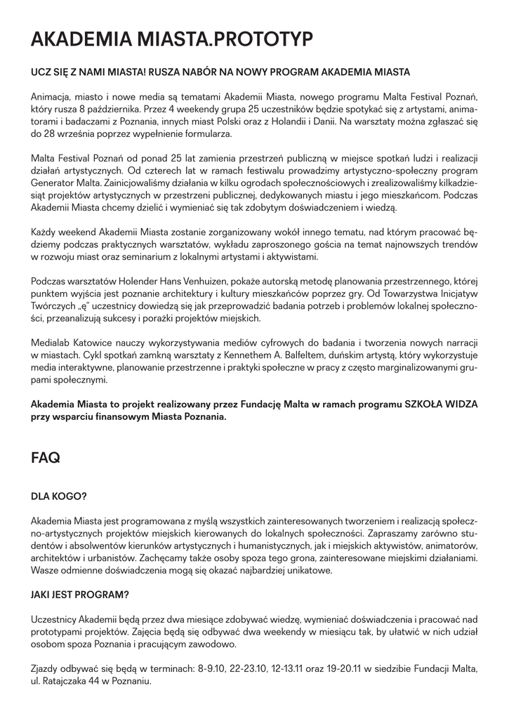 AKADEMIA MIASTA.PROTOTYP UCZ SIĘ Z NAMI MIASTA! RUSZA NABÓR NA NOWY PROGRAM AKADEMIA MIASTA Animacja, miasto i nowe media są tematami Akademii Miasta, nowego programu Malta Festival Poznań, który rusza 8 października. Przez 4 weekendy grupa 25 uczestników będzie spotykać się z artystami, animatorami i badaczami z Poznania, innych miast Polski oraz z Holandii i Danii. Na warsztaty można zgłaszać się do 28 września poprzez wypełnienie formularza. Malta Festival Poznań od ponad 25 lat zamienia przestrzeń publiczną w miejsce spotkań ludzi i realizacji działań artystycznych. Od czterech lat w ramach festiwalu prowadzimy artystyczno-społeczny program Generator Malta. Zainicjowaliśmy działania w kilku ogrodach społecznościowych i zrealizowaliśmy kilkadziesiąt projektów artystycznych w przestrzeni publicznej, dedykowanych miastu i jego mieszkańcom. Podczas Akademii Miasta chcemy dzielić i wymieniać się tak zdobytym doświadczeniem i wiedzą. Każdy weekend Akademii Miasta zostanie zorganizowany wokół innego tematu, nad którym pracować będziemy podczas praktycznych warsztatów, wykładu zaproszonego gościa na temat najnowszych trendów w rozwoju miast oraz seminarium z lokalnymi artystami i aktywistami. Podczas warsztatów Holender Hans Venhuizen, pokaże autorską metodę planowania przestrzennego, której punktem wyjścia jest poznanie architektury i kultury mieszkańców poprzez gry. Od Towarzystwa Inicjatyw Twórczych „ę” uczestnicy dowiedzą się jak przeprowadzić badania potrzeb i problemów lokalnej społeczności, przeanalizują sukcesy i porażki projektów miejskich. Medialab Katowice nauczy wykorzystywania mediów cyfrowych do badania i tworzenia nowych narracji w miastach. Cykl spotkań zamkną warsztaty z Kennethem A. Balfeltem, duńskim artystą, który wykorzystuje media interaktywne, planowanie przestrzenne i praktyki społeczne w pracy z często marginalizowanymi grupami społecznymi. Akademia Miasta to projekt realizowany przez Fundację Malta w ramach programu SZKOŁA WIDZA przy wsparciu finansowym Miasta Poznania. FAQ DLA KOGO? Akademia Miasta jest programowana z myślą wszystkich zainteresowanych tworzeniem i realizacją społeczno-artystycznych projektów miejskich kierowanych do lokalnych społeczności. Zapraszamy zarówno studentów i absolwentów kierunków artystycznych i humanistycznych, jak i miejskich aktywistów, animatorów, architektów i urbanistów. Zachęcamy także osoby spoza tego grona, zainteresowane miejskimi działaniami. Wasze odmienne doświadczenia mogą się okazać najbardziej unikatowe. JAKI JEST PROGRAM? Uczestnicy Akademii będą przez dwa miesiące zdobywać wiedzę, wymieniać doświadczenia i pracować nad prototypami projektów. Zajęcia będą się odbywać dwa weekendy w miesiącu tak, by ułatwić w nich udział osobom spoza Poznania i pracującym zawodowo. Zjazdy odbywać się będą w terminach: 8-9.10, 22-23.10, 12-13.11 oraz 19-20.11 w siedzibie Fundacji Malta, ul. Ratajczaka 44 w Poznaniu. Program każdego weekendu skupiony jest wokół praktycznych warsztatów. Ponadto w każdą sobotę zjazdu zaproszony gość zaprezentuje najnowsze trendy w rozwoju miast podczas wykładu. W każdą niedzielę zjazdu spotykać będziemy się z poznańskimi artystami i aktywistami na seminariach. Uczestnikom Akademii zapewniamy lunch oraz przerwy kawowe. JAK WZIĄĆ UDZIAŁ? Do Akademii Miasta przyjmiemy 25 osób. Rekrutacja odbywa się na podstawie formularza zgłoszeniowego. Udział w zajęciach jest bezpłatny. W czasie warsztatów przewidziane są lunche i przerwy kawowe, za które opłata wynosi 120,00 zł łącznie za cztery weekendy. Każdy może wziąć udział w otwartych wykładach prowadzonych w ramach Akademii. Spotkania i wykłady odbędą się w języku polskim lub będą tłumaczone. Warsztaty z Hansem Venhuizenem oraz Kennethem Balfeltem odbędą się w języku angielskim, warsztaty z Towarzystwem Inicjatyw Twórczych „ę” oraz Medialab Katowice w języku polskim. Nabór trwa do 28 września. Wyniki ogłosimy 30 września. JAKĄ METODĄ BĘDZIEMY PRACOWAĆ PODCZAS PIERWSZEJ EDYCJI AKADEMII? W opracowywaniu projektów społeczno-artystycznych w miastach wykorzystamy metodę prototypowania, która zwykle służy do projektowania produktów i usług. Prototypowanie to cykliczny proces tworzenia, służący do testowania różnych aspektów projektu. Prototypy pozwalają dostrzec niespodziewane zachowania uczestników oraz wyłapać problemy i luki w koncepcji. Nie zawsze muszą przybrać materialną formę – w przypadku projektowania działań, można się posłużyć storyboardem czy rysunkiem ścieżki uczestnika. Ważne, żeby nie zatrzymywać się na etapie słownego opisu i w dowolny sposób zwizualizować pomysł. Jednym z najważniejszych elementów prototypowania jest „burza mózgów”, czyli generowanie jak największej ilości rozwiązań bez poddawania ich ocenie. Prototypowanie skupia uwagę na odbiorcy projektu, a nie samym pomyśle. Dzięki interdyscyplinarnej grupie pozwala spojrzeć na projekt z wielu perspektyw, a dzięki testom – zwiększyć realność powodzenia. Prototypem jest też sama Akademia Miasta. To pierwsza, pilotażowa odsłona, w ramach której pozwolimy sobie na nieoczywiste połączenia tematów i zapraszanie gości z czasami odległych od siebie obszarów. Poddamy także testom samą metodę prototypowania w projektach społeczno-artystycznych. CZY ABSOLWENCI OTRZYMAJĄ CERTYFIKAT UKOŃCZENIA? Wszyscy uczestnicy, którzy wspólnie z grupą przygotują prototyp miejskiego projektu otrzymają certyfikat ukończenia Akademii Miasta. Zakładamy też możliwość realizacji wybranego prototypu w ramach Malta Festival Poznań 2017. Więcej informacji o Akademii Miasta: malta-festival.pl KONTAKT DLA MEDIÓW Mikołaj Bylka rzecznik prasowy Fundacji Malta [email protected] +48 603 173 344 W celu otrzymania zdjęć, motywu graficznego oraz mapy Park(ing) Day