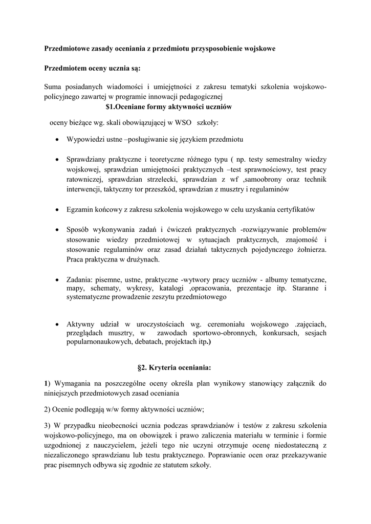 Przedmiotowe zasady oceniania z przedmiotu przysposobienie wojskowe Przedmiotem oceny ucznia są: Suma posiadanych wiadomości i umiejętności z zakresu tematyki szkolenia wojskowopolicyjnego zawartej w programie innowacji pedagogicznej $1.Oceniane formy aktywności uczniów oceny bieżące wg. skali obowiązującej w WSO szkoły: Wypowiedzi ustne –posługiwanie się językiem przedmiotu Sprawdziany praktyczne i teoretyczne różnego typu ( np. testy semestralny wiedzy wojskowej, sprawdzian umiejętności praktycznych –test sprawnościowy, test pracy ratowniczej, sprawdzian strzelecki, sprawdzian z wf ,samoobrony oraz technik interwencji, taktyczny tor przeszkód, sprawdzian z musztry i regulaminów Egzamin końcowy z zakresu szkolenia wojskowego w celu uzyskania certyfikatów Sposób wykonywania zadań i ćwiczeń praktycznych -rozwiązywanie problemów stosowanie wiedzy przedmiotowej w sytuacjach praktycznych, znajomość i stosowanie regulaminów oraz zasad działań taktycznych pojedynczego żołnierza. Praca praktyczna w drużynach. Zadania: pisemne, ustne, praktyczne -wytwory pracy uczniów - albumy tematyczne, mapy, schematy, wykresy, katalogi ,opracowania, prezentacje itp. Staranne i systematyczne prowadzenie zeszytu przedmiotowego Aktywny udział w uroczystościach wg. ceremoniału wojskowego .zajęciach, przeglądach musztry, w zawodach sportowo-obronnych, konkursach, sesjach popularnonaukowych, debatach, projektach itp.) §2. Kryteria oceniania: 1) Wymagania na poszczególne oceny określa plan wynikowy stanowiący załącznik do niniejszych przedmiotowych zasad oceniania 2) Ocenie podlegają w/w formy aktywności uczniów; 3) W przypadku nieobecności ucznia podczas sprawdzianów i testów z zakresu szkolenia wojskowo-policyjnego, ma on obowiązek i prawo zaliczenia materiału w terminie i formie uzgodnionej z nauczycielem, jeżeli tego nie uczyni otrzymuje ocenę niedostateczną z niezaliczonego sprawdzianu lub testu praktycznego. Poprawianie ocen oraz przekazywanie prac pisemnych odbywa się zgodnie ze statutem szkoły. 4) Nieobecności na zajęciach podlegają kontroli. Uczeń, który bez uzasadnienia i usprawiedliwienia systematycznie opuszcza zajęcia związane z tematyką służb mundurowych, decyzją Rady Pedagogicznej zostaje z nich wykluczony i tym samym realizuje tylko program kształcenia ogólnego i kształcenia zawodowego w technikum. 5) .Uczeń, który nie uczestniczył w zajęciach szkoleniowych klasy mundurowej na skutek nieobecności usprawiedliwionej jest zobowiązany w uzgodnionym terminie do uzupełnienia wiedzy i umiejętności z tego zakresu w cyklu kształcenia u nauczyciela przysposobienia wojskowo-policyjnego lub innego nauczyciela(instruktora) 6.Uczeń który systematycznie opuszcza zajęcia szkoleniowe klasy mundurowej, posiada łącznie 50 godzin nieusprawiedliwionych zajęć w tzw. dniu mundurowym, nie zaliczył wiedzy i umiejętności z zakresu szkolenia wojskowo-policyjnego w wyznaczonym terminie ,nie uzupełnia wiedzy i umiejętności z tego zakresu, nie uczestniczy w zajęciach programowych może być przeniesiony decyzją dyrektora szkoły do równoległej klasy o profilu zawodowym. 7) Przestrzeganie przedstawionych kryteriów oceniania dotyczy wszystkich bez wyjątku uczniów i na równych prawach. 8)Uczeń powinien być zawsze przygotowany do lekcji. Wyjątkowo może być usprawiedliwiony uczeń, który był nieobecny na kilku lekcjach z powodu choroby lub innych ważnych przyczyn (o ile przedstawi pisemne usprawiedliwienie na początku lekcji). Dodatkowo co najmniej jeden raz w semestrze uczeń może zgłosić nieprzygotowanie z innych przyczyn.Za nie przygotowanie się do zajęć uważa się nieznajomość zagadnień tematycznych z trzech ostatnich zajęć, brak zeszytu oraz innych materiałów, jeżeli tego faktu bądź braku zadania domowego nie zgłosi na początku lekcji, otrzymuje ocenę niedostateczną. §3. Ocenianie pisemnych prac: Oceny z prac pisemnych ustala się w skali stopni szkolnych od 6 do 1 na podstawie następujących progów procentowych: 0 - 40p. – niedostateczny 41 - 60p. – dopuszczający 61 - 75p. – dostateczny 76 - 90p. – dobry 91 - 100p. – b. dobry ocenę celującą z pracy pisemnej uczeń może otrzymać wówczas, jeżeli posiadł wiedzę i umiejętności znacznie wykraczające poza program nauczania przedmiotu . §4. Narzędzia pomiaru i formy kontroli: a) sprawdzian – pisemna forma wypowiedzi, sprawdzająca stopień opanowania wskazanego przez nauczyciela materiału, trwająca co najmniej jedną godzinę lekcyjną; Prace klasowe powinny być zapowiadane co najmniej z tygodniowym wyprzedzeniem. b) sprawdzian praktyczny– test pracy ratowniczej praktyczna forma –ćwiczenie praktyczne, sprawdzające stopień opanowania wskazanego przez nauczyciela materiału, trwająca od 15 do 30 minut; (symulacja urazów ,ćwiczenia praktyczne w zakresie udzielania pierwszej pomocyalgorytmy działań ratowniczych) d) kartkówka – jest pisemną niezapowiedzianą formą sprawdzenia wiadomości mającą wagę odpowiedzi ustnej, która dotyczy tematyki jednej, dwóch lub trzech ostatnich lekcji, a czas jej trwania wynosi nie więcej niż 20 minut. e)semestralny i roczny test sprawnościowy, test praktyczny z walki w bliskim kontakcie, sprawdzian umiejętności strzeleckich i taktycznych, sprawdzian praktyczny z regulaminów i musztry-przeprowadza się w każdym roku wg. wcześniej ustalonych i podanych uczniom zagadnień do opanowania praktycznego f)zadanie domowe- opracowanie referatu, prezentacji, ćwiczenia, przygotowanie i prowadzenie fragmentu lekcji na dane zagadnienie g)odpowiedzi ustne- posługiwanie się językiem przedmiotu h) udział w konkursach i zawodach sportowo-obronnych oraz wiedzy obronnej §5. Zasady ustalania ocen klasyfikacyjnych: 1)Oceny klasyfikacyjne z zajęć edukacyjnych ustala się na podstawie średniej ważonej ocen cząstkowych, zwanej dalej „średnią ważoną: Przyjmuje się na