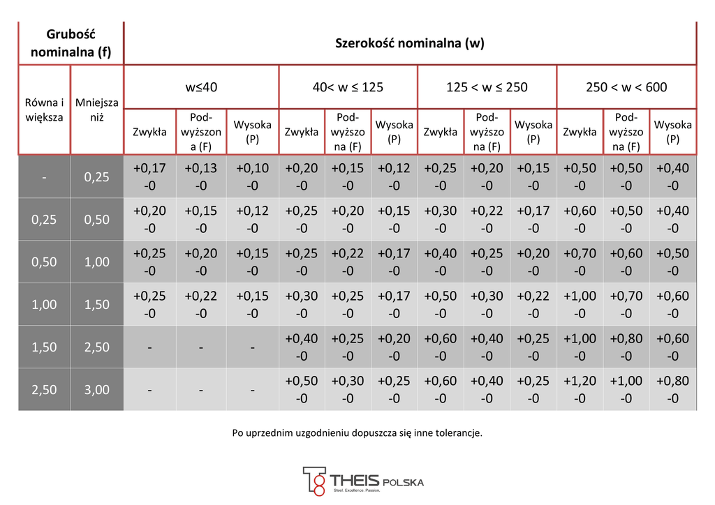 Grubość nominalna (f) Szerokość nominalna (w) w≤40 Równa i Mniejsza większa niż Zwykła 40< w ≤ 125 PodWysoka wyższon (P) a (F) 125 < w ≤ 250 PodWysoka Zwykła wyższo Zwykła (P) na (F) 250 < w < 600 PodWysoka wyższo Zwykła (P) na (F) PodWysoka wyższo (P) na (F) 0,25 +0,17 -0 +0,13 -0 +0,10 -0 +0,20 +0,15 +0,12 +0,25 +0,20 +0,15 +0,50 +0,50 +0,40 -0 -0 -0 -0 -0 -0 -0 -0 -0 0,50 +0,20 -0 +0,15 -0 +0,12 -0 +0,25 +0,20 +0,15 +0,30 +0,22 +0,17 +0,60 +0,50 +0,40 -0 -0 -0 -0 -0 -0 -0 -0 -0 0,50 1,00 +0,25 -0 +0,20 -0 +0,15 -0 +0,25 +0,22 +0,17 +0,40 +0,25 +0,20 +0,70 +0,60 +0,50 -0 -0 -0 -0 -0 -0 -0 -0 -0 1,00 1,50 +0,25 -0 +0,22 -0 +0,15 -0 +0,30 +0,25 +0,17 +0,50 +0,30 +0,22 +1,00 +0,70 +0,60 -0 -0 -0 -0 -0 -0 -0 -0 -0 - +0,40 +0,25 +0,20 +0,60 +0,40 +0,25 +1,00 +0,80 +0,60 -0 -0 -0 -0 -0 -0 -0 -0 -0 - +0,50 +0,30 +0,25 +0,60 +0,40 +0,25 +1,20 +1,00 +0,80 -0 -0 -0 -0 -0 -0 -0 -0 -0 0,25 1,50 2,50 2,50 3,00 - - Po uprzednim uzgodnieniu dopuszcza się inne tolerancje.