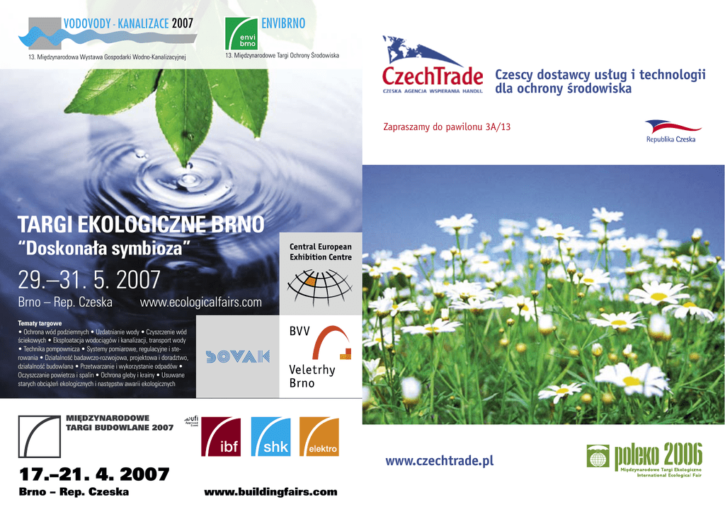 2007 13. Międzynarodowa Wystawa Gospodarki Wodno-Kanalizacyjnej ENVIBRNO 13. Międzynarodowe Targi Ochrony Środowiska Czescy dostawcy usług i technologii dla ochrony środowiska Zapraszamy do pawilonu 3A/13 TARGI EKOLOGICZNE BRNO “Doskonała symbioza” 29.–31. 5. 2007 Brno – Rep. Czeska www.ecologicalfairs.com Tematy targowe • Ochrona wód podziemnych • Uzdatnianie wody • Czyszczenie wód ściekowych • Eksploatacja wodociągów i kanalizacji, transport wody • Technika pompownicza • Systemy pomiarowe, regulacyjne i sterowania • Działalność badawczo-rozwojowa, projektowa i doradztwo, działalność budowlana • Przetwarzanie i wykorzystanie odpadów • Oczyszczanie powietrza i spalin • Ochrona gleby i krainy • Usuwane starych obciążeń ekologicznych i następstw awarii ekologicznych MIĘDZYNARODOWE TARGI BUDOWLANE 2007 www.czechtrade.pl 17.–21. 4. 2007 Brno – Rep. Czeska www.buildingfairs.com Firma Enven a.s., jest firmą inżynieryjno – handlową, która projektuje, dostarcza i instaluje urządzenia do ochrony powietrza. Główny program produkcyjny firmy to dostawy urządzeń do oddzielania zanieczyszczeń stałych z gazów spalinowych i technologicznych oraz działalność związana z dostawami wymienionych urządzeń. Firma specjalizuje się m.in. w dostawach urządzeń odpylających, filtrów tkaninowych, oddzielaczy elektrycznych i mechanicznych, urządzeń do transportu materiałów sypkich, chłodni kominowych i innych. Kontakt: Počernická 96/272, 108 03 Praha 10, RCz, tel: +420 382 502 111, [email protected], www.enven.cz Oferta spółki Aquatest a.s. z Pragi obejmuje szerokie spektrum usług w zakresie ochrony źródeł wody, gospodarki wodnej i środowiska naturalnego. Firma specjalizuje się w opracowywaniu działań przeciwpowodziowych, sporządzaniu opracowań w zakresie oceny, wykorzystania oraz ochrony wód gruntowych i powierzchniowych, przetwarzaniu odpadów, profilowaniu (neutronowym, magnetycznym, akustycznym itp.), a także w prowadzeniu prac sanacyjnych. Kontakt: Geologická 4, 152 00 Praha 5, RCz, tel: +420 234 607 111, [email protected], www.aquatest.cz Intersującą ofertę prezentuje firma Ecofluid Group, s.r.o. Założona w 1993 roku spółka oferuje kompleksowe projekty w zakresie ochrony środowiska, takie jak projektowanie, rekonstrukcja i rozbudowa biologicznych oczyszczalni ścieków czy chemiczne uzdatnianie wód gruntowych i powierzchniowych. Dodatkowo spółka specjalizuje się w biotechnologicznej produkcji nawozów humusowych. Jej spółki partnerskie działają w wielu krajach świata, m.in. w USA, Kanadzie, Francji, Włoszech i Hiszpanii. Kontakt: Pavlíkova 5, 602 00 Brno, RCz, tel: +420 543 421 210, [email protected], www.ecofluid.cz Ofertę w zakresie pomiarów, analiz i badań prezentuje spółka Empla s.r.o. W swoich laboratoriach spółka dokonuje wszelkiego rodzaju badań związanych z ochroną środowiska, do najważniejszych należą: analiza wody pitnej i użytkowej, analizy emisji, imisji i zanieczyszczeń, badania gleb i odpadów, i wiele innych. Kontakt: Za Škodovkou 305, 503 11 Hradec Králové, RCz, tel: +420 495 218 875, [email protected], www.empla.cz Spółka DHI jest członkiem grupy DHI Water & Environment Group - wiodącej firmy w dziedzinie badań, rozwoju oraz zastosowania rozwiązań technologii informatycznych na potrzeby systemów wodnych. DHI Water & Environment Group posiada ponad 40-letnie doświadczenie w tej dziedzinie. Działalność firmy obejmuje zastosowanie modeli matematycznych wykonanych przy pomocy oprogramowania DHI do modelowania hydrauliki rzek oraz zasób wodnych, jak również na potrzeby wodociągów i sieci kanalizacyjnych. Kontakt: Dubois 9, 00-182 Warszawa, PL, tel: +48 22 635 93 32, [email protected], www.dhi.pl Spółka Resta s.r.o. posiada wieloletnie doświadczenie w zakresie recyklingu odpadów budowlanych i materiałów naturalnych. Firma specjalizuje się w produkcji urządzeń do recyklingu oraz linii rozdrabniająco-segregregujących. W jej ofercie znajdują się takie maszyny jak kruszarki stożkowe czy łamacze szczękowe. Firma oferuje usługi w zakresie rekonstrukcji, rozbiórki i wyburzania obiektów oraz inne usługi inżynierii budowlanej. Kontakt: Kojetínská 3120/75, 750 53 Přerov, RCz, tel: +420 581 741 811, [email protected], www.resta.cz Agro-Eko spol. s r.o. powstała w roku 1992. Od początku skupiała się na opracowaniach teoretycznych jak studia ekologiczne, EIA, studia rozproszeniowe, pomiary składników środowiska naturalnego, a także działalności w zakresie produkcji plastikowych oczyszczalni ścieków, budowie gminnych oczyszczalni ścieków, zagospodarowaniu odpadów biologicznie degradowalnych, robotach rekultywacyjnych, produkcji nawozów ciekłych i substratów oraz realizacji ogrodów. Kontakt: Technologická 372/2, 708 00 Ostrava, RCz, tel: +420 597 325 890, [email protected], www.agro-eko.cz Firma Rojek A.S. z Častolovic jest znanym i uznanym w ponad 100 krajach świata producentem maszyn do obróbki drewna. Po zmianach własnościowych w Republice Czeskiej, rodzinna firma o ponad 85-letniej tradycji, rozszerzyła gamę produktów o unikalne maszyny do zagospodarowania biomasy z odpadów drewna oraz wysokosprawne kotły C.O. Przedstawicielem Dywizji Techniki Cieplnej na terenie Polski jest P.W.Energ. Kontakt: Kolejowa 16, 57-522 Domaszków, PL, tel: +48 74 813 20 08, [email protected], www.rojek.cz / www.energ.com.pl Zaproszenie na Targi Ekologiczne Brno 2007 Poszukujecie Państwo nowych partnerów handlowych? Poszukujecie możliwości spotkania z przedstawicielami związków branżowych i władz współdecydujących o środkach finansowych, przeznaczonych na inwestycje w ochronę środowiska? Czy produktem ubocznym procesu produkcyjnego w Waszej firmie są odpady lub zajmujecie się przetwarzaniem odpadów? Czy znacie dokładnie przepisy prawne dotyczące sfery odpadów i emisji zanieczyszczeń? Czy planujecie wprow