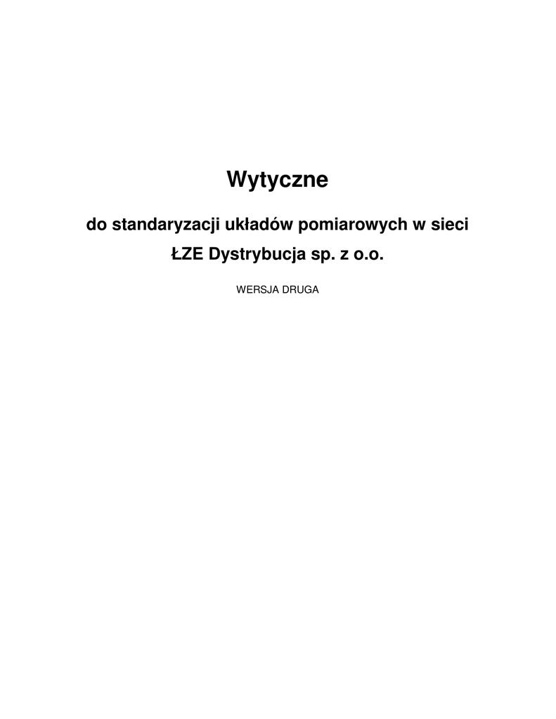 Wytyczne do standaryzacji układów pomiarowych w sieci ŁZE Dystrybucja sp. z o.o. WERSJA DRUGA Pomiary energii elektrycznej 1 Pomiary energii elektrycznej dla Odbiorców V grupy lub VI grupy przyłączeniowej przyłączanych do sieci niskiego napięcia. 1.1 Rodzaje pomiarów energii elektrycznej. 1.1.1 Instalacje 1-fazowe o mocy przyłączeniowej do 7 kW − pomiar bezpośredni energii czynnej 1-fazowy jednostrefowy lub dwustrefowy. 1.1.2 Instalacje 3-fazowe w obiektach o charakterze mieszkalnym (taryfy G) o mocy przyłączeniowej do 40kW lub innych podmiotów o mocy przyłączeniowej do 6kW − pomiar bezpośredni energii czynnej 3-fazowy jednostrefowy lub dwustrefowy. 1.1.3 Instalacje 3-fazowe podmiotów V grupy o mocy przyłączeniowej > 6kW (taryfy C) − pomiar bezpośredni energii czynnej oraz mocy maksymalnej 15 - minutowej 3-fazowy jednostrefowy lub dwustrefowy. Uwaga: w uzasadnionych przypadkach zależnych od charakteru odbioru dla odbiorców rozliczanych w taryfach C, ŁZE Dystrybucja. może zainstalować pomiar energii biernej indukcyjnej, liczniki i sterowniki taryfowe dostarcza ŁZE Dystrybucja. 1.2 Lokalizacja urządzeń pomiarowych i ich usytuowanie. 1.2.1 Budownictwo jednorodzinne i obiekty indywidualnego przeznaczenia − w wydzielonym przedziale złącza pomiarowego - na zewnątrz budynku od strony drogi dla przyłączy napowietrznych, − w linii ogrodzenia na terenie nieruchomości przyłączanego podmiotu lub w pasie przynależnym do ogólnie dostępnego ciągu komunikacyjnego dla przyłączy kablowych, − Preferuje się stosowanie złączy pomiarowych wolnostojących zintegrowanych ze złączem kablowym, − dla podmiotów VI grupy przyłączeniowej lokalizację określa się indywidualnie w warunkach przyłączenia, 1.2.2 Budownictwo wielorodzinne i zespoły usługowo-handlowe − w szafie pomiarowej, w wydzielonym pomieszczeniu (jego części) na parterze budynku, w wolnostojącym lub wbudowanym złączu pomiarowym w miejscu ogólnie dostępnym dla pracowników ŁZE Dystrybucja. Uwaga: przewiduje się stopniowe wprowadzanie zamknięć w systemie Master Key do złącz i szaf pomiarowych oraz pomieszczeń w których znajdują się urządzenia pomiarowe. 1.3 Wyposażenie przedziału pomiarowego złącza pomiarowego lub szafy pomiarowej. 1.3.1 Dla rozliczeń tylko energii czynnej − tablica licznikowa 3- fazowa z tworzywa sztucznego, − euroszyna do montażu sterownika taryfowego, − euroszyna do montażu zacisków redukcyjnych przewodów odpływowych lub zabezpieczenia głównego instalacji (opcja na życzenie odbiorcy) − euroszyna do montażu modemu komunikacyjnego. Dla budownictwa wielorodzinnego dopuszcza się tablice 1-fazowe z tworzywa sztucznego, Uwaga: - w przedziale pomiarowym nie instaluje się żadnych urządzeń poza licznikiem, sterownikiem, modułem komunikacyjnym i jako opcja zabezpieczeniem głównym instalacji, - w drzwiczkach przedziału pomiarowego należy zamontować drzwiczki rewizyjne z zamkiem w systemie Master Key o wymiarach otworu wewnętrznego minimum 250x130mm, umożliwiające odczyt licznika przez odbiorcę, programowanie licznika przedpłatowego lub załączenie zabezpieczenia głównego instalacji, - dopuszcza się montaż do 4 liczników wraz z wyposażeniem w jednej obudowie dla budownictwa jednorodzinnego. Dla każdego licznika należy przewidzieć oddzielne drzwiczki rewizyjne, - wszystkie elementy złącza pomiarowego będące pod napięciem powinny posiadać osłony zabezpieczające przed dotykiem bezpośrednim. 1.4 Wyposażenie przedziału zasilającego złącza pomiarowego lub szafy pomiarowej. Przedział zasilający stanowi wydzieloną, z oddzielnymi drzwiczkami i zamknięciem, część złącza pomiarowego z następującym wyposażeniem: - rozłącznik bezpiecznikowy i wkładki topikowe typu 00, który stanowi zabezpieczenie przedlicznikowe (zabezpieczenie licznika). W szafach pomiarowych dla budynków wielorodzinnych przy instalacjach 1-fazowych dopuszcza się jako zabezpieczenie przedlicznikowe bezpieczniki instalacyjne (topikowe) grupowane w jednej obudowie na poszczególne kondygnacje budynku - zaciski PEN oraz zaciski do przyłączania uziemienia roboczego. Wartość uziemienia roboczego nie może przekroczyć 30 omów. Uziemienie robocze dla przyłączy napowietrznych wykonuje podmiot przyłączany. 1.5 Odczyty. Przewiduje się jako standard odczyt przez inkasenta,. 1.6 Złącza pomiarowe dla przyłączy napowietrznych lub kablowych. 1.6.1 Materiał - tworzywo sztuczne termoutwardzalne, odporne na uszkodzenia mechaniczne (IK10) oraz promieniowanie UV. 1.6.2 Znamionowe napięcie izolacji – 500V. 1.6.3 Znamionowe napięcie pracy – 400/230 V. 1.6.4 Stopień ochrony IP44. 1.6.5 Elementy złącza: obudowa zawierająca dwa przedziały z niezależnymi drzwiami jednoskrzydłowymi dla przedziału zasilającego i pomiarowego z zawiasami krytymi. Uwaga: przy zintegrowanych złączach pomiarowych z złączami kablowymi zaleca się przedziały zasilające umieszczać w jednej obudowie z kablami zasilającymi. Podstawy bezpiecznikowe kabli zasilających powinny być oddzielone od rozłączników bezpiecznikowych osłonami izolacyjnymi. Dopuszcza się do umieszczania do 4 rozłączników przedlicznikowych w złączu kablowym. Zamek do drzwi złącza pomiarowego powinien być umieszczony w drzwiach za którymi znajdują się rozłączniki. 1.6.6 Oznaczenia zewnętrzne – znak ostrzegawczy zgodny z normą. 1.6.7 Przewody łączące i ich wprowadzenie - Od zabezpieczeń przedlicznikowych do licznika i z licznika do zabezpieczenia głównego instalacji: miedziane wykonane linką Lgy o przekroju 10 –16 mm2 (dla instalacji 1-fazowych dopuszcza się przewody 6mm2), z końcówkami przystosowanymi do listwy zaciskowej licznika. Przewody wlz o przekroju 10 - 35 mm2 od przyłącza do zabezpieczeń przedlicznikowych muszą być ciągłe (bez łączeń na trasie), osłonięte rurą typu Arota lub RL ułożonej na elewacji budynku dla 
