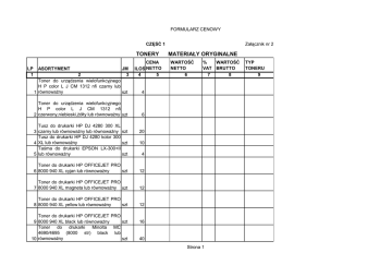 FORMULARZ CENOWY CZĘŚĆ 1 TONERY LP 1 ASORTYMENT JM 3 2 Toner do urządzenia wielofunkcyjnego H P color L J CM 1312 nfi czarny lub 1 równoważny szt Toner do urządzenia wielofunkcyjnego H P color L J CM 1312 nfi 2 czerwony,niebieski,żółty lub równoważny szt Tusz do drukarki HP DJ 4280 300 XL 3 czarny lub równoważny lub równoważny szt Tusz do drukarki HP DJ 4280 kolor 300 4 XL lub równoważny szt Taśma do drukarki EPSON LX-300+II 5 lub równoważny szt CENA NETTO ILOŚĆ 4 5 MATERIAŁY ORYGINALNE WARTOŚĆ NETTO 6 % WARTOŚĆ VAT BRUTTO 7 8 4 6 20 10 4 Toner do drukarki HP OFFICEJET PRO 6 8000 940 XL cyjan lub równoważny szt 12 Toner do drukarki HP OFFICEJET PRO 7 8000 940 XL magneta lub równoważny szt 12 Toner do drukarki HP OFFICEJET PRO 8 8000 940 XL yellow lub równoważny szt 12 Toner do drukarki HP OFFICEJET PRO 9 8000 940 XL black lub równoważny szt Toner do drukarki Minolta MC 4690/4695 (8000 str) black lub 10 równoważny szt Załącznik nr 2 16 40 Strona 1 TYP TONERU 9 FORMULARZ CENOWY 11 12 13 14 Toner do drukarki Minolta MC 4690/4695 (C M Y 3 x 8000 str) lub równoważny szt Toner do drukarki Lexmark C534 lub równoważny szt Bęben do drukarki Lexmark C534 lub równoważny szt Jednostka tworzenia obrazu, zestaw kolorów do drukarki Minolta 4695 lub równoważny op Jednostka tworzenia obrazu, czarna do 15 drukarki Minolta 4695 lub równoważny szt Taśma przenoszenia obrazu do drukarki 16 Minolta 4695 lub równoważny szt Wałek przenoszenia obrazu do drukarki 17 Minolta 4695 lub równoważny szt Urządzenie utrwalające do drukarki 18 Minolta 4695 lub równoważny szt Pojemnik na zużyty toner do drukarki 19 Minolta 4695 lub równoważny szt Toner do drukarki Minolta MC 4690/4695 (8000 str) cyan lub 20 równoważny szt Toner do drukarki HP 1102 lub 21 równoważny szt Toner do drukarki HP1415 czarny lub 22 równoważny szt Toner do drukarki HP1415 kolor lub 23 równoważny szt suma miejscowość i data 24 4 4 18 18 18 18 18 2 8 40 20 30 podpis pieczątka upoważnionego przedstawiciela wykonacy Strona 2