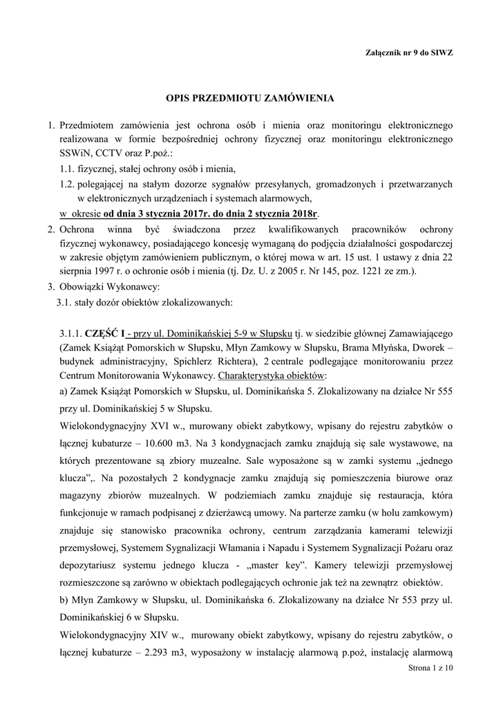 Załącznik nr 9 do SIWZ OPIS PRZEDMIOTU ZAMÓWIENIA 1. Przedmiotem zamówienia jest ochrona osób i mienia oraz monitoringu elektronicznego realizowana w formie bezpośredniej ochrony fizycznej oraz monitoringu elektronicznego SSWiN, CCTV oraz P.poż.: 1.1. fizycznej, stałej ochrony osób i mienia, 1.2. polegającej na stałym dozorze sygnałów przesyłanych, gromadzonych i przetwarzanych w elektronicznych urządzeniach i systemach alarmowych, w okresie od dnia 3 stycznia 2017r. do dnia 2 stycznia 2018r. 2. Ochrona winna być świadczona przez kwalifikowanych pracowników ochrony fizycznej wykonawcy, posiadającego koncesję wymaganą do podjęcia działalności gospodarczej w zakresie objętym zamówieniem publicznym, o której mowa w art. 15 ust. 1 ustawy z dnia 22 sierpnia 1997 r. o ochronie osób i mienia (tj. Dz. U. z 2005 r. Nr 145, poz. 1221 ze zm.). 3. Obowiązki Wykonawcy: 3.1. stały dozór obiektów zlokalizowanych: 3.1.1. CZĘŚĆ I - przy ul. Dominikańskiej 5-9 w Słupsku tj. w siedzibie głównej Zamawiającego (Zamek Książąt Pomorskich w Słupsku, Młyn Zamkowy w Słupsku, Brama Młyńska, Dworek – budynek administracyjny, Spichlerz Richtera), 2 centrale podlegające monitorowaniu przez Centrum Monitorowania Wykonawcy. Charakterystyka obiektów: a) Zamek Książąt Pomorskich w Słupsku, ul. Dominikańska 5. Zlokalizowany na działce Nr 555 przy ul. Dominikańskiej 5 w Słupsku. Wielokondygnacyjny XVI w., murowany obiekt zabytkowy, wpisany do rejestru zabytków o łącznej kubaturze – 10.600 m3. Na 3 kondygnacjach zamku znajdują się sale wystawowe, na których prezentowane są zbiory muzealne. Sale wyposażone są w zamki systemu „jednego klucza”,. Na pozostałych 2 kondygnacje zamku znajdują się pomieszczenia biurowe oraz magazyny zbiorów muzealnych. W podziemiach zamku znajduje się restauracja, która funkcjonuje w ramach podpisanej z dzierżawcą umowy. Na parterze zamku (w holu zamkowym) znajduje się stanowisko pracownika ochrony, centrum zarządzania kamerami telewizji przemysłowej, Systemem Sygnalizacji Włamania i Napadu i Systemem Sygnalizacji Pożaru oraz depozytariusz systemu jednego klucza - „master key”. Kamery telewizji przemysłowej rozmieszczone są zarówno w obiektach podlegających ochronie jak też na zewnątrz obiektów. b) Młyn Zamkowy w Słupsku, ul. Dominikańska 6. Zlokalizowany na działce Nr 553 przy ul. Dominikańskiej 6 w Słupsku. Wielokondygnacyjny XIV w., murowany obiekt zabytkowy, wpisany do rejestru zabytków, o łącznej kubaturze – 2.293 m3, wyposażony w instalację alarmową p.poż, instalację alarmową Strona 1 z 10 antywłamaniową, kamery telewizji przemysłowej. Wszystkie pomieszczenia magazynowe, sale wystawowe oraz pomieszczenia biurowe wyposażone zostały w zamki systemu jednego klucza. Na 3 kondygnacjach młyna, w salach wystawowych eksponowane są zbiory muzealne. Na ostatniej kondygnacji znajdują się magazyny muzealiów. W budynku młyna wydzielone zostały również pomieszczenia biurowe. c) Spichlerz Richtera. Zlokalizowany na działce Nr 180 przy Rynku Rybackim Nr 1 w Słupsku. Wielokondygnacyjny, XIX w. obiekt zabytkowy, o konstrukcji szachulcowej i kubaturze 3.225 m3, wpisany do rejestru zabytków, wyposażony w instalację alarmową p.poż, instalację alarmową antywłamaniową. Wszystkie pomieszczenia magazynowe oraz pomieszczenia biurowe wyposażone zostały w zamki systemu jednego klucza. Na 3 kondygnacjach w budynku spichlerza znajdują się pomieszczenia biurowe oraz pomieszczenia magazynowe zbiorów muzealnych. W części parterowej spichlerza wydzielono część pomieszczenia z przeznaczeniem na herbaciarnię, która funkcjonuje w ramach podpisanej z dzierżawcą umowy. Również to pomieszczenie posiada instalacje alarmową p.poż. oraz antywłamaniową. d) Brama Młyńska, ul. Dominikańska 8. Zlokalizowana na działce nr 181/1 przy Rynku Rybackim w Słupsku. Wielokondygnacyjny XVIw., murowany obiekt zabytkowy, wpisany do rejestru zabytków o łącznej kubaturze 1.670 m3, wyposażony w instalację alarmową p.poż, instalację alarmową antywłamaniową. Pomieszczenia budynku wyposażone zostały również w zamki systemu jednego klucza. Na 4 kondygnacjach w budynku bramy zlokalizowane zostały pomieszczenia Działu Konserwatorskiego. e) Budynek administracyjny – Dworek. Zlokalizowany na działce Nr 179 przy Rynku Rybackim w Słupsku. Wielokondygnacyjny, pochodzący z przełomu XIX i XX w. murowany obiekt zabytkowy o łącznej kubaturze 1.060m3. W budynku znajdują się pomieszczenia biurowe oraz biblioteka z czytelnią. Budynek wyposażony jest w instalacją alarmową p.poż. oraz instalacje antywłamaniową. Pomieszczenia w budynku wyposażone zostały w zamki systemu jednego klucza. Teren określony w lit. a- e , na którym usytuowane są obiekty podlegające obowiązkowej ochronie, nie jest ogrodzony i zamknięty. Łączna powierzchnia terenu wynosi 6.667 m2 . W/w obiekty wyposażone w System Sygnalizacji Pożaru SAGITA, System Sygnalizacji Włamania i Napadu, System Telewizji Przemysłowej ze studiem monitoringu, kamerami wewnętrznymi i zewnętrznymi, System Nagłośnieniowo - Przywoławczy - BOSCH, Depozytor Kluczy – DPE 16. Strona 2 z 10 Wszystkie w/w obiekty (lit. a- e) MPŚ figurują w wykazie Wojewody Pomorskiego, obejmującym obiekty podlegające obowiązkowej ochronie. 3.1.2. CZĘŚĆ II – 3.1.2.1 w m. Swołowo Nr 8, 76-200 Słupsk , w Oddziale Muzeum Kultury Ludowej Pomorza w Swołowie i Młynie Zamkowym w Słupsku, oddalonej od Słupska ok. 16 km, 2 centrale podlegające monitorowaniu przez Centrum Monitorowania Wykonawcy. Charakterystyka obiektów: a) Chałupa - budynek o konstrukcji szachulcowej, częściowo murowany, bez podpiwniczenia. Liczba kondygnacji nadziemnych 3, kubatura 1.406,29 m3. b) Budynek stodoły- budynek o konstrukcji szachulcowej, częściowo podpiwniczony. Liczba kondygnacji nadziemnych 1, kubatura 2.908,47 m 3. c) Budynek obory- budyne