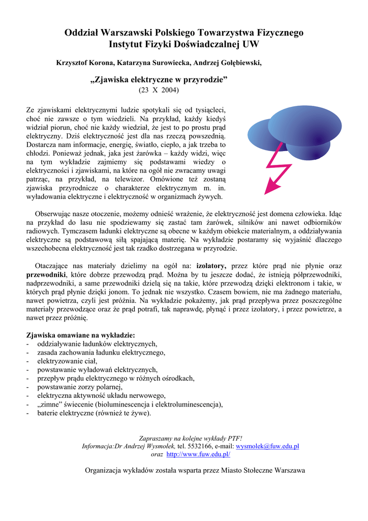 Oddział Warszawski Polskiego Towarzystwa Fizycznego Instytut Fizyki Doświadczalnej UW Krzysztof Korona, Katarzyna Surowiecka, Andrzej Gołębiewski, „Zjawiska elektryczne w przyrodzie” (23 X 2004) Ze zjawiskami elektrycznymi ludzie spotykali się od tysiącleci, choć nie zawsze o tym wiedzieli. Na przykład, każdy kiedyś widział piorun, choć nie każdy wiedział, że jest to po prostu prąd elektryczny. Dziś elektryczność jest dla nas rzeczą powszednią. Dostarcza nam informacje, energię, światło, ciepło, a jak trzeba to chłodzi. Ponieważ jednak, jaka jest żarówka – każdy widzi, więc na tym wykładzie zajmiemy się podstawami wiedzy o elektryczności i zjawiskami, na które na ogół nie zwracamy uwagi patrząc, na przykład, na telewizor. Omówione też zostaną zjawiska przyrodnicze o charakterze elektrycznym m. in. wyładowania elektryczne i elektryczność w organizmach żywych. Obserwując nasze otoczenie, możemy odnieść wrażenie, że elektryczność jest domena człowieka. Idąc na przykład do lasu nie spodziewamy się zastać tam żarówek, silników ani nawet odbiorników radiowych. Tymczasem ładunki elektryczne są obecne w każdym obiekcie materialnym, a oddziaływania elektryczne są podstawową siłą spajającą materię. Na wykładzie postaramy się wyjaśnić dlaczego wszechobecna elektryczność jest tak rzadko dostrzegana w przyrodzie. Otaczające nas materiały dzielimy na ogół na: izolatory, przez które prąd nie płynie oraz przewodniki, które dobrze przewodzą prąd. Można by tu jeszcze dodać, że istnieją półprzewodniki, nadprzewodniki, a same przewodniki dzielą się na takie, które przewodzą dzięki elektronom i takie, w których prąd płynie dzięki jonom. To jednak nie wszystko. Czasem bowiem, nie ma żadnego materiału, nawet powietrza, czyli jest próżnia. Na wykładzie pokażemy, jak prąd przepływa przez poszczególne materiały przewodzące oraz że prąd potrafi, tak naprawdę, płynąć i przez izolatory, i przez powietrze, a nawet przez próżnię. Zjawiska omawiane na wykładzie: - oddziaływanie ładunków elektrycznych, - zasada zachowania ładunku elektrycznego, - elektryzowanie ciał, - powstawanie wyładowań elektrycznych, - przepływ prądu elektrycznego w różnych ośrodkach, - powstawanie zorzy polarnej, - elektryczna aktywność układu nerwowego, - „zimne” świecenie (bioluminescencja i elektroluminescencja), - baterie elektryczne (również te żywe). Zapraszamy na kolejne wykłady PTF! Informacja:Dr Andrzej Wysmołek, tel. 5532166, e-mail: [email protected] oraz http://www.fuw.edu.pl/ Organizacja wykładów została wsparta przez Miasto Stołeczne Warszawa