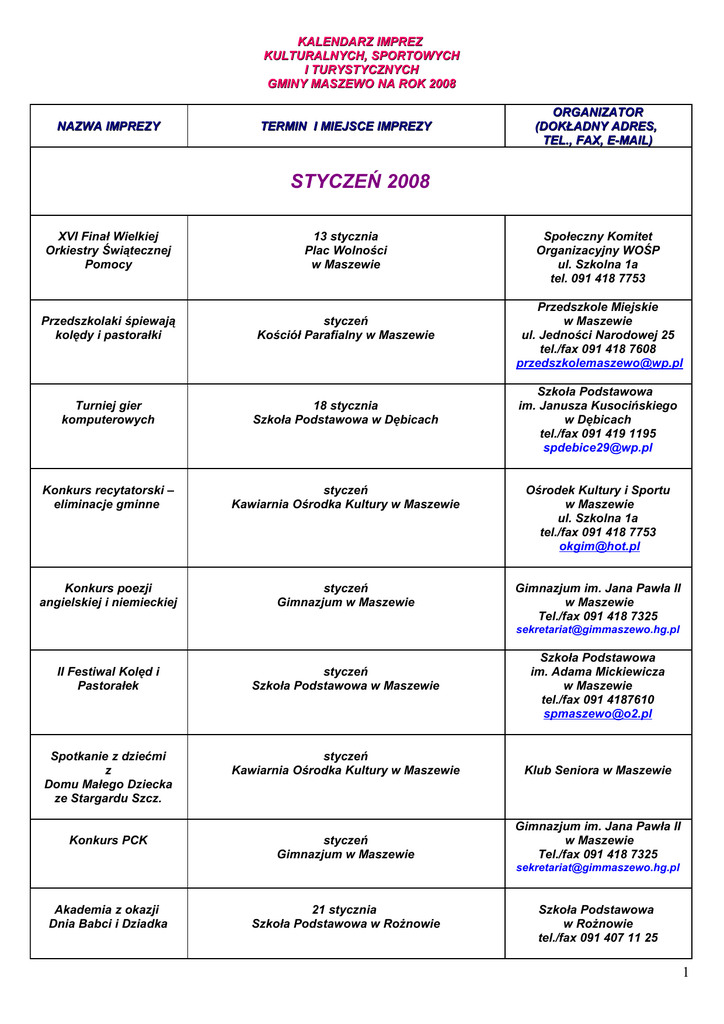KALENDARZ IMPREZ KULTURALNYCH, SPORTOWYCH I TURYSTYCZNYCH GMINY MASZEWO NA ROK 2008 NAZWA IMPREZY TERMIN I MIEJSCE IMPREZY ORGANIZATOR (DOKŁADNY ADRES, TEL., FAX, E-MAIL) STYCZEŃ 2008 XVI Finał Wielkiej Orkiestry Świątecznej Pomocy 13 stycznia Plac Wolności w Maszewie Społeczny Komitet Organizacyjny WOŚP ul. Szkolna 1a tel. 091 418 7753 Przedszkolaki śpiewają kolędy i pastorałki styczeń Kościół Parafialny w Maszewie Turniej gier komputerowych 18 stycznia Szkoła Podstawowa w Dębicach Konkurs recytatorski – eliminacje gminne styczeń Kawiarnia Ośrodka Kultury w Maszewie Ośrodek Kultury i Sportu w Maszewie ul. Szkolna 1a tel./fax 091 418 7753 [email protected] Konkurs poezji angielskiej i niemieckiej styczeń Gimnazjum w Maszewie Gimnazjum im. Jana Pawła II w Maszewie Tel./fax 091 418 7325 Przedszkole Miejskie w Maszewie ul. Jedności Narodowej 25 tel./fax 091 418 7608 [email protected] Szkoła Podstawowa im. Janusza Kusocińskiego w Dębicach tel./fax 091 419 1195 [email protected] [email protected] Szkoła Podstawowa im. Adama Mickiewicza w Maszewie tel./fax 091 4187610 [email protected] II Festiwal Kolęd i Pastorałek styczeń Szkoła Podstawowa w Maszewie Spotkanie z dziećmi z Domu Małego Dziecka ze Stargardu Szcz. styczeń Kawiarnia Ośrodka Kultury w Maszewie Klub Seniora w Maszewie Konkurs PCK styczeń Gimnazjum w Maszewie Gimnazjum im. Jana Pawła II w Maszewie Tel./fax 091 418 7325 [email protected] Akademia z okazji Dnia Babci i Dziadka 21 stycznia Szkoła Podstawowa w RoŜnowie Szkoła Podstawowa w RoŜnowie tel./fax 091 407 11 25 1 Widowisko poetyckomuzyczne z okazji Dnia Babci i Dziadka Zabawa Karnawałowa Gminne Towarzyskie Rozgrywki w Piłce Siatkowej 21,22 stycznia Kawiarnia Ośrodka Kultury w Maszewie 23 stycznia Szkoła Podstawowa w RoŜnowie 30 stycznia Sala Gimnastyczny SP Maszewo Przedszkole Miejskie w Maszewie ul. Jedności Narodowej 25 tel./fax 091 418 7608 [email protected] Szkoła Podstawowa w RoŜnowie tel./fax 091 407 11 25 Szkoła Podstawowa im. Adama Mickiewicza w Maszewie tel./fax 091 4187610 [email protected] LUTY 2008 Zabawa karnawałowa „Bajkowe postaci” 7 lutego SP Dębice „Ferie w Bibliotece” 9-24 luty Biblioteka Publiczna w Maszewie „Mały Turniej Tenisa Stołowego” dla dzieci młodszych 11-12 lutego SP Dębice Bal Karnawałowy dla przedszkolaków luty Kawiarnia Ośrodka Kultury w Maszewie Bal Karnawałowy dla III klas luty Gimnazjum w Maszewie Szkoła Podstawowa im. Janusza Kusocińskiego w Dębicach tel./fax 091 419 1195 [email protected] Biblioteka Publiczna w Maszewie ul. Szkolna 1 tel. 091 418 7658 [email protected] Szkoła Podstawowa im. Janusza Kusocińskiego w Dębicach tel./fax 091 419 1195 [email protected] Przedszkole Miejskie w Maszewie ul. Jedności Narodowej 25 tel./fax 091 418 7608 [email protected] Gimnazjum im. Jana Pawła II w Maszewie Tel./fax 091 418 7325 [email protected] Gminne Zawody w grach i zabawach ruchowych luty Sala gimnastyczna SP Maszewo Szkoła Podstawowa im. Adama Mickiewicza w Maszewie tel./fax 091 4187610 [email protected] Koncert muzyczny „Walentynki/Instrumenty smyczkowe” 14 lutego Szkoła Podstawowa w RoŜnowie Szkoła Podstawowa w RoŜnowie tel./fax 091 407 11 25 Walentynki luty Gimnazjum w Maszewie Gimnazjum im. Jana Pawła II w Maszewie Tel./fax 091 418 7325 [email protected] 2 V Szkolna Spartakiada kl. I-III 27 lutego Szkoła Podstawowa w RoŜnowie Szkoła Podstawowa w RoŜnowie tel./fax 091 407 11 25 MARZEC 2008 Wystawa „Stare Maszewo” 6 marca OKGiM Maszewo Bieg uliczny 63 rocznica zdobycia Maszewa 7 marca Szkoła Podstawowa w Maszewie Dzień Kobiet Dzień Gimnazjalisty 8 marca Sołectwo Godowo marzec Gimnazjum w Maszewie Ośrodek Kultury i Sportu w Maszewie ul. Szkolna 1a tel./fax 091 418 7753 [email protected] Szkoła Podstawowa im. Adama Mickiewicza w Maszewie tel./fax 091 4187610 [email protected] Rada Sołecka w Godowie tel. 091 4191252 lub 091 4191104 Gimnazjum im. Jana Pawła II w Maszewie Tel./fax 091 418 7325 [email protected] Gminne Zawody w Grach i Zabawach Ruchowych „Poznajmy się bliŜej” Wspólne malowanie świątecznych pisanek przez członkinie Klubu Seniora z Maszewa i Związku Byłych Mieszkańców Massow/Maszewa i okolic z Mölln w Niemczech marzec Sala Gimnastyczna Szkoła Podstawowa im. Adama Mickiewicza w Maszewie tel./fax 091 4187610 [email protected] marzec Kawiarnia Ośrodka Kultury w Maszewie Urząd Miejski w Maszewie tel. 091 4187843 www.maszewo.pl [email protected] Klub Seniora W Maszewie Powitanie Wiosny festyn 21 marca Szkoła Podstawowa w RoŜnowie Szkoła Podstawowa w RoŜnowie tel./fax 091 407 11 25 Powitanie Wiosny. Topienie Marzanny. 21 marca Przedszkole Miejskie w Maszewie Powitanie Wiosny. “Dzień bez agresji” 21 marca Szkoła Podstawowa w Dębicach Powitanie Wiosny 21 marca Szkoła Podstawowa w Maszewie Przedszkole Miejskie w Maszewie ul. Jedności Narodowej 25 tel./fax 091 418 7608 [email protected] Szkoła Podstawowa im. Janusza Kusocińskiego w Dębicach tel./fax 091 419 1195 [email protected] Szkoła Podstawowa im. Adama Mickiewicza w Maszewie 3 Maszewo w historii i legendzie- konkursy wiedzy, literackie i plastyczne marzec Szkoła Podstawowa w Maszewie Konkurs „Bezpieczeństwo w ruchu drogowym” marzec Gimnazjum w Maszewie tel./fax 091 4187610 Szkoła Podstawowa im. Adama Mickiewicza w Maszewie tel./fax 091 4187610 [email protected] Gimnazjum im. Jana Pawła II w Maszewie Tel./fax 091 418 7325 [email protected] Konkurs Matematyczny dla klas IV-VI 27 marca Szkoła Podstawowa w Dębicach Promenada poetycka marzec Gimnazjum w Maszewie Szkoła Podstawowa im. Janusza Kusocińskiego w Dębicach tel./fax 091 419 1195 [email protected] Gimnazjum im. Jana Pawła II w Maszewie Tel./fax 091 418 7325 [email protected] Przegląd Małych Form Teatralnych marzec Gimnazjum w Maszewie Gimnazjum im. Jana Pawła II w Maszewie Tel./fax 091 418 7325 [email protected] Kiermasz wytworów uczniów marzec Gimnazjum w Maszewie Gimnazjum im.