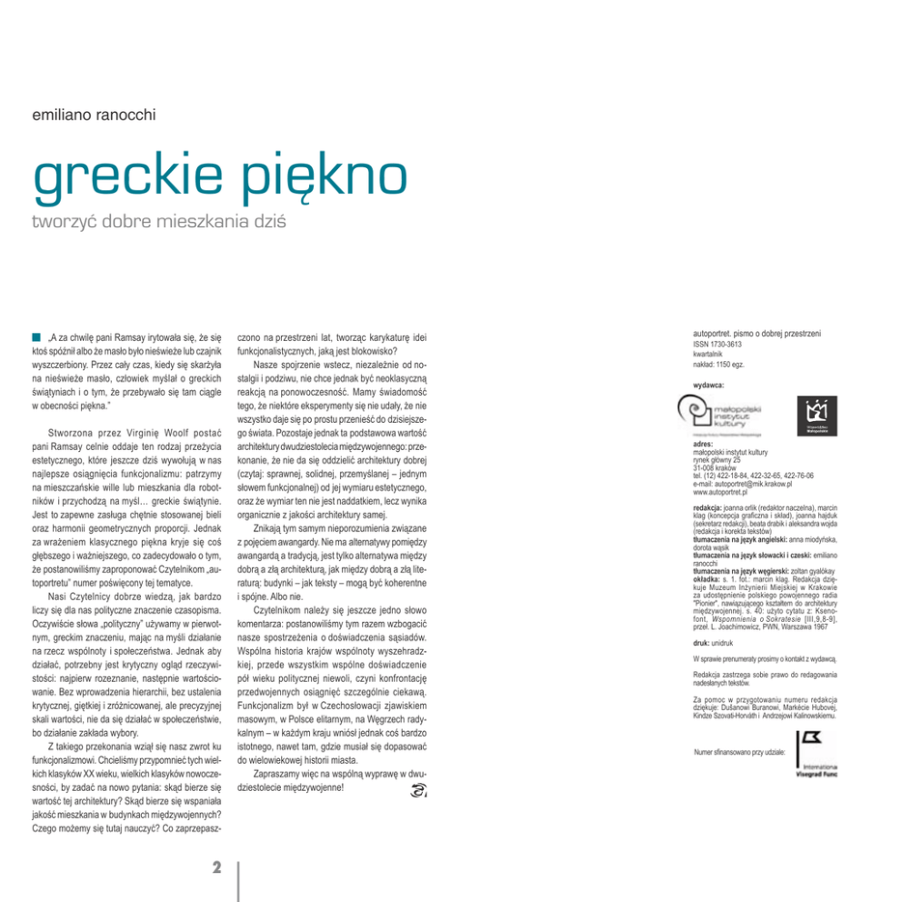 emiliano ranocchi greckie piękno tworzyć dobre mieszkania dziś „A za chwilę pani Ramsay irytowała się, że się ktoś spóźnił albo że masło było nieświeże lub czajnik wyszczerbiony. Przez cały czas, kiedy się skarżyła na nieświeże masło, człowiek myślał o greckich świątyniach i o tym, że przebywało się tam ciągle w obecności piękna.” Stworzona przez Virginię Woolf postać pani Ramsay celnie oddaje ten rodzaj przeżycia estetycznego, które jeszcze dziś wywołują w nas najlepsze osiągnięcia funkcjonalizmu: patrzymy na mieszczańskie wille lub mieszkania dla robotników i przychodzą na myśl… greckie świątynie. Jest to zapewne zasługa chętnie stosowanej bieli oraz harmonii geometrycznych proporcji. Jednak za wrażeniem klasycznego piękna kryje się coś głębszego i ważniejszego, co zadecydowało o tym, że postanowiliśmy zaproponować Czytelnikom „autoportretu” numer poświęcony tej tematyce. Nasi Czytelnicy dobrze wiedzą, jak bardzo liczy się dla nas polityczne znaczenie czasopisma. Oczywiście słowa „polityczny” używamy w pierwotnym, greckim znaczeniu, mając na myśli działanie na rzecz wspólnoty i społeczeństwa. Jednak aby działać, potrzebny jest krytyczny ogląd rzeczywistości: najpierw rozeznanie, następnie wartościowanie. Bez wprowadzenia hierarchii, bez ustalenia krytycznej, giętkiej i zróżnicowanej, ale precyzyjnej skali wartości, nie da się działać w społeczeństwie, bo działanie zakłada wybory. Z takiego przekonania wziął się nasz zwrot ku funkcjonalizmowi. Chcieliśmy przypomnieć tych wielkich klasyków XX wieku, wielkich klasyków nowoczesności, by zadać na nowo pytania: skąd bierze się wartość tej architektury? Skąd bierze się wspaniała jakość mieszkania w budynkach międzywojennych? Czego możemy się tutaj nauczyć? Co zaprzepasz- 2 czono na przestrzeni lat, tworząc karykaturę idei funkcjonalistycznych, jaką jest blokowisko? Nasze spojrzenie wstecz, niezależnie od nostalgii i podziwu, nie chce jednak być neoklasyczną reakcją na ponowoczesność. Mamy świadomość tego, że niektóre eksperymenty się nie udały, że nie wszystko daje się po prostu przenieść do dzisiejszego świata. Pozostaje jednak ta podstawowa wartość architektury dwudziestolecia międzywojennego: przekonanie, że nie da się oddzielić architektury dobrej (czytaj: sprawnej, solidnej, przemyślanej – jednym słowem funkcjonalnej) od jej wymiaru estetycznego, oraz że wymiar ten nie jest naddatkiem, lecz wynika organicznie z jakości architektury samej. Znikają tym samym nieporozumienia związane z pojęciem awangardy. Nie ma alternatywy pomiędzy awangardą a tradycją, jest tylko alternatywa między dobrą a złą architekturą, jak między dobrą a złą literaturą: budynki – jak teksty – mogą być koherentne i spójne. Albo nie. Czytelnikom należy się jeszcze jedno słowo komentarza: postanowiliśmy tym razem wzbogacić nasze spostrzeżenia o doświadczenia sąsiadów. Wspólna historia krajów wspólnoty wyszehradzkiej, przede wszystkim wspólne doświadczenie pół wieku politycznej niewoli, czyni konfrontację przedwojennych osiągnięć szczególnie ciekawą. Funkcjonalizm był w Czechosłowacji zjawiskiem masowym, w Polsce elitarnym, na Węgrzech radykalnym – w każdym kraju wniósł jednak coś bardzo istotnego, nawet tam, gdzie musiał się dopasować do wielowiekowej historii miasta. Zapraszamy więc na wspólną wyprawę w dwudziestolecie międzywojenne! autoportret. pismo o dobrej przestrzeni ISSN 1730-3613 kwartalnik nakład: 1150 egz. wydawca: adres: małopolski instytut kultury rynek główny 25 31-008 kraków tel. (12) 422-18-84, 422-32-65, 422-76-06 e-mail: [email protected] www.autoportret.pl redakcja: joanna orlik (redaktor naczelna), marcin klag (koncepcja graficzna i skład), joanna hajduk (sekretarz redakcji), beata drabik i aleksandra wojda (redakcja i korekta tekstów) tłumaczenia na język angielski: anna miodyńska, dorota wąsik tłumaczenia na język słowacki i czeski: emiliano ranocchi tłumaczenia na język węgierski: zoltan gyalókay okładka: s. 1. fot.: marcin klag. Redakcja dziękuje Muzeum Inżynierii Miejskiej w Krakowie za udostępnienie polskiego powojennego radia "Pionier", nawiązującego kształtem do architektury międzywojennej. s. 40: użyto cytatu z: Ksenofont, Wspomnienia o Sokratesie [III,9,8-9], przeł. L. Joachimowicz, PWN, Warszawa 1967 druk: unidruk W sprawie prenumeraty prosimy o kontakt z wydawcą. Redakcja zastrzega sobie prawo do redagowania nadesłanych tekstów. Za pomoc w przygotowaniu numeru redakcja dziękuje: Dušanowi Buranowi, Markécie Hubovej, Kindze Szovati-Horváth i Andrzejowi Kalinowskiemu. Numer sfinansowano przy udziale: