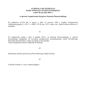 UCHWAŁA NR XXXII/12/14 RADY POWIATU PIASECZYŃSKIEGO z dnia 30 stycznia 2014 r. w sprawie rozpatrzenia skargi na Starostę Piaseczyńskiego Na podstawie art.229 pkt 4 ustawy z dnia 14 czerwca 1960 r. Kodeks Postępowania Administracyjnego (t. j. Dz. U. z 2000 r. Nr 98, poz. 1071 z późn. zm.) Rada Powiatu uchwala, co następuje: §1 Po rozpatrzeniu skargi z dnia 9 grudnia 2013r., na Starostę Piaseczyńskiego w sprawie bezzasadnego odstąpienia od wszczęcia postępowania dyscyplinarnego wobec Powiatowego Rzecznika Konsumentów, uznaje się skargę za bezzasadną. Treść uzasadnienia stanowi załącznik do uchwały. §2 Wykonanie uchwały powierza się Przewodniczącej Rady Powiatu. §3 Uchwała wchodzi w życie z dniem podjęcia. Uzasadnienie: W dniu 9 grudnia 2013r., Pani Ewa Wojtas złożyła skargę do Rady Powiatu na Starostę Piaseczyńskiego w sprawie bezzasadnego odstąpienia od wszczęcia postępowania dyscyplinarnego wobec Powiatowego Rzecznika Konsumentów. Jako uzasadnienia skargi Skarżąca wskazała odpowiedź Starosty z dnia 25 października 2013r., na pismo z dnia 7 października 2013r., w sprawie niezwłocznego wszczęcia postępowania dyscyplinarnego wobec Rzecznika Konsumentów. Pismem z dnia 17 grudnia 2013r., znak BRP.1510.7.2013 Przewodnicząca Rady Powiatu w oparciu o art. 237 §4 Kpa powiadomiła Skarżącą o wydłużeniu terminu rozpatrzenia skargi do dnia 31 stycznia 2014r. Badając przedmiot skargi Komisja Rady Powiatu stwierdziła, że w odpowiedzi na pismo Skarżącej o ukaranie Rzecznika Starosta Piaseczyński pismem z dnia 25.10.2013r., poinformował o czynnościach podjętych przez Rzecznika w sprawie konsumenckiej wniesionej przez Skarżącą. Starosta poinformował między innymi, że sprawa konsumencka wniesiona w dniu 17.06.2013r., dotyczyła nie przesłania Skarżącej przez Firmę Accord Finance S. A. z Warszawy dokumentów w sprawie rozliczenia zaciągniętego kredytu, w związku z wypowiedzeniem umowy z dniem 28.02.2013 r., co w ocenie Skarżącej miało na celu wymuszenie przez Spółkę nienależnych opłat w ramach umowy o kartę kredytową. W dniu 21.01.2013 r. Accord Finace S. A. poinformowała o aktualnym stanie zadłużenia Skarżącej. Pismem z 04.04.2013 r. Skarżąca wniosła o niezwłoczne przesłanie końcowego rozliczenia w celu umożliwienia całkowitej spłaty kredytu. W odpowiedzi spółka przesłała w dnia 22.04.2013 r. duplikat wyciągu za ostatni okres rozliczeniowy od 18.03.2013 do 17.04.2013 r. z wykazanym stanem konta. Pismem z 26.04.2013 r. Skarżąca wezwała spółkę do przesłania kompletu dokumentów potwierdzających należność dla potrzeb końcowego rozliczenia kredytu. Następnie Starosta wyjaśnił, że Rzecznik badając przedmiotową sprawę nie dopatrzył się nieprawidłowości w rozliczeniu przez spółkę umowy o kartę kredytową, jednakże zauważył na kopi wyciągu z rachunku karty opłatę zaksięgowaną w dnia 26.03.2013 r. z tytułu upomnienia listownego w kwocie 15 zł i w związku z tym działając na podstawie art. 42 ust. 1 pkt 3 ustawy z dnia 16.02.2007 r. o ochronie konkurencji i konsumentów (Dz. U. Nr 50, poz. 331 ze zm.) pismem z 11.07.2013 r. wystąpił do spółki o wyjaśnienie zasadności naliczania opłaty za listowne upomnienie wskazując, że tego typu opłata za pisemne upomnienie mieści się w hipotezie klauzuli zamieszczonej pod poz. 978 w rejestrze niedozwolonych klauzul umownych prowadzonym przez Prezesa Urzędu Ochrony Konkurencji i Konsumentów; zgodnie z art. 8 ust. 1 ustawy z dnia 20.07.2008 r. o kredycie konsumenckim, kredytodawca jest obowiązany rozliczyć się z konsumentem w terminie 14 dni od daty spłaty kredytu, w tym przypadku kredytodawca nie miał obowiązku rozliczenia się gdyż kredyt nie został w pełni spłacony przez Skarżącą. W dniu 6.08.2013 rzecznik poinformował, Skarżącą, że spółka wywiązywała się w sposób należyty z obowiązków informacyjnych oraz zgodny z obowiązującymi w tym zakresie przepisami prawa; w kwestii zastosowania niedozwolonej klauzuli umownej rzecznik poinformował Skarżącą, że organem właściwym w tej sprawie jest Prezes Urzędu Ochrony Konkurencji i Konsumentów natomiast do weryfikacji umów pod kątem niedozwolonych klauzul uprawnione są wyłącznie sądy - dlatego też należy, w pierwszej kolejności zwrócić się do przedsiębiorcy z wnioskiem o usunięcie klauzul niedozwolonych umieszczonych w umowie i jeżeli przedsiębiorca nie wyrazi zgody na ich usunięcie, wskazane jest wystąpienie z pozwem do sądu cywilnego. Komisja analizując odpowiedź Starosty Piaseczyńskiego do Skarżącej nie znalazła żadnych uchybień w stanowisku Starosty przedstawionym w piśmie z dnia 25.10.2013r. Starosta w sposób wyczerpujący wyjaśnił Skarżącej kwestie dotyczące postępowania rzecznika w przedmiotowej sprawie oraz o poczynionych przez niego ustaleniach i możliwościach prawnych rozwiązania kwestii naliczania opłat za upomnienie. Rzecznik w sposób należyty i rzetelny wywiązał się ze swych obowiązków, dokonując w oparciu o zgromadzone dokumenty analizy sprawy, w wyniku czego dopatrzył się możliwości zastosowania niedozwolonej klauzuli umownej. W związku z powyższym Komisja stwierdza, iż skargę na Starostę Piaseczyńskiego należy uznać za bezzasadną. Jednocześnie informuje się, że stosownie do art. 239 §1 Kpa w przypadku gdy skarga, w wyniku jej rozpatrzenia, została uznana za bezzasadną i jej bezzasadność wykazano w odpowiedzi na skargę, a skarżący ponowił skargę bez wskazania nowych okoliczności – organ właściwy do jej rozpatrzenia może podtrzymać swoje poprzednie stanowisko z odpowiednią adnotacją w aktach sprawy – bez zawiadamiania skarżącego.