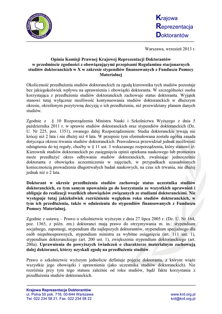 Krajowa Reprezentacja Doktorantów Warszawa, wrzesień 2013 r. Opinia Komisji Prawnej Krajowej Reprezentacji Doktorantów w przedmiocie zgodności z obowiązującymi przepisami Regulaminu stacjonarnych studiów doktoranckich w X w zakresie stypendiów finansowanych z Funduszu Pomocy Materialnej Okoliczność przedłużenia studiów doktoranckich za zgodą kierownika tych studiów pozostaje bez jakiegokolwiek wpływu na uprawnienia i obowiązki doktoranta. W szczególności osoba korzystająca z przedłużenia studiów doktoranckich zachowuje status doktoranta. Wyjątek stanowi tutaj wyłącznie możliwość kontynuowania studiów doktoranckich w dłuższym okresie, określonym pozytywną decyzją o ich przedłużeniu, niż przewidziany planem danych studiów. Zgodnie z § 10 Rozporządzenia Ministra Nauki i Szkolnictwa Wyższego z dnia 5 października 2011 r. w sprawie studiów doktoranckich oraz stypendiów doktoranckich (Dz. U. Nr 225, poz. 1351), zwanego dalej Rozporządzeniem: Studia doktoranckie trwają nie krócej niż 2 lata i nie dłużej niż 4 lata. W przepisie tym sformułowana została ogólna zasada dotycząca okresu trwania studiów doktoranckich. Prawodawca przewidział jednak możliwość odstąpienia do tej reguły, choćby w § 11 ust. 3 wskazanego rozporządzenia, który stanowi iż: Kierownik studiów doktoranckich po zasięgnięciu opinii opiekuna naukowego lub promotora może przedłużyć okres odbywania studiów doktoranckich, zwalniając jednocześnie doktoranta z obowiązku uczestniczenia w zajęciach, w przypadkach uzasadnionych koniecznością prowadzenia długotrwałych badań naukowych, na czas ich trwania, nie dłużej jednak niż o 2 lata. Doktorant w okresie przedłużenia studiów zachowuje status uczestnika studiów doktoranckich, co tym samym upoważnia go do korzystania ze wszystkich uprawnień i obliguje do realizacji wszelkich obowiązków związanych ze studiami doktoranckimi. Nie występuje tutaj jakiekolwiek rozróżnienie względem roku studiów doktoranckich, w tym ich przedłużenia, także w odniesieniu do stypendiów finansowanych z Funduszu Pomocy Materialnej. Zgodnie z ustawą – Prawo o szkolnictwie wyższym z dnia 27 lipca 2005 r. (Dz. U. Nr 164, poz. 1365, z późn. zm.) doktoranci mają prawo do otrzymywania m. in.: stypendium socjalnego, zapomogi, stypendium dla najlepszych doktorantów, stypendium specjalnego dla osób niepełnosprawnych, stypendium ministra za wybitne osiągnięcia (art. 111 ust. 1), stypendium doktoranckiego (art. 200 ust. 1), zwiększenia stypendium doktoranckiego (art. 200a). Uprawnienia do powyższych świadczeń o charakterze materialnym zachowują dalej doktoranci, którzy uzyskali zgodę na przedłużenie studiów. Prawo o szkolnictwie wyższym jednolicie definiuje pojęcie doktoranta, z którym wiąże wszystkie jego obowiązki i uprawnienia (jako uczestnika studiów doktoranckich). Nie rozróżnia przy tym tego statusu zależnie od roku studiów, bądź faktu korzystania z przedłużenia studiów doktoranckich. Krajowa Reprezentacja Doktorantów ul. Polna 50 pok. 716, 00-644 Warszawa Tel. 022 234 58 21, Fax. 022 234 58 22 www.krd.org.pl [email protected] Krajowa Reprezentacja Doktorantów Za niezgodną z obowiązującymi przepisami należy zapis § 15 ust. 3 Regulaminu stacjonarnych studiów doktoranckich w X: „Świadczenia, o których mowa w ust. 1 pkt 1-4, mogą być przyznane na okres nie dłuższy niż 8 semestrów”. Chodzi w tym miejscu o stypendium socjalne, zapomogi, stypendium dla najlepszych doktorantów, stypendium specjalnego dla osób niepełnosprawnych oraz stypendium ministra za wybitne osiągnięcia. Przyjęcie takiego rozwiązania powoduje niekorzystne zróżnicowanie sytuacji prawnej osób, które uzyskały zgodę na przedłużenie studiów doktoranckich względem pozostałych doktorantów, co obowiązujące przepisy wykluczają. Komisja Prawna przy Zarządzie KRD Krajowa Reprezentacja Doktorantów ul. Polna 50 pok. 716, 00-644 Warszawa Tel. 022 234 58 21, Fax. 022 234 58 22 www.krd.org.pl [email protected]