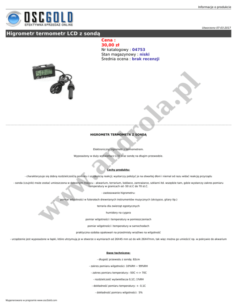 Informacje o produkcie Utworzono 07-03-2017 Higrometr termometr LCD z sondą Cena : 30,00 zł ro la .p l Nr katalogowy : 04753 Stan magazynowy : niski Średnia ocena : brak recenzji nd HIGROMETR TERMOMETR Z SONDĄ Elektroniczny higrometr z termometrem. w .a Wyposażony w duży wyświetlacz LCD oraz sondę na długim przewodzie. Cechy produktu: - charakteryzuje się dobrą rozdzielczośćią pomiaru i szybkością reakcji; wystarczy położyć je na otwartej dłoni i niemal od razu widać reakcję przyrządu - sonda (czujnik) może zostać umieszczona w dowolnym miejscu - akwarium, terrarium, lodówce, zamrażarce, szklarni itd. wszędzie tam, gdzie wystarczy zakres pomiaru temperatury w granicach od -50 st.C do 70 st.C. w - zastosowanie higrometru: w pomiar wilgotności w futerałach drewnianych instrumentów muzycznych (skrzypce, gitary itp.) terraria dla zwierząt egzotycznych humidory na cygara pomiar wilgotności i temperatury w pomieszczeniach pomiar wilgotności i temperatury w samochodach praktyczna ozdoba opakowań na przedmioty wrażliwe na wilgotność - urządzenie jest wyposażone w łapki, które utrzymują je w otworze o wymiarach od 26X45 mm aż do wlk 26X47mm, tak więc można go umieścić np. w pokrywie do akwarium Dane techniczne: - długość przewodu z sondą: 82cm - zakres pomiaru wilgotności: 10%RH ~ 99%RH - zakres pomiaru temperatury: -50C <-> 70C - rozdzielczość wyświetlacza 0,1C; 1%RH - dokładność pomiaru temperatury: +- 0,1C - dokładność pomiaru wilgotności: 5% Wygenerowano w programie www.oscGold.com - wyświetlacz LCD 36mm x 17 mm - szybkość odświeżania: 1 sekunda - wymiary obudowy (s x w x g): 48mm x 28mm x 15,1mm - zasilanie: 2x bateria LR44 1,5V - kolor obudowy: czarny w w w .a nd ro la .p l Stan: Nowy