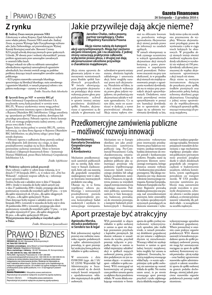 2 26 listopada – 2 grudnia 2010 r. Z rynku 0 Andrzej Zwara nowym prezesem NRA Zakończony w sobotę Krajowy Zjazd Adwokatury wybrał nowe władze palestry. Prezesem NRA został adw. Andrzej Zwara, na prezesa Wyższego Sądu Dyscyplinarnego wybrano adw. Jacka Ziobrowskiego, zaś przewodniczącym Wyższej Komisji Rewizyjnej został adw. Sławomir Ciemny. KZA przyjął uchwałę dotyczącą istotnych spraw społecznych. Uchwała „W obronie praw i wolności obywatelskich” porusza problem ograniczania praw samorządów zawodowych w ostatnich kilku latach. Delegaci wskazali nie tylko na odebranie samorządowi adwokackiemu organizacji samorządowych egzaminów adwokackich, lecz również zwrócili uwagę na podobne problemy dotyczące innych samorządów zawodów zaufania publicznego. – KZA popiera stanowisko samorządu lekarskiego, sprzeciwiające się likwidacji lekarskiego, stażu zawodowego i egzaminów lekarskich, w ramach propozycji reform z tzw. pakietu medycznego – czytamy w uchwale. Źródło: Naczelna Rada Adwokacka 0 Sprawdź firmę po NIP w serwisie BIG.pl Biuro Informacji Gospodarczej InfoMonitor S.A. uruchomiło nową funkcjonalność w serwisie www. BIG.PL. Wszyscy użytkownicy strony mogą pobrać za pośrednictwem internetu raport o dowolnej firmie z Rejestru Dłużników BIG InfoMonitor. Usługa umożliwia np. sprawdzenie po NIP biura podróży, dewelopera lub przyszłego pracodawcy. Pobranie raportu o firmie kosztuje zł, nie wymaga podpisywania żadnej umowy, a cały proces trwa około min. Raport, który można pobrać w serwisie BIG.PL, zawiera informację, czy dana firma figuruje w Rejestrze Dłużników BIG InfoMonitor, na jaką kwotę zalega i przez kogo została dopisana. – Pobranie raportu o zadłużeniu firmy pozwala uniknąć wielu kłopotów. Jeśli dowiemy się z niego, że dane przedsiębiorstwo znajduje się na liście dłużników, powinniśmy zachować ostrożność. Może to bowiem świadczyć o kłopotach finansowych firmy – komentuje Mariusz Hildebrand, prezes Biura Informacji Gospodarczej InfoMonitor S.A. Źródło: InfoMonitor 0 Niektórzy sędziowie jednak pracowali Dane zebrane z sądów w całym kraju wskazują, że w dniach - listopada r., tj. w trakcie tzw. „Dni bez Wokandy”, większość rozpraw odbyła się – informuje resort sprawiedliwości. Średnia liczba sesji z udziałem stron w dniu listopada r. (środa) w stosunku do liczby takich samych sesji w dnu października r. (środa), przyjętego jako dzień porównawczy, wynosiła dla wszystkich sądów proc. – w tym dla sądów rejonowych ok. proc., dla sądów okręgowych – proc., a dla sądów apelacyjnych proc. Dane dotyczące liczby rozpraw z udziałem stron w dniu listopada r. (czwartek) w stosunku do liczby sesji w dniu października r. (czwartek), przyjętego jako dzień porównawczy, wynosiła dla wszystkich sądów proc. – w tym dla sądów rejonowych proc., dla sądów okręgowych proc., a dla sądów apelacyjnych proc. Wyżej przytoczone dane pochodzą ze wszystkich sądów w Polsce. Źródło: Ministerstwo Sprawiedliwości Wydawca: Gazeta Finansowa sp z o. o., REDAKCJA: 00-491 Warszawa, M.Konopnickiej 6 tel./faks 022 339-05-50 Redaktor prowadzący: Jerzy Mosoń (j.moson@gazetafinansowa.pl) Skład i łamanie: Magdalena Helcberger Biuro marketingu i reklamy: 00-491 Warszawa, M. Konopnickiej 6, tel. 022 339-05-43, faks. 022 339-05-44 REKLAMA: Agnieszka Prasowska tel. 0 501 209 900 a.prasowska@gazetafinansowa.pl tel.: 022 339-05-43; 022 339-05-44; Redakcja nie zwraca tekstów niezamówionych i zastrzega sobie prawo redagowania oraz dokonywania skrótów. Redakcja nie odpowiada za treść materiałów reklamowych. Opinie dotyczące rynku kapitałowego są wyłącznie poglądami autorów. Ich źródłem są ogólnie dostępne informacje przekazywane przez spółki publiczne, m.in. w wymaganych prawem raportach. © Wszystkie prawa zastrzeżone. Reprodukcja lub przedruk wyłącznie za pisemną zgodą wydawcy. © Wszystkie prawa zastrzeżone. Reprodukcja lub przedruk wyłącznie za pisemną zgodą wydawcy. Jakie przywileje dają akcje nieme? Jarosław Chałas, radca prawny, partner zarządzający, Chałas i Wspólnicy Kancelaria Prawna Akcje nieme należą do kategorii akcji uprzywilejowanych. Mogą być zarówno akcjami imiennymi, jak i na okaziciela. Z jednej strony oznaczają praktycznie całkowite wyłączenie prawa głosu, z drugiej zaś dają akcjonariuszowi określone przywileje o charakterze majątkowym. Akcja niema uprawnia do głosowania jedynie w enumeratywnie wymienionych przez Kodeks spółek handlowych przypadkach. W świetle obowiązujących przepisów akcjonariusze posiadający akcje nieme wykonują prawo głosu przy podejmowaniu uchwał w sprawie istotnej zmiany przedmiotu działalności spółki. Ponadto, akcjonariusze ci uprawnieni są do udziału w głosowaniu nad uchwałami w sprawie zmiany statutu, obniżenia kapitału zakładowego i umorzenia akcji, które mogłyby naruszać prawa tych akcjonariuszy. Niezależnie od faktu, że z akcji niemych wykonuje się prawo głosu jedynie wyjątkowo, nie pozbawiają one akcjonariusza udziału w walnym zgromadzeniu. Co za tym idzie, może on uczestniczyć w dyskusji, a nawet przewodniczyć obradom. Akcja niema wpływa rów- nież na obliczanie kworum na posiedzeniu walnego zgromadzenia. Akcjonariusz akcji niemej posiada prawo do informacji na zasadach ogólnych. W ramach rekompensaty za brak czynnego uczestnictwa w walnych zgromadzeniach akcjonariusze akcji niemych korzystają z prawa pierwszeństwa w zaspokojeniu przed pozostałymi. Podstawowe znaczenie ma przy tym okoliczność, że w przypadku akcji niemych nie znajduje zastosowania przepis o ograniczeniu wysokości dywidendy, jak ma to miejsce przy pozostałych akcjach uprzywilejowanych. Dodatkowo, statut może przewidywać swoiste uprzywilejowanie w postaci tzw. kumulacji dywidendy. Jest to uprawnienie opierające się na założeniu wyrównania dywidend