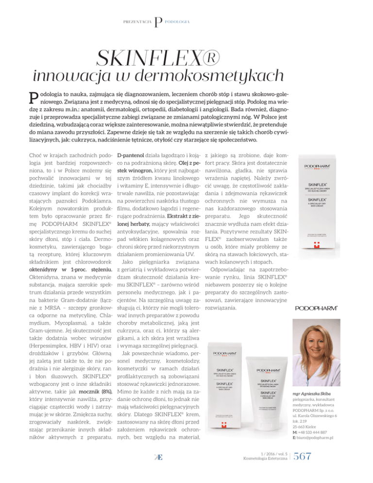 PREZENTACJA P PODOLOGIA SKINFLEX® innowacja w dermokosmetykach P odologia to nauka, zajmująca się diagnozowaniem, leczeniem chorób stóp i stawu skokowo-goleniowego. Związana jest z medycyną, odnosi się do specjalistycznej pielęgnacji stóp. Podolog ma wiedzę z zakresu m.in.: anatomii, dermatologii, ortopedii, diabetologii i angiologii. Bada również, diagnozuje i przeprowadza specjalistyczne zabiegi związane ze zmianami patologicznymi nóg. W Polsce jest dziedziną, wzbudzającą coraz większe zainteresowanie, można niewątpliwie stwierdzić, że pretenduje do miana zawodu przyszłości. Zapewne dzieje się tak ze względu na szerzenie się takich chorób cywilizacyjnych, jak: cukrzyca, nadciśnienie tętnicze, otyłość czy starzejące się społeczeństwo. Choć w krajach zachodnich podologia jest bardziej rozpowszechniona, to i w Polsce możemy się pochwalić innowacjami w tej dziedzinie, takimi jak chociażby czasowy implant do korekcji wrastających paznokci Podoklamra. Kolejnym nowatorskim produktem było opracowanie przez firmę PODOPHARM SKINFLEX® specjalistycznego kremu do suchej skóry dłoni, stóp i ciała. Dermokosmetyku, zawierającego bogatą recepturę, której kluczowym składnikiem jest chlorowodorek oktenidyny w 1-proc. stężeniu. Oktenidyna, znana w medycynie substancja, mająca szerokie spektrum działania przede wszystkim na bakterie Gram-dodatnie (łącznie z MRSA – szczepy gronkowca odporne na metycylinę, Chlamydium, Mycoplasma), a także Gram-ujemne. Jej skuteczność jest także dodatnia wobec wirusów (Herpessimplex, HBV i HIV) oraz drożdżaków i grzybów. Główną jej zaletą jest także to, że nie podrażnia i nie alergizuje skóry, ran i błon śluzowych. SKINFLEX® wzbogacony jest o inne składniki aktywne, takie jak mocznik (8%), który intensywnie nawilża, przyciągając cząsteczki wody i zatrzymując je w skórze. Zmiękcza suchy, zrogowaciały naskórek, zwiększając przenikanie innych składników aktywnych z preparatu. D-pantenol działa łagodząco i kojąco na podrażnioną skórę. Olej z pestek winogron, który jest najbogatszym źródłem kwasu linolowego i witaminy E, intensywnie i długotrwale nawilża, nie pozostawiając na powierzchni naskórka tłustego filmu, dodatkowo łagodzi i regenerujące podrażnienia. Ekstrakt z zielonej herbaty, mający właściwości antyoksydacyjne, spowalnia rozpad włókien kolagenowych oraz chroni skórę przed niekorzystnym działaniem promieniowania UV. Jako pielęgniarka związana z geriatrią i wykładowca potwierdzam skuteczność działania kremu SKINFLEX® – zarówno wśród personelu medycznego, jak i pacjentów. Na szczególną uwagę zasługują ci, którzy nie mogli tolerować innych preparatów z powodu choroby metabolicznej, jaką jest cukrzyca, oraz ci, którzy są alergikami, a ich skóra jest wrażliwa i wymaga szczególnej pielęgnacji. Jak powszechnie wiadomo, personel medyczny, kosmetolodzy, kosmetyczki w ramach działań profilaktycznych są zobowiązani stosować rękawiczki jednorazowe. Mimo że każde z nich mają za zadanie ochronę dłoni, to jednak nie mają właściwości pielęgnacyjnych skóry. Dlatego SKINFLEX® krem, zastosowany na skórę dłoni przed założeniem rękawiczek ochronnych, bez względu na materiał, z jakiego są zrobione, daje komfort pracy. Skóra jest dostatecznie nawilżona, gładka, nie sprawia wrażenia napiętej. Należy zwrócić uwagę, że częstotliwość zakładania i zdejmowania rękawiczek ochronnych nie wymusza na nas każdorazowego stosowania preparatu. Jego skuteczność znacznie wydłuża nam efekt działania. Pozytywne rezultaty SKINFLEX® zaobserwowałam także u osób, które miały problemy ze skórą na stawach łokciowych, stawach kolanowych i stopach. Odpowiadając na zapotrzebowanie rynku, linia SKINFLEX® niebawem poszerzy się o kolejne preparaty do szczególnych zastosowań, zawierające innowacyjne rozwiązania. mgr Agnieszka Skiba pielęgniarka, konsultant medyczny, wykładowca PODOPHARM Sp. z o.o. ul. Karola Olszewskiego 6 lok. 2.19 25-663 Kielce M: +48 533 444 887 E: [email protected] 1 / 2016 / vol. 5 Kosmetologia Estetyczna 567