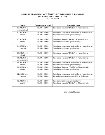 ZAJĘCIA DLA DZIECI W W ŚWIETLICY WIEJSKIEJ W PĄGOWIE W CZASIE FERII ZIMOWYCH 1 - 12.02.2016 r. Data 01.02.2016 r. poniedziałek 02.02.2016 r. wtorek Czas trwania zajęć Tematyka zajęć 10.00 – 12.00 Zajęcia na basenie ”Delfin” w Namysłowie. 10.00 – 12.00 10.00 – 14.00 Zajęcia na sztucznym lodowisku w Namysłowie. Zajęcia świetlicowe: gry i zabawy. 03.02.2016 r. środa 10.00 – 12.00 10.00 – 14.00 Zajęcia na basenie ”Delfin” w Namysłowie. Zajęcia świetlicowe: gry i zabawy. 04.02.2016 r. czwartek 10.00 – 12.00 10.00 – 14.00 Zajęcia na sztucznym lodowisku w Namysłowie. Zajęcia świetlicowe: gry i zabawy. 05.02.2016 r. piątek 08.02.2016 r. poniedziałek 09.02.2016 r. wtorek 10.02.2016 r. środa 10.00 – 12.00 Zajęcia na basenie ”Delfin” w Namysłowie. 10.00 – 12.00 Zajęcia na basenie ”Delfin” w Namysłowie. 10.00 – 12.00 10.00 – 14.00 10.00 – 12.00 10.00 – 14.00 Zajęcia na sztucznym lodowisku w Namysłowie. Zajęcia świetlicowe: gry i zabawy. Zajęcia na basenie ”Delfin” w Namysłowie. Zajęcia świetlicowe: gry i zabawy. 11.02.2016 r. czwartek 10.00 – 12.00 10.00 – 14.00 Zajęcia na sztucznym lodowisku w Namysłowie. Turniej tenisa stołowego w PSP w Bukowiu. 12.02.2016 r. piątek 10.00 – 12.00 10.00 – 12.00 Zajęcia świetlicowe: gry i zabawy. Zajęcia na basenie ”Delfin” w Namysłowie. opr. Maria Nawrot