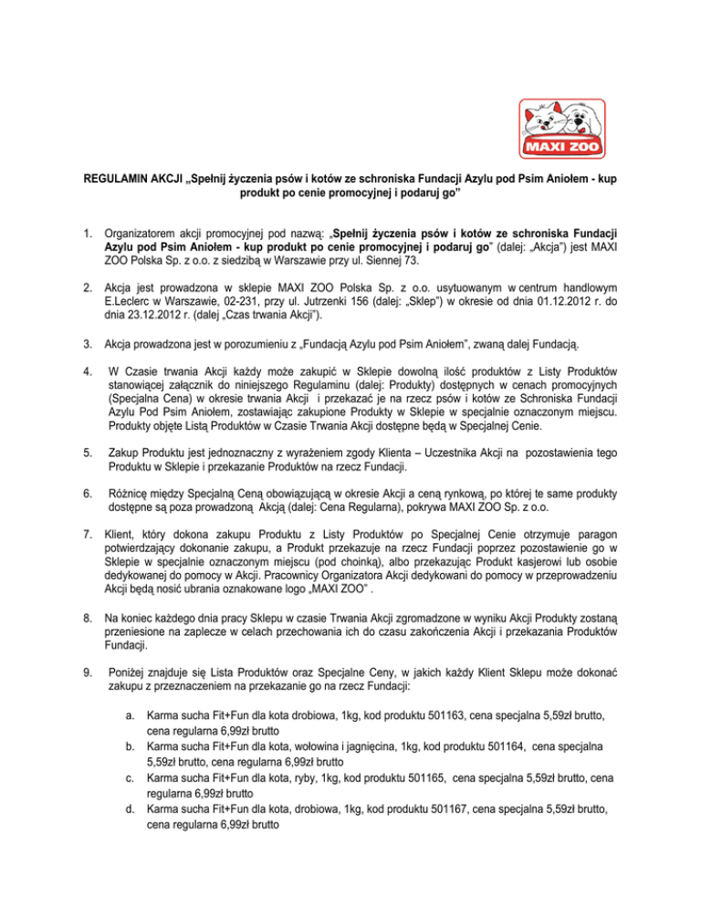 REGULAMIN AKCJI „Spełnij życzenia psów i kotów ze schroniska Fundacji Azylu pod Psim Aniołem - kup produkt po cenie promocyjnej i podaruj go” 1. Organizatorem akcji promocyjnej pod nazwą: „Spełnij życzenia psów i kotów ze schroniska Fundacji Azylu pod Psim Aniołem - kup produkt po cenie promocyjnej i podaruj go” (dalej: „Akcja”) jest MAXI ZOO Polska Sp. z o.o. z siedzibą w Warszawie przy ul. Siennej 73. 2. Akcja jest prowadzona w sklepie MAXI ZOO Polska Sp. z o.o. usytuowanym w centrum handlowym E.Leclerc w Warszawie, 02-231, przy ul. Jutrzenki 156 (dalej: „Sklep”) w okresie od dnia 01.12.2012 r. do dnia 23.12.2012 r. (dalej „Czas trwania Akcji”). 3. Akcja prowadzona jest w porozumieniu z „Fundacją Azylu pod Psim Aniołem”, zwaną dalej Fundacją. 4. W Czasie trwania Akcji każdy może zakupić w Sklepie dowolną ilość produktów z Listy Produktów stanowiącej załącznik do niniejszego Regulaminu (dalej: Produkty) dostępnych w cenach promocyjnych (Specjalna Cena) w okresie trwania Akcji i przekazać je na rzecz psów i kotów ze Schroniska Fundacji Azylu Pod Psim Aniołem, zostawiając zakupione Produkty w Sklepie w specjalnie oznaczonym miejscu. Produkty objęte Listą Produktów w Czasie Trwania Akcji dostępne będą w Specjalnej Cenie. 5. Zakup Produktu jest jednoznaczny z wyrażeniem zgody Klienta – Uczestnika Akcji na pozostawienia tego Produktu w Sklepie i przekazanie Produktów na rzecz Fundacji. 6. Różnicę między Specjalną Ceną obowiązującą w okresie Akcji a ceną rynkową, po której te same produkty dostępne są poza prowadzoną Akcją (dalej: Cena Regularna), pokrywa MAXI ZOO Sp. z o.o. 7. Klient, który dokona zakupu Produktu z Listy Produktów po Specjalnej Cenie otrzymuje paragon potwierdzający dokonanie zakupu, a Produkt przekazuje na rzecz Fundacji poprzez pozostawienie go w Sklepie w specjalnie oznaczonym miejscu (pod choinką), albo przekazując Produkt kasjerowi lub osobie dedykowanej do pomocy w Akcji. Pracownicy Organizatora Akcji dedykowani do pomocy w przeprowadzeniu Akcji będą nosić ubrania oznakowane logo „MAXI ZOO” . 8. Na koniec każdego dnia pracy Sklepu w czasie Trwania Akcji zgromadzone w wyniku Akcji Produkty zostaną przeniesione na zaplecze w celach przechowania ich do czasu zakończenia Akcji i przekazania Produktów Fundacji. 9. Poniżej znajduje się Lista Produktów oraz Specjalne Ceny, w jakich każdy Klient Sklepu może dokonać zakupu z przeznaczeniem na przekazanie go na rzecz Fundacji: a. Karma sucha Fit+Fun dla kota drobiowa, 1kg, kod produktu 501163, cena specjalna 5,59zł brutto, cena regularna 6,99zł brutto b. Karma sucha Fit+Fun dla kota, wołowina i jagnięcina, 1kg, kod produktu 501164, cena specjalna 5,59zł brutto, cena regularna 6,99zł brutto c. Karma sucha Fit+Fun dla kota, ryby, 1kg, kod produktu 501165, cena specjalna 5,59zł brutto, cena regularna 6,99zł brutto d. Karma sucha Fit+Fun dla kota, drobiowa, 1kg, kod produktu 501167, cena specjalna 5,59zł brutto, cena regularna 6,99zł brutto e. Karma sucha Fit+Fun dla kota, wołowina, 1kg, kod produktu 501166, cena specjalna 3,59zł brutto, cena regularna 4,49zł brutto f. Karma sucha Fit+Fun dla kota, drobiowa,5kg, kod produktu 501168, cena specjalna 27,99zł brutto, cena regularna 34,99zł brutto g. Karma sucha Fit+Fun dla kota, łosoś i tuńczyk,,5kg, kod produktu 501169, cena specjalna 27,99zł brutto, cena regularna 34,99zł brutto h. Karma sucha Fit+Fun dla kota, wołowina i jagnięcina, 5kg, kod produktu 501170, cena specjalna 17,99zł brutto, cena regularna 22,49zł brutto i. Puszka karmy Fit+Fun dla kota, wołowina, 415g, kod produktu 501185, cena specjalna 1,99zł brutto, cena regularna 2,49zł brutto j. Puszka karmy Fit+Fun dla kota, dziczyzna i drób, 415g, kod produktu 501186, cena specjalna 1,99zł brutto, cena regularna 2,49zł brutto k. Puszka karmy Fit+Fun dla kota, kurczak, 415g, kod produktu 501187, cena specjalna 1,99zł brutto, cena regularna 2,49zł brutto l. Puszka karmy Fit+Fun dla kota, ryba, 415g, kod produktu 501188, cena specjalna 1,99zł brutto, cena regularna 2,49zł brutto m. Karma Fit+Fun, jagnięcina i ryż, 12,5kg, kod produktu 501207, cena specjalna 31,99zł brutto, cena regularna 39,99zł brutto n. Karma sucha Fit+Fun Croc, 15kg, kod produktu 501208, cena specjalna 23,99zł brutto, cena regularna 29,99zł brutto o. Karma sucha Fit+Fun Mix, 15kg, kod produktu 501209, cena specjalna 31,99zł brutto, cena regularna 39,99zł brutto p. Karma sucha Fit+Fun Lucky Meal dla psów 3kg, kod produktu 501210, cena specjalna 10,39zł brutto, cena regularna 12,99zł brutto q. Puszka karmy Fit+Fun dla psa, drobiowa, 1240g, kod produktu 501211, cena specjalna 3,99zł brutto, cena regularna 4,99zł brutto r. Puszka karmy Fit+Fun dla psa, jagnięcina, 1240g, kod produktu 501212, cena specjalna 3,99zł brutto, cena regularna 4,99zł brutto s. Puszka karmy Fit+Fun dla psa, dziczyzna i mak, 1240g, kod produktu 501213, cena specjalna 3,99zł brutto, cena regularna 4,99zł brutto t. Karma Fit+Fun dla psów, kurczak i dziczyzna, 400kg, kod produktu 501222, cena specjalna 1,99zł brutto, cena regularna 2,49zł brutto u. Karma Fit+Fun dla psów, makaron, 400kg, kod produktu 501223, cena specjalna 1,99zł brutto, cena regularna 2,49zł brutto v. Karma Fit+Fun dla psów, wołowina, 400kg, kod produktu 501224, cena specjalna 1,51zł brutto, cena regularna 1,89zł brutto w. Karma Fit+Fun dla psów, 5 rodzajów mięsa, 400kg, kod produktu 501225, cena specjalna 1,51zł brutto, cena regularna 1,89zł brutto x. Psie przysmaki Fit+Fun, FunTwisties, 100g, kod produktu 501191, cena specjalna 3,19zł brutto, cena regularna 3,99zł brutto y. Psie przysmaki Fit+Fun, żwacze wołowe, 150g, kod produktu 501192, cena specjalna 3,19zł brutto, cena regularna 3,99zł brutto z. Psie przysmaki Fit+Fun, drób i wątróbka, 200g, kod produktu 501193, cena specjalna 3,19zł brutto, cena regularna 3,99zł brutto aa. Psie przysmaki Fit