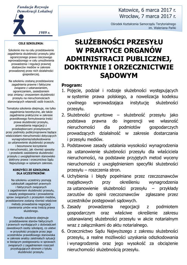 Katowice, 6 marca 2017 r. Rozwiązania informatyczne Wrocław, 7 marca 2017 r. Ośrodek Kształcenia Samorządu Terytorialnego im. Waleriana Pańki CELE SZKOLENIA: Szkolenie ma na celu przedstawienie zagadnienia służebności przesyłu jako ograniczonego prawa rzeczowego wprowadzonego w celu umożliwienia prowadzenia i regulacji prawnej dostawców mediów w zakresie prowadzonej przez nich działalności gospodarczej. Na szkoleniu zostaną przedstawione zagadnienia prawne i faktyczne związane z ustanawianiem, ograniczaniem, zasiedzeniem oraz zmianą i znoszeniem służebności przesyłu na nieruchomościach stanowiących własność osób trzecich. Tematyka szkolenia obejmuje, nie tylko zagadnienia teoretyczne, ale także zagadnienia praktyczne w zakresie prawidłowego formułowania treści prawa służebności przesyłu, prowadzenia negocjacji z przedsiębiorcami przesyłowymi przez podmioty publicznoprawne będące właścicielami nieruchomości dotyczących wynagrodzenia/odszkodowania za ustanowienie służebności przesyłu i bezumowne korzystanie z nieruchomości, jak również sposoby i przesłanki zasiedzenia służebności przesyłu z uwzględnieniem stanowisko doktryny prawa i orzecznictwa Sądu Najwyższego w opisanym zakresie. KORZYŚCI ZE SZKOLENIA DLA UCZESTNIKÓW: Na szkoleniu uczestnicy poznają całokształt zagadnień prawnych i faktycznych związanych z zagadnieniem służebności przesyłu, zasady postępowania i prowadzenia spraw związanych z przesyłem mediów, przedstawione zostaną również właściwe metody prowadzenia negocjacji i zawierania umów wraz treścią prawa służebnego. Ponadto szkolenie obejmuje przedstawienie stanów faktycznych i prawnych wynikających z doświadczeń zawodowych osoby szkolącej, co ułatwi w przyszłości przyjęcie przez jego uczestników prawidłowego stanowiska w zakresie analizy zaistniałych sytuacji w bieżącym postępowaniu w sprawach związanych z zagadnieniem roszczeń przysługujących stronom z tytułu służebności przesyłu. SŁUŻEBNOŚCI PRZESYŁU W PRAKTYCE ORGANÓW ADMINISTRACJI PUBLICZNEJ, DOKTRYNIE I ORZECZNICTWIE SĄDOWYM Program: 1. Pojęcie, podział i rodzaje służebności występujących w systemie prawa polskiego, a nowelizacja kodeksu cywilnego wprowadzająca instytucję służebności przesyłu. 2. Służebności gruntowe – służebność przesyłu jako podstawa prawna do ingerencji we własność nieruchomości dla podmiotów gospodarczych prowadzących działalność w zakresie dostarczania i przesyłu mediów. 3. Podstawowe zasady ustalania wysokości wynagrodzenia za ustanowienie służebności przesyłu dla właściciela nieruchomości, na podstawie przyjętych metod wyceny nieruchomości z uwzględnieniem specyfiki służebności przesyłu – roszczenia stron. 4. Uchybienia i błędy popełniane przez rzeczoznawców majątkowych przy określeniu wynagrodzenia za ustanowienie służebności przesyłu – przykłady zarzutów do opinii rzeczoznawców zgłaszane przez uczestników postępowań sądowych. 5. Zasady prowadzenia negocjacji z podmiotem gospodarczym oraz właściwe określenie zakresu ustanawianej służebności przesyłu w akcie notarialnym wraz z załącznikami do aktu notarialnego. 6. Orzecznictwo Sądu Najwyższego z zakresu służebności przesyłu, a realne możliwości uzyskania odszkodowania i wynagrodzenia oraz jego wysokość za obciążenie nieruchomości służebnością przesyłu. ADRESACI SZKOLE NIA: Pracownicy organów administracji publicznej odpowiedzialni za gospodarkę nieruchomościami, zarządcy nieruchomości, osoby zajmujące się bieżącym utrzymaniem nieruchomości i inne osoby odpowiedzialne za stan faktyczny i prawny nieruchomości oraz obciążenia nieruchomości. DANE DO KONTAKTU: Ośrodek Kształcenia Samorządu Terytorialnego im. Waleriana Pańki 40-014 Katowice ul. Mariacka 1 NIP: 522-000-18-95 Tel. 32 259 86 73, 32 253 84 09 Fax. 32 259 86 73 w. 22, 26 e-mail: [email protected] www.okst.pl MIEJSCE SZKOLENIA: Katowice, siedziba Ośrodka, ul. Mariacka 1, II piętro. Wrocław, siedziba Ośrodka, ul. Piłsudskiego 49 – 57. Mapkę dojazdu do miejsca szkolenia znajdą Państwo na www.okst.pl TERMIN SZKOLENIA: Katowice: 6 marca 2017 r., godz. 10.00 – 15.00. Wrocław: 7 marca 2017 r., godz. 10.00 – 15.00. CENA: 339 zł netto/os. Udział w szkoleniu zwolniony z VAT w przypadku finansowania szkolenia ze środków publicznych. Cena zawiera materiały szkoleniowe, zaświadczenie o ukończeniu szkolenia, poczęstunek i serwis kawowy. RABAT 10% za każdą następną osobę zgłoszoną z tej samej instytucji ZGŁOSZENIA: Wypełnioną kartę zgłoszenia należy przesłać mailem lub faksem lub poprzez formularz na www.okst.p do 1 marca 2017 r. OSOBA DO KONTAKTU: Magdalena Berger tel. 32 206 80 39, 32 206 98 43 w. 25 [email protected] KOD SZKOLENIA: (proszę wybrać właściwy) ☐ Katowice 378/17/M ☐ Wrocław 379/17D/M Nazwa i adres nabywcy (dane do faktury) Nazwa i adres nabywcy NIP Telefon Email 1. Imię i nazwisko uczestnika, stanowisko 2. Imię i nazwisko uczestnika, stanowisko 3. Imię i nazwisko uczestnika, stanowisko Oświadczam, że szkolenie dla ww. pracowników jest kształceniem zawodowym finansowanym w całości lub co najmniej 70% ze środków publicznych (proszę zaznaczyć właściwe) Członek FORUM (proszę zaznaczyć właściwe) UWAGA Ilość miejsc ograniczona. O udziale w szkoleniu decyduje kolejność zgłoszeń. Zgłoszenie na szkolenie musi zostać potwierdzone przesłaniem do Ośrodka karty zgłoszenia (mail, fax lub formularz na www.okst.pl). Brak pisemnej rezygnacji ze szkolenia najpóźniej na trzy dni robocze przed terminem niezależnie od przyczyn rezygnacji będzie równoznaczny z obciążeniem Państwa należnością za to szkolenie. Płatność należy uregulować min. 3 dni przed szkoleniem (nie dotyczy jednostek budżetowych). Na przelewie prosimy podać nazwę szkolenia lub jego kod. NR RACHUNKU: Alior: 68-10600076-000032