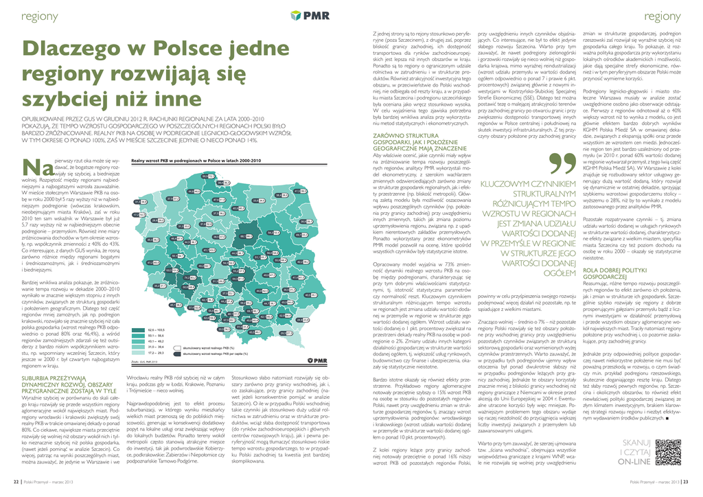 regiony regiony Dlaczego w Polsce jedne regiony rozwijają się szybciej niż inne Opublikowane przez GUS w grudniu 2012 r. rachunki regionalne za lata 2000–2010 pokazują, że tempo wzrostu gospodarczego w poszczególnych regionach Polski było bardzo zróżnicowane. Realny PKB na osobę w podregionie legnicko-głogowskim wzrósł w tym okresie o ponad 100%, zaś w mieście Szczecinie jedynie o nieco ponad 14%. Zarówno struktura gospodarki, jak i położenie geograficzne mają znaczenie Aby właściwie ocenić, jakie czynniki miały wpływ na zróżnicowanie tempa rozwoju poszczególnych regionów, analitycy PMR wykorzystali model ekonometryczny, z szerokim wachlarzem zmiennych odzwierciedlających zarówno zmiany w strukturze gospodarek regionalnych, jak i efekty przestrzenne (np. bliskość metropolii). Główną zaletą modelu była możliwość oszacowania wpływu poszczególnych czynników (np. położenia przy granicy zachodniej) przy uwzględnieniu innych zmiennych, takich jak zmiana poziomu uprzemysłowienia regionu, związana np. z upadkiem nierentownych zakładów przemysłowych. Ponadto wykorzystany przez ekonometryków PMR model pozwolił na ocenę, które spośród wszystkich czynników były statystycznie istotne. Na pierwszy rzut oka może się wydawać, że bogatsze regiony rozwijały się szybciej, a biedniejsze wolniej. Rozpiętość między regionami najbiedniejszymi a najbogatszymi wzrosła zauważalnie. W mieście stołecznym Warszawie PKB na osobę w roku 2000 był 5 razy wyższy niż w najbiedniejszym podregionie (wówczas krakowskim, nieobejmującym miasta Kraków), zaś w roku 2010 ten sam wskaźnik w Warszawie był już 5,7 razy wyższy niż w najbiedniejszym obecnie podregionie – przemyskim. Również inne miary zróżnicowania dochodów w tym okresie wzrosły, np. współczynnik zmienności z 40% do 43%. Co interesujące, z danych GUS wynika, że rosną zarówno różnice między regionami bogatymi i średniozamożnymi, jak i średniozamożnymi i biedniejszymi. Opracowany model wyjaśnia w 73% zmienność dynamiki realnego wzrostu PKB na osobę między podregionami, charakteryzując się przy tym dobrymi właściwościami statystycznymi, tj. istotność statystyczna parametrów czy normalność reszt. Kluczowym czynnikiem strukturalnym różnicującym tempo wzrostu w regionach jest zmiana udziału wartości dodanej w przemyśle w regionie w strukturze jego wartości dodanej ogółem. Wzrost udziału wartości dodanej o 1 pkt. procentowy zwiększał na przestrzeni dekady realny PKB na osobę w podregionie o 2%. Zmiany udziału innych kategorii działalności gospodarczej w strukturze wartości dodanej ogółem, tj. większość usług rynkowych, budownictwo czy finanse i ubezpieczenia, okazały się statystycznie nieistotne. Bardziej wnikliwa analiza pokazuje, że zróżnicowanie tempa rozwoju w dekadzie 2000–2010 wynikało w znacznie większym stopniu z innych czynników, związanych ze strukturą gospodarki i położeniem geograficznym. Dlatego też część regionów mniej zamożnych, jak np. podregion krakowski, rozwijało się znacznie szybciej niż cała polska gospodarka (wzrost realnego PKB odpowiednio o ponad 80% oraz 46,4%), a wśród regionów zamożniejszych zdarzali się też outsiderzy z bardzo niskim współczynnikiem wzrostu, np. wspomniany wcześniej Szczecin, który jeszcze w 2000 r. był czwartym najbogatszym regionem w kraju. Suburbia przeżywają dynamiczny rozwój, obszary przygraniczne zostają w tyle Wrocławiu realny PKB rósł szybciej niż w całym kraju, podczas gdy w Łodzi, Krakowie, Poznaniu i Trójmieście – nieco wolniej. Wyraźnie szybciej w porównaniu do skali całego kraju rozwijały się przede wszystkim regiony aglomeracyjne wokół największych miast. Podregiony wrocławski i krakowski zwiększyły swój realny PKB w trakcie omawianej dekady o ponad 80%. Co ciekawe, największe miasta przeciętnie rozwijały się wolniej niż obszary wokół nich i tylko nieznacznie szybciej niż polska gospodarka, (nawet jeżeli pominąć w analizie Szczecin). Co więcej, patrząc na wyniki poszczególnych miast, można zauważyć, że jedynie w Warszawie i we Najprawdopodobniej jest to efekt procesu suburbanizacji, w którego wyniku mieszkańcy wielkich miast przenoszą się do pobliskich miejscowości, generując w konsekwencji dodatkowy popyt na lokalne usługi oraz zwiększając wpływy do lokalnych budżetów. Ponadto tereny wokół metropolii często stanowią atrakcyjne miejsce do inwestycji, tak jak podwrocławskie Kobierzyce, podkrakowskie: Zabierzów i Niepołomice czy podpoznańskie Tarnowo Podgórne. 22 | Polski Przemysł – marzec 2013 Z jednej strony są to rejony stosunkowo peryferyjne (poza Szczecinem), z drugiej zaś, poprzez bliskość granicy zachodniej, ich dostępność transportowa dla rynków zachodnioeuropejskich jest lepsza niż innych obszarów w kraju. Ponadto są to regiony o ograniczonym udziale rolnictwa w zatrudnieniu i w strukturze produktów. Również atrakcyjność inwestycyjna tego obszaru, w przeciwieństwie do Polski wschodniej, nie odbiegała od reszty kraju, a w przypadku miasta Szczecina i podregionu szczecińskiego była oceniana jako wręcz stosunkowo wysoka. W celu wyjaśnienia tego zjawiska potrzebna była bardziej wnikliwa analiza przy wykorzystaniu metod statystycznych i ekonometrycznych. Stosunkowo słabo natomiast rozwijały się obszary zarówno przy granicy wschodniej, jak i, co zaskakujące, przy granicy zachodniej (nawet jeżeli konsekwentnie pomijać w analizie Szczecin). O ile w przypadku Polski wschodniej takie czynniki jak stosunkowo duży udział rolnictwa w zatrudnieniu oraz w strukturze produktów, wciąż słaba dostępność transportowa (do rynków zachodnioeuropejskich i głównych centrów rozwojowych kraju), jak i pewna peryferyjność mogą tłumaczyć stosunkowo niskie tempo wzrostu gospodarczego, to w przypadku Polski zachodniej ta kwestia jest bardziej skom