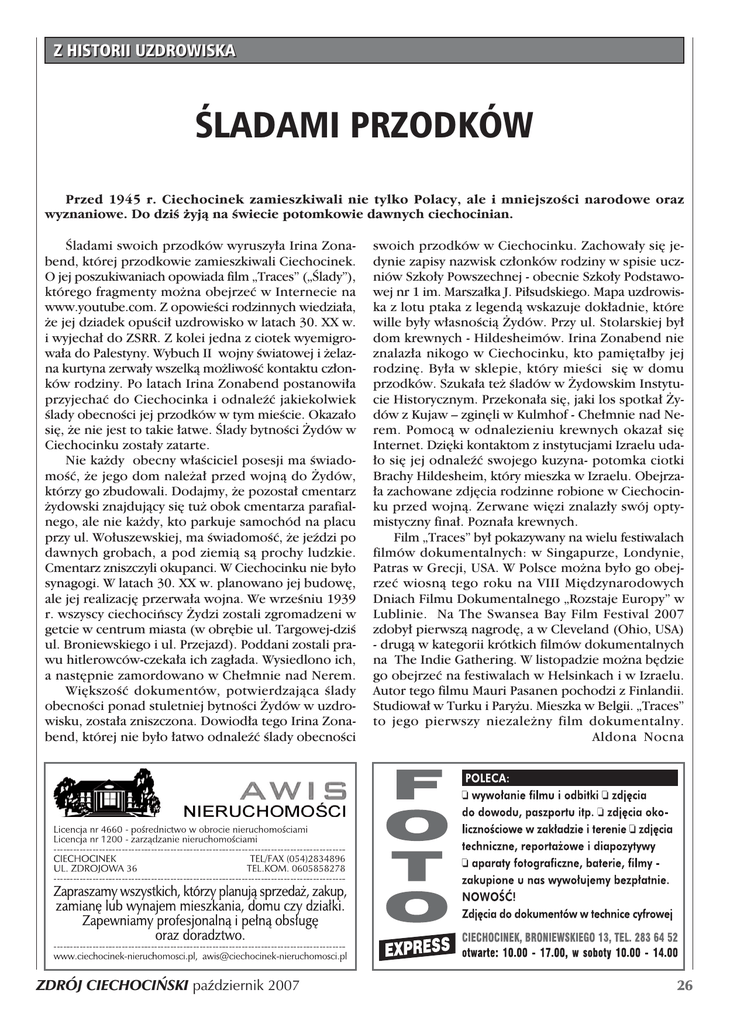 Z HISTORII UZDROWISKA ÂLADAMI PRZODKÓW Przed 1945 r. Ciechocinek zamieszkiwali nie tylko Polacy, ale i mniejszoÊci narodowe oraz wyznaniowe. Do dziÊ ˝yjà na Êwiecie potomkowie dawnych ciechocinian. Âladami swoich przodków wyruszy∏a Irina Zonabend, której przodkowie zamieszkiwali Ciechocinek. O jej poszukiwaniach opowiada film „Traces” („Âlady”), którego fragmenty mo˝na obejrzeç w Internecie na www.youtube.com. Z opowieÊci rodzinnych wiedzia∏a, ˝e jej dziadek opuÊci∏ uzdrowisko w latach 30. XX w. i wyjecha∏ do ZSRR. Z kolei jedna z ciotek wyemigrowa∏a do Palestyny. Wybuch II wojny Êwiatowej i ˝elazna kurtyna zerwa∏y wszelkà mo˝liwoÊç kontaktu cz∏onków rodziny. Po latach Irina Zonabend postanowi∏a przyjechaç do Ciechocinka i odnaleêç jakiekolwiek Êlady obecnoÊci jej przodków w tym mieÊcie. Okaza∏o si´, ˝e nie jest to takie ∏atwe. Âlady bytnoÊci ˚ydów w Ciechocinku zosta∏y zatarte. Nie ka˝dy obecny w∏aÊciciel posesji ma ÊwiadomoÊç, ˝e jego dom nale˝a∏ przed wojnà do ˚ydów, którzy go zbudowali. Dodajmy, ˝e pozosta∏ cmentarz ˝ydowski znajdujàcy si´ tu˝ obok cmentarza parafialnego, ale nie ka˝dy, kto parkuje samochód na placu przy ul. Wo∏uszewskiej, ma ÊwiadomoÊç, ˝e jeêdzi po dawnych grobach, a pod ziemià sà prochy ludzkie. Cmentarz zniszczyli okupanci. W Ciechocinku nie by∏o synagogi. W latach 30. XX w. planowano jej budow´, ale jej realizacj´ przerwa∏a wojna. We wrzeÊniu 1939 r. wszyscy ciechociƒscy ˚ydzi zostali zgromadzeni w getcie w centrum miasta (w obr´bie ul. Targowej-dziÊ ul. Broniewskiego i ul. Przejazd). Poddani zostali prawu hitlerowców-czeka∏a ich zag∏ada. Wysiedlono ich, a nast´pnie zamordowano w Che∏mnie nad Nerem. Wi´kszoÊç dokumentów, potwierdzajàca Êlady obecnoÊci ponad stuletniej bytnoÊci ˚ydów w uzdrowisku, zosta∏a zniszczona. Dowiod∏a tego Irina Zonabend, której nie by∏o ∏atwo odnaleêç Êlady obecnoÊci ZDRÓJ CIECHOCI¡SKI paêdziernik 2007 swoich przodków w Ciechocinku. Zachowa∏y si´ jedynie zapisy nazwisk cz∏onków rodziny w spisie uczniów Szko∏y Powszechnej - obecnie Szko∏y Podstawowej nr 1 im. Marsza∏ka J. Pi∏sudskiego. Mapa uzdrowiska z lotu ptaka z legendà wskazuje dok∏adnie, które wille by∏y w∏asnoÊcià ˚ydów. Przy ul. Stolarskiej by∏ dom krewnych - Hildesheimów. Irina Zonabend nie znalaz∏a nikogo w Ciechocinku, kto pami´ta∏by jej rodzin´. By∏a w sklepie, który mieÊci si´ w domu przodków. Szuka∏a te˝ Êladów w ˚ydowskim Instytucie Historycznym. Przekona∏a si´, jaki los spotka∏ ˚ydów z Kujaw – zgin´li w Kulmhof - Che∏mnie nad Nerem. Pomocà w odnalezieniu krewnych okaza∏ si´ Internet. Dzi´ki kontaktom z instytucjami Izraelu uda∏o si´ jej odnaleêç swojego kuzyna- potomka ciotki Brachy Hildesheim, który mieszka w Izraelu. Obejrza∏a zachowane zdj´cia rodzinne robione w Ciechocinku przed wojnà. Zerwane wi´zi znalaz∏y swój optymistyczny fina∏. Pozna∏a krewnych. Film „Traces” by∏ pokazywany na wielu festiwalach filmów dokumentalnych: w Singapurze, Londynie, Patras w Grecji, USA. W Polsce mo˝na by∏o go obejrzeç wiosnà tego roku na VIII Mi´dzynarodowych Dniach Filmu Dokumentalnego „Rozstaje Europy” w Lublinie. Na The Swansea Bay Film Festival 2007 zdoby∏ pierwszà nagrod´, a w Cleveland (Ohio, USA) - drugà w kategorii krótkich filmów dokumentalnych na The Indie Gathering. W listopadzie mo˝na b´dzie go obejrzeç na festiwalach w Helsinkach i w Izraelu. Autor tego filmu Mauri Pasanen pochodzi z Finlandii. Studiowa∏ w Turku i Pary˝u. Mieszka w Belgii. „Traces” to jego pierwszy niezale˝ny film dokumentalny. Aldona Nocna 26