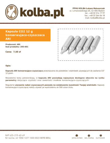 Kapsula CO2 12 g konserwujaco-czyszczaca ARI Producent: ARI Kod produktu: 205-001 Cena: 7,50 zł Opis: Kapsuła ARI konserwująco-czyszcząca przeznaczona do pistoletów i wiatrówek używających do zasilania CO2 12 gram. Niezależne testy potwierdzają, iż kapsuły ARI posiadają najwyższe dostępne obecnie na rynku parametry dotyczące czystości oraz zawartości środków konserwująco-czyszczących! Regularne używanie naboi czyszczących pozwala na zwiększenie żywotność Twojej wiatrówki. Kapsuły konserwująco-czyszczącej należy używać po wystrzeleniu ok 500 sztuk śrutu.