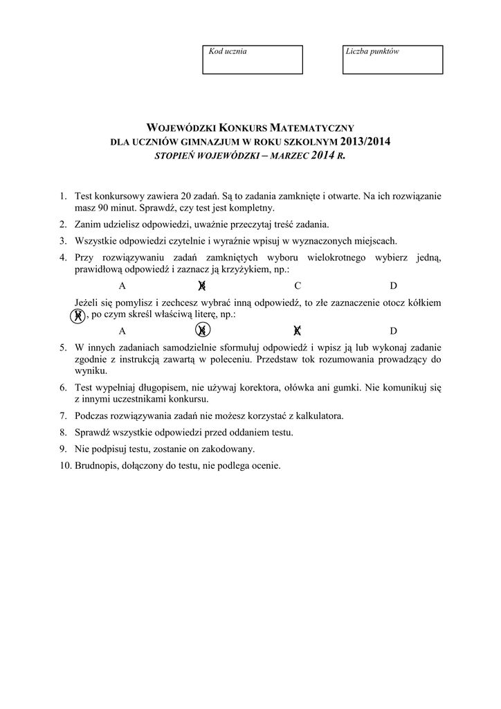 Kod ucznia Liczba punktów WOJEWÓDZKI KONKURS MATEMATYCZNY DLA UCZNIÓW GIMNAZJUM W ROKU SZKOLNYM 2013/2014 STOPIEŃ WOJEWÓDZKI – MARZEC 2014 R. 1. Test konkursowy zawiera 20 zadań. Są to zadania zamknięte i otwarte. Na ich rozwiązanie masz 90 minut. Sprawdź, czy test jest kompletny. 2. Zanim udzielisz odpowiedzi, uważnie przeczytaj treść zadania. 3. Wszystkie odpowiedzi czytelnie i wyraźnie wpisuj w wyznaczonych miejscach. 4. Przy rozwiązywaniu zadań zamkniętych wyboru wielokrotnego wybierz jedną, prawidłową odpowiedź i zaznacz ją krzyżykiem, np.: A XB C D Jeżeli się pomylisz i zechcesz wybrać inną odpowiedź, to złe zaznaczenie otocz kółkiem XB , po czym skreśl właściwą literę, np.: A XB XC D 5. W innych zadaniach samodzielnie sformułuj odpowiedź i wpisz ją lub wykonaj zadanie zgodnie z instrukcją zawartą w poleceniu. Przedstaw tok rozumowania prowadzący do wyniku. 6. Test wypełniaj długopisem, nie używaj korektora, ołówka ani gumki. Nie komunikuj się z innymi uczestnikami konkursu. 7. Podczas rozwiązywania zadań nie możesz korzystać z kalkulatora. 8. Sprawdź wszystkie odpowiedzi przed oddaniem testu. 9. Nie podpisuj testu, zostanie on zakodowany. 10. Brudnopis, dołączony do testu, nie podlega ocenie. WOJEWÓDZKIE KONKURSY PRZEDMIOTOWE 2013/2014 – GIMNAZJUM STOPIEŃ WOJEWÓDZKI Zadanie 1. (0-1) Tomek ma 147 zł, a Sławek ma 57 zł. Ile złotych powinien Tomek dać Sławkowi, aby pozostało mu dwa razy tyle pieniędzy, ile będzie wówczas miał Sławek? A. 11 B. 19 C. 30 D. 45 Zadanie 2. (0-1) Ile trójkątów wyznaczają wierzchołki pięciokąta wypukłego ABCDE? A. 10 B. 9 C. 8 D. 7 Zadanie 3. (0-1) Suma cyfr dodatniej liczby całkowitej a wynosi 30. Wynika z tego, że liczba a jest na pewno podzielna przez A. 2 B. 3 C. 4 D. 5 C. 7 D. 9 Zadanie 4. (0-1) Liczba 234073 w rzędzie jedności ma cyfrę A. 3 B. 4 Zadanie 5. (0-1) Kasia uzyskała średnią z czterech sprawdzianów równą 30 punktów. Ile punktów musi ona uzyskać w kolejnym sprawdzianie, aby średnia z pięciu sprawdzianów była równa 32 punkty? A. 32 B. 34 C. 35 D. 40 Zadanie 6. (0-1) Zbyszek ma 5 sześcianów. Gdy ułoży je od najmniejszego do największego, to wysokości każdych dwóch sąsiednich sześcianów różnią się o 2 cm. Wysokość największego sześcianu jest równa wysokości wieży zbudowanej z dwóch najmniejszych sześcianów. Jaka jest wysokość wieży zbudowanej z wszystkich 5 sześcianów? A. 10 cm B. 30 cm C. 50 cm D. 60 cm Zadanie 7. (0-1) Na spotkaniu pięciu panów P, Q, R, S, T następują powitania. Pan P wita się tylko z jedną osobą, pan Q również z jedną osobą, a każdy z panów R, S, T wita się z dwiema osobami. Wiadomo, że pan P przywitał się z panem T. Które z poniższych powitań na pewno nie miało miejsca? A. T z S B. T z R C. Q z R D. Q z T Zadanie 8. (0-1) Na rysunku przedstawiono wykres funkcji A. x + 1 B. x + 1 y C. x − 1 D. x − 1 1 1 2z6 x WOJEWÓDZKIE KONKURSY PRZEDMIOTOWE 2013/2014 – GIMNAZJUM STOPIEŃ WOJEWÓDZKI Zadanie 9. (0-1) W pewnym roku w styczniu były 4 poniedziałki i 4 piątki. Jakim dniem tygodnia był 1 stycznia tego roku? A. wtorek B. środa C. czwartek D. sobota Zadanie 10. (0-1) W ciemnej piwnicy jest 20 słoików. Wśród nich jest 8 z dżemem truskawkowym, 7 z dżemem malinowym i 5 z dżemem żurawinowym. Ile co najwyżej słoików można zabrać (po ciemku), aby być pewnym, że w piwnicy pozostaną przynajmniej 4 słoiki jednego rodzaju dżemu i przynajmniej 3 słoiki innego rodzaju dżemu? A. 5 B. 6 C. 7 D. 8 Zadanie 11. (0-1) Spośród krawędzi sześcianu wybieramy takie cztery krawędzie, że żadne dwie z nich nie mają wspólnych wierzchołków. Ile jest takich czwórek? A. 8 B. 9 C. 12 D. 18 Zadanie 12. (0-1) Ile różnych trójkątów równoramiennych o polu równym 1 ma bok długości 2? A. 0 B. 1 C. 2 D. 3 Zadanie 13. (0-1) Długość przekątnej prostokąta przedstawionego na rysunku, którego krótszy bok ma długość 12 cm jest równa A. 24 B. 20 C. 16 D. 12 120 Zadanie 14. (0-1) Czy kulę o objętości 500 cm3 można przełożyć przez otwór w kształcie kwadratu o boku 10 cm? A. Tak, ponieważ średnica kuli jest mniejsza od przekątnej kwadratu. B. Tak, ponieważ średnica kuli jest mniejsza od boku kwadratu. C. Nie, ponieważ średnica kuli jest większa od przekątnej kwadratu. D. Nie, ponieważ średnica kuli jest większa od boku kwadratu. Zadanie 15. (0-1) Dwa okręgi o promieniach 13 i 15 przecinają się w dwóch punktach. Cięciwa łącząca te punkty ma długość 24. Która z poniższych liczb może wyrażać odległość środków tych okręgów przy pewnym ich położeniu? A. 13 B. 14 C. 15 3z6 D. 18 WOJEWÓDZKIE KONKURSY PRZEDMIOTOWE 2013/2014 – GIMNAZJUM STOPIEŃ WOJEWÓDZKI Zadanie 16. (0-1) Każdy bok kwadratu powiększono o 20%. Wynika z tego, że pole tego kwadratu zwiększyło się o A. 20% B. 22% C. 40% D. 44% Zadanie 17. (0-1) Dwa litry soku owocowego o zawartości 10% cukru zmieszano z trzema litrami innego soku owocowego o zawartości 15% cukru. Jaka jest zawartość cukru w otrzymanej mieszaninie? A. 5% B. 13% C. 12,5% D. 25% Zadanie 18. (0-3) W równoległoboku ABCD bok AB jest dwa razy dłuższy od boku BC. Punkt M dzielący bok AB na połowy połączono z wierzchołkami C i D. Wykaż, że kąt CMD jest prosty. Zadanie 19. (0-4) Pierwszą część trasy samolot przeleciał z prędkością 720 o 320 km, z prędkością 1000 800 km , a pozostałą część trasy, krótszą h km . Średnia prędkość samolotu na całej trasie była równa h km . Oblicz długość trasy, jaką przeleciał samolot. h 4z6 WOJEWÓDZKIE KONKURSY PRZEDMIOTOWE 2013/2014 – GIMNAZJUM STOPIEŃ WOJEWÓDZKI Zadanie 20. (0-4) W sześcianie poprowadzono przekątne ścian w taki sposób, że powstał ostrosłup (patrz rysunek). Oblicz objętość tego ostrosłupa, jeżeli krawędź sześcianu ma długość a. a a a 5z6 WOJEWÓDZKIE KONKURSY PRZEDMIOTOWE 2013/2014 