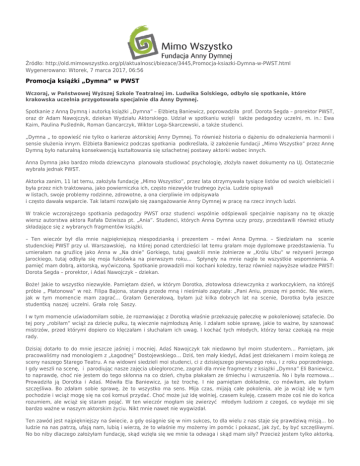 Źródło: http://old.mimowszystko.org/pl/aktualnosci/biezace/3445,Promocja-ksiazki-Dymna-w-PWST.html Wygenerowano: Wtorek, 7 marca 2017, 06:56 Promocja książki „Dymna” w PWST Wczoraj, w Państwowej Wyższej Szkole Teatralnej im. Ludwika Solskiego, odbyło się spotkanie, które krakowska uczelnia przygotowała specjalnie dla Anny Dymnej. Spotkanie z Anną Dymną i autorką książki „Dymna” – Elżbietą Baniewicz, poprowadziła prof. Dorota Segda – prorektor PWST, oraz dr Adam Nawojczyk, dziekan Wydziału Aktorskiego. Udział w spotkaniu wzięli także pedagodzy uczelni, m. in.: Ewa Kaim, Paulina Puślednik, Roman Gancarczyk, Wiktor Loga-Skarczewski, a także studenci. „Dymna „ to opowieść nie tylko o karierze aktorskiej Anny Dymnej. To również historia o dążeniu do odnalezienia harmonii i sensie służenia innym. Elżbieta Baniewicz podczas spotkania podkreślała, iż założenie fundacji „Mimo Wszystko” przez Annę Dymną było naturalną konsekwencją kształtowania się szlachetnej postawy aktorki wobec innych. Anna Dymna jako bardzo młoda dziewczyna planowała studiować psychologię, złożyła nawet dokumenty na UJ. Ostatecznie wybrała jednak PWST. Aktorka zanim, 11 lat temu, założyła fundację „Mimo Wszystko”, przez lata otrzymywała tysiące listów od swoich wielbicieli i była przez nich traktowana, jako powierniczka ich, często niezwykle trudnego życia. Ludzie opisywali w listach, swoje problemy rodzinne, zdrowotne, a ona cierpliwie im odpisywała i często dawała wsparcie. Tak latami rozwijało się zaangażowanie Anny Dymnej w pracę na rzecz innych ludzi. W trakcie wczorajszego spotkania pedagodzy PWST oraz studenci wspólnie odśpiewali specjalnie napisany na tę okazję wiersz autorstwa aktora Rafała Dziwisza pt. „Ania”. Studenci, których Anna Dymna uczy prozy, przedstawili również etiudy składające się z wybranych fragmentów książki. – Ten wieczór był dla mnie najpiękniejszą niespodzianką i prezentem – mówi Anna Dymna. – Siedziałam na scenie studenckiej PWST przy ul. Warszawskiej, na której ponad czterdzieści lat temu grałam moje dyplomowe przedstawienia. Tu umierałam na gruźlicę jako Anna w „Na dnie” Gorkiego, tutaj gwałcili mnie żołnierze w „Królu Ubu” w reżyserii Jerzego Jarockiego, tutaj odbyła się moja fuksówka na pierwszym roku… Spłynęły na mnie nagle te wszystkie wspomnienia. A pamięć mam dobrą, aktorską, wyćwiczoną. Spotkanie prowadzili moi kochani koledzy, teraz również najwyższe władze PWST: Dorota Segda – prorektor, i Adaś Nawojczyk – dziekan. Boże! Jakie to wszystko niezwykłe. Pamiętam dzień, w którym Dorotka, złotowłosa dziewczynka z warkoczykiem, na którejś próbie „ Płatonowa” w reż. Filipa Bajona, stanęła przede mną i nieśmiało zapytała: „Pani Aniu, proszę mi pomóc. Nie wiem, jak w tym momencie mam zagrać… Grałam Generałową, byłam już kilka dobrych lat na scenie, Dorotka była jeszcze studentką naszej uczelni. Grała rolę Saszy. I w tym momencie uświadomiłam sobie, że rozmawiając z Dorotką właśnie przekazuję pałeczkę w pokoleniowej sztafecie. Do tej pory „robiłam” wciąż za dziecię pułku, tą wiecznie najmłodszą Anię. I zdałam sobie sprawę, jakie to ważne, by szanować mistrzów, przed którymi dopiero co klęczałam i słuchałam ich uwag. I kochać tych młodych, którzy teraz czekają na moje rady. Dzisiaj dotarło to do mnie jeszcze jaśniej i mocniej. Adaś Nawojczyk tak niedawno był moim studentem… Pamiętam, jak pracowaliśmy nad monologiem z „Łagodnej” Dostojewskiego… Dziś, ten mały kiedyś, Adaś jest dziekanem i moim kolegą ze sceny naszego Starego Teatru. A na widowni siedzieli moi studenci, ci z dzisiejszego pierwszego roku, i z roku poprzedniego. I gdy weszli na scenę, i parodiując nasze zajęcia ubiegłoroczne, zagrali dla mnie fragmenty z książki „Dymna” Eli Baniewicz, to naprawdę, choć nie jestem do tego skłonna na co dzień, chyba płakałam ze śmiechu i wzruszenia. No i była rozmowa… Prowadziła ją Dorotka i Adaś. Mówiła Ela Baniewicz, ja też trochę. I nie pamiętam dokładnie, co mówiłam, ale byłam szczęśliwa. Bo zdałam sobie sprawę, że to wszystko ma sens. Mija czas, mijają całe pokolenia, ale ja wciąż idę w tym pochodzie i wciąż mogę się na coś komuś przydać. Choć może już idę wolniej, czasem kuleję, czasem może coś nie do końca rozumiem, ale wciąż się staram pojąć. W ten wieczór mogłam się zwierzyć młodym ludziom z czegoś, co wydaje mi się bardzo ważne w naszym aktorskim życiu. Nikt mnie nawet nie wygwizdał. Ten zawód jest najpiękniejszy na świecie, a gdy osiągnie się w nim sukces, to dla wielu z nas staje się prawdziwą misją… bo ludzie na nas patrzą, ufają nam, lubią i wierzą, że to właśnie my możemy im pomóc i pokazać, jak żyć, by być szczęśliwymi. No bo niby dlaczego założyłam fundację, skąd wzięła się we mnie ta odwaga i skąd mam siły? Przecież jestem tylko aktorką. Pracowało nade mną wielu mistrzów, reżyserów, aktorów, scenografów, kompozytorów, a teraz moi studenci pomagają mi rozumieć dzisiejszy świat, nawet o tym nie wiedząc. Im zawdzięczam wszystko, dzięki nim jestem kim jestem i mam odwagę robić wiele rzeczy, które mnie często przerastają. Ten zawód daje tyle radości, choć czasem się płacze z wysiłku i zmęczenia… Ale pomaga zrozumieć świat, człowieka. Uczy słuchać i tak przekazywać myśli, by trafić do innych. Uczy tolerancji, pokory, cierpliwości, odpowiedzialności. O tym też mówiliśmy. Ale nie było ani nudno, ani pompatycznie. A gdy moi koledzy artyści ze studentami odśpiewali kantatę Stanisława Radwana i Rafała Dziwisza pt. „Ania”, to … Trudno opisać to uczucie… ale chyba to są momenty, dla których warto żyć. I za nie nawet nie da się podziękować. Tweet Galeria Z Dorotą Segdą An
